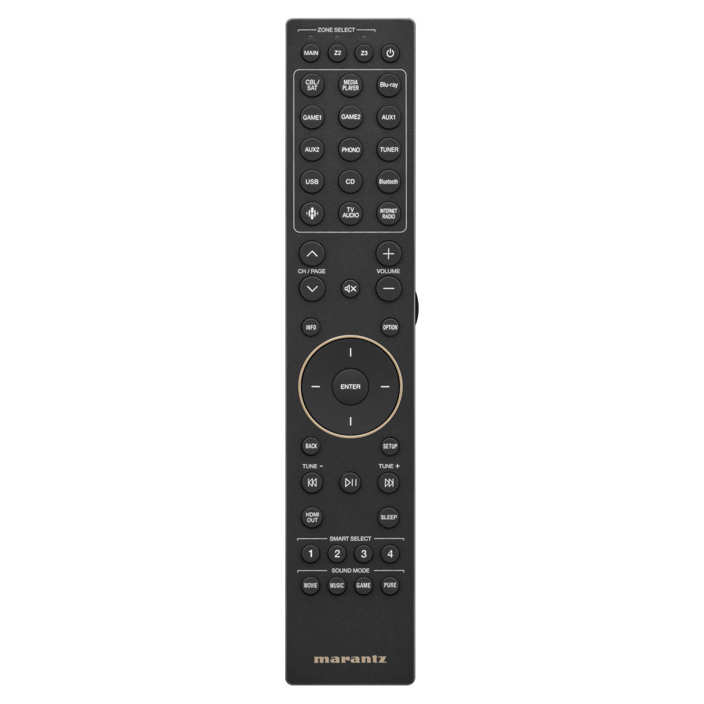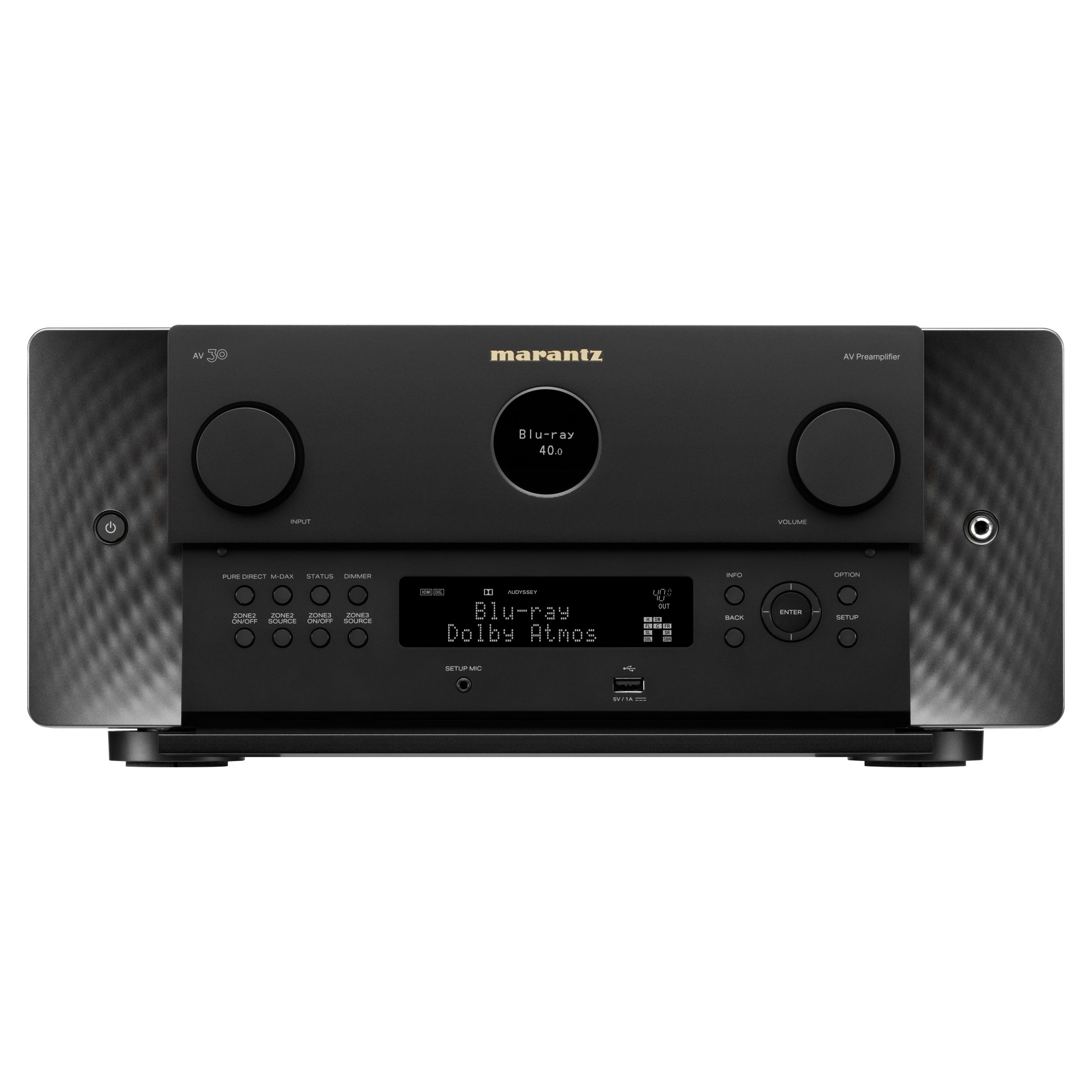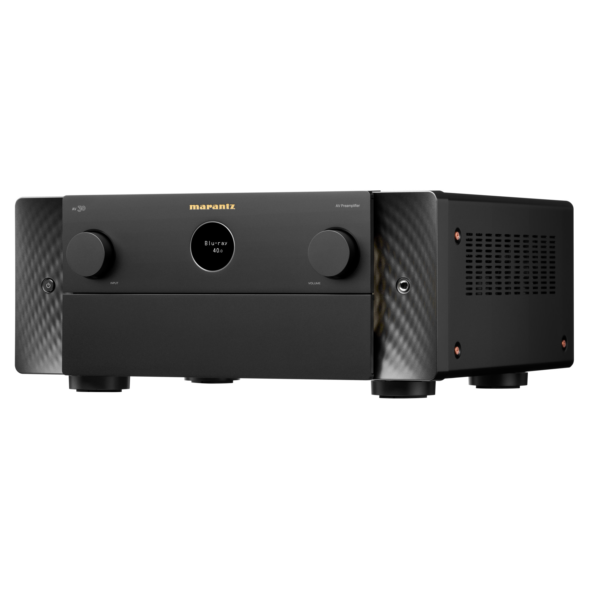 Expression moderne de principes de design intemporels, l'AV 30 arbore le hublot emblématique de Marantz, des matériaux haut de gamme et des éclairages latéraux discrets qui illuminent le panneau avant.