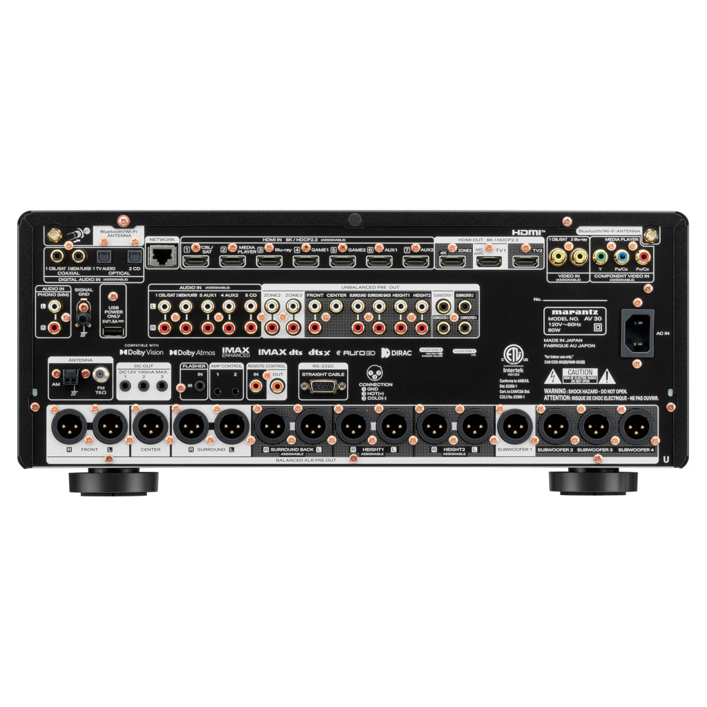 Le préamplificateur AV 30 offre des performances et une polyvalence exceptionnelles pour les grandes salles multimédias et les systèmes home cinéma dédiés. Ce préamplificateur AV symétrique 11,4 canaux intègre des circuits discrets Marantz HDAM et dispose de sept entrées HDMI, toutes compatibles 8K Ultra HD.