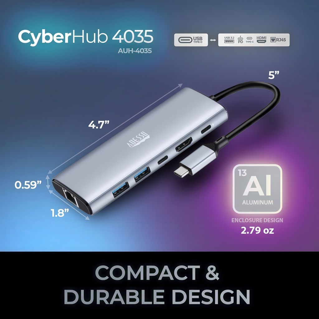 Le CyberHub 4035 est conçu pour résister à une utilisation quotidienne, que ce soit sur la route, à la maison ou au bureau. Son boîtier en aluminium renforcé, associé à un cordon de connexion de haut calibre, garantit une fiabilité durable et des conditions de fonctionnement fraîches pour tous les ports connectés.