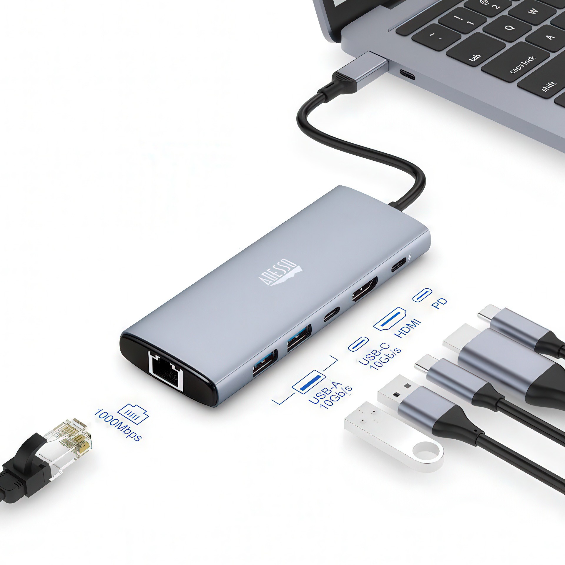 Le CyberHub 4035 fonctionne avec les tablettes et smartphones mobiles populaires équipés d'un port USB-C, vous permettant de les connecter à des périphériques, des écrans et des réseaux filaires tout en chargeant à l'aide de son port d'alimentation USB Type-C avec alimentation pendant vos déplacements.