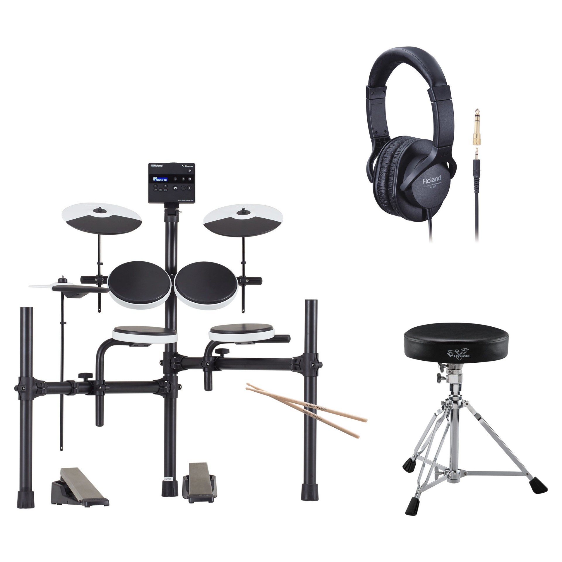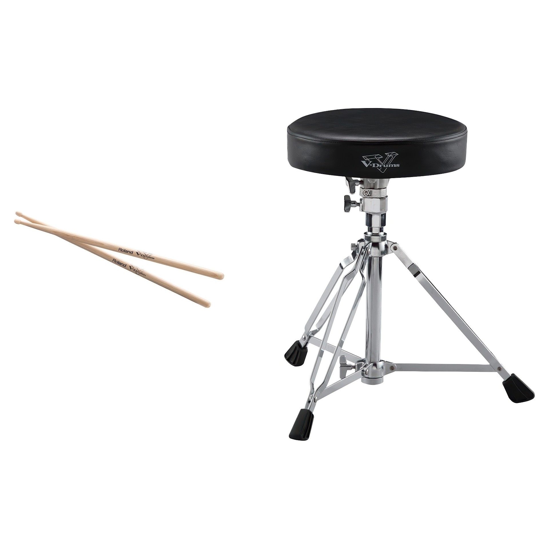 Commencez à jouer de votre nouveau kit V-Drums dès maintenant grâce à cet ensemble d'accessoires pratique. Il comprend une paire de baguettes en hickory de haute qualité avec le logo V-Drums, ainsi qu'un siège de batterie robuste à double renfort qui offrira un soutien confortable pendant des années de sessions de batterie intenses.