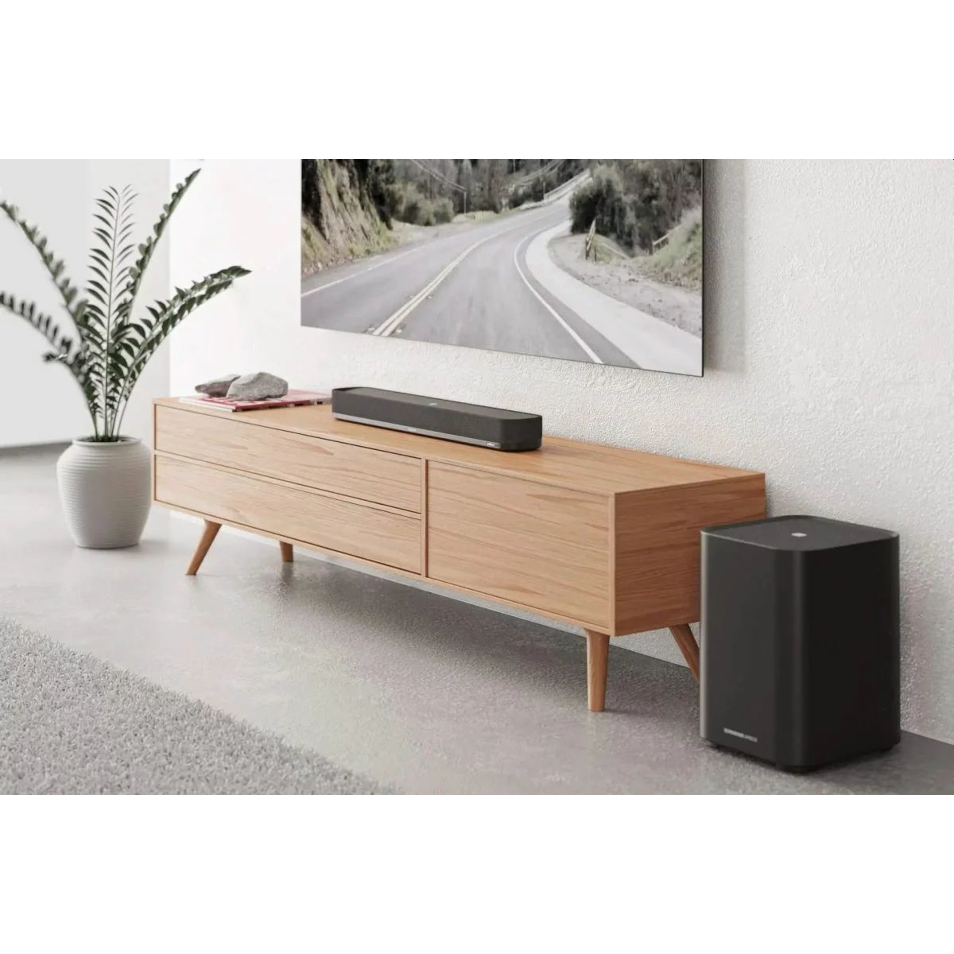 Barre de son extrêmement compacte et élégante qui se fond partout et se glisse entre les supports de téléviseur. Qualité de construction incroyable et design minimaliste non intrusif, mais très attrayant.