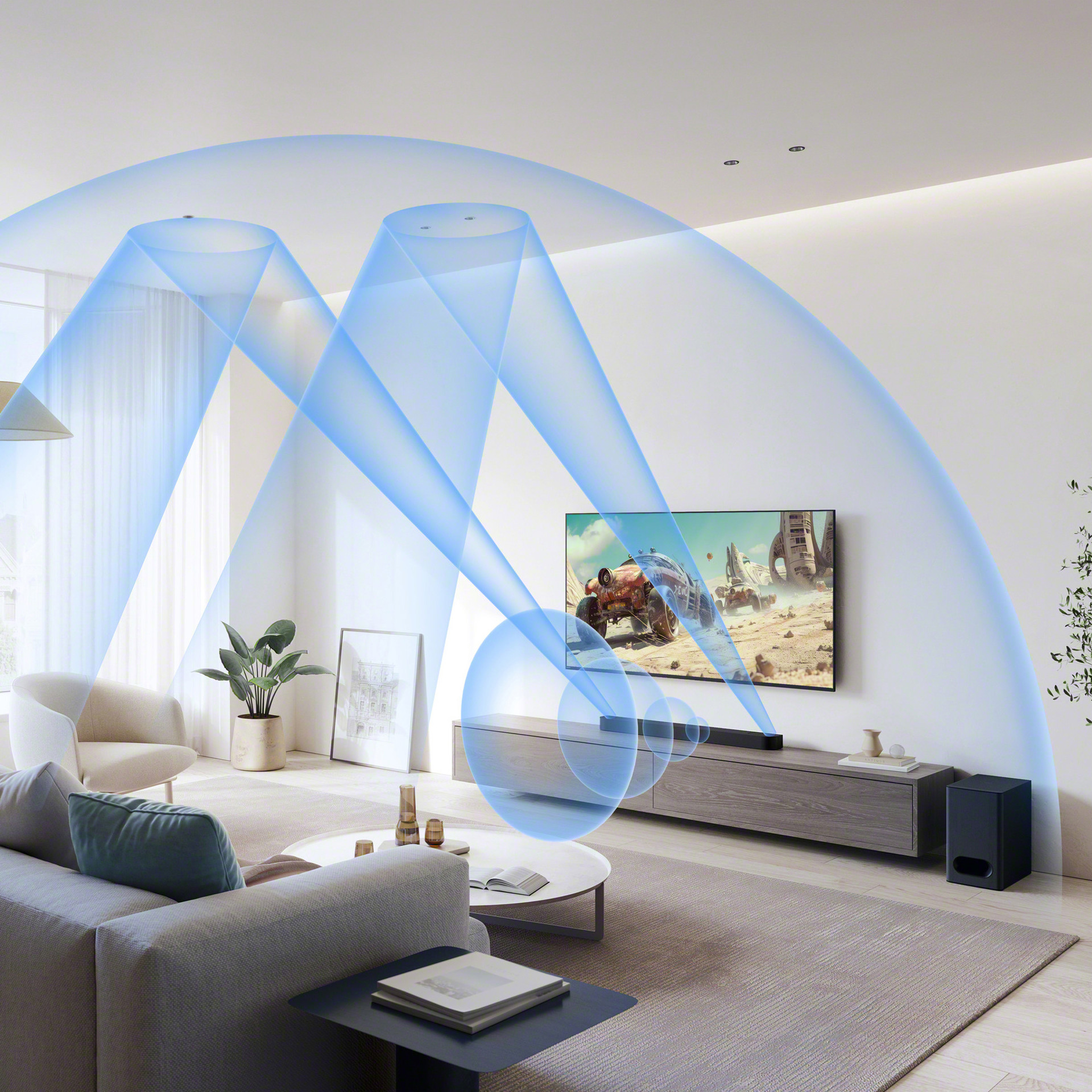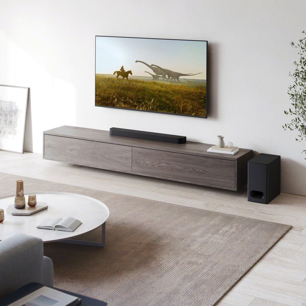 En utilisant uniquement des haut-parleurs avant, la technologie de traitement du champ sonore numérique de Sony reproduit virtuellement le champ sonore ambiophonique, avec un son qui vous parvient des deux côtés. Vous pouvez profiter d’un son ambiophonique cinématographique et riche sans encombrer votre espace de vie.