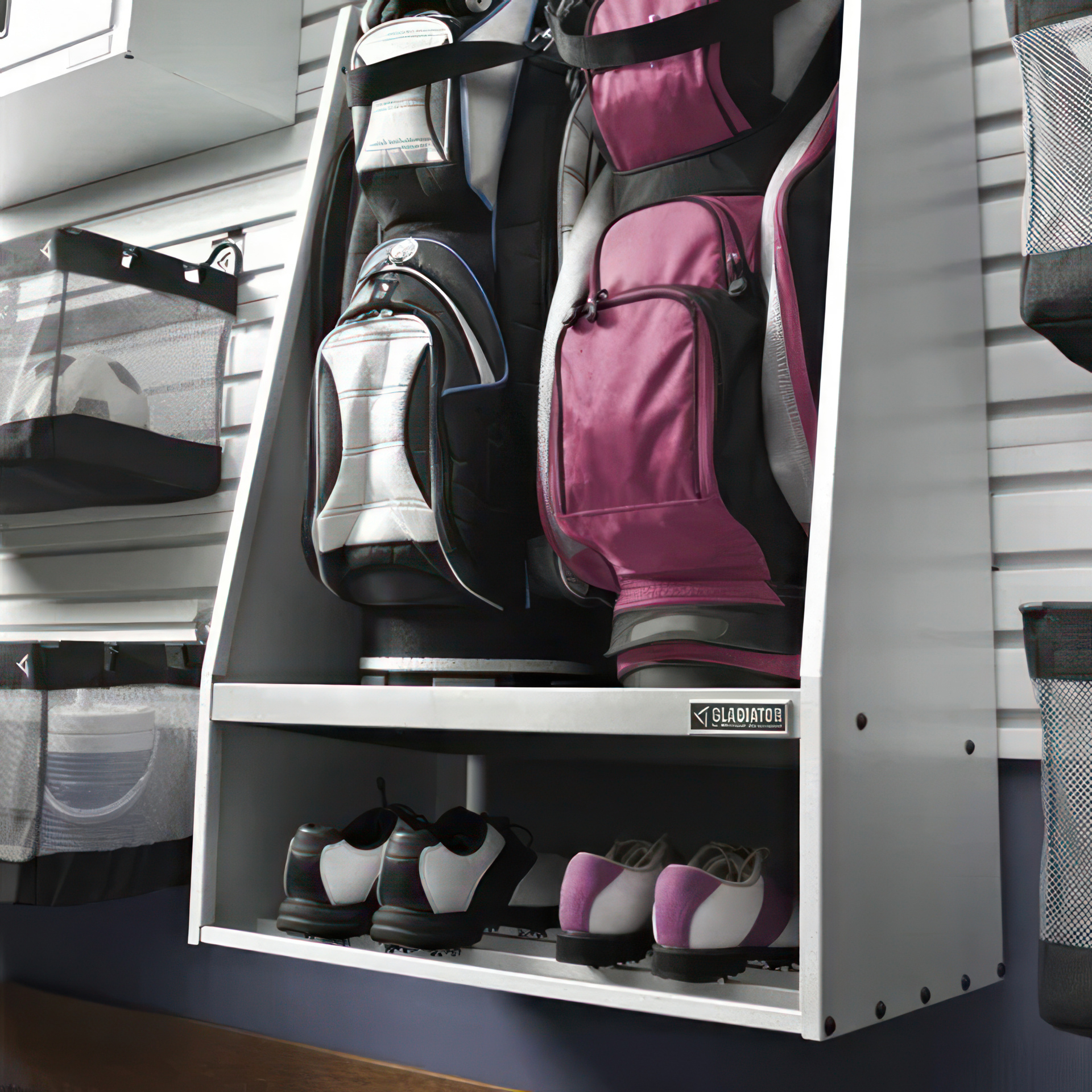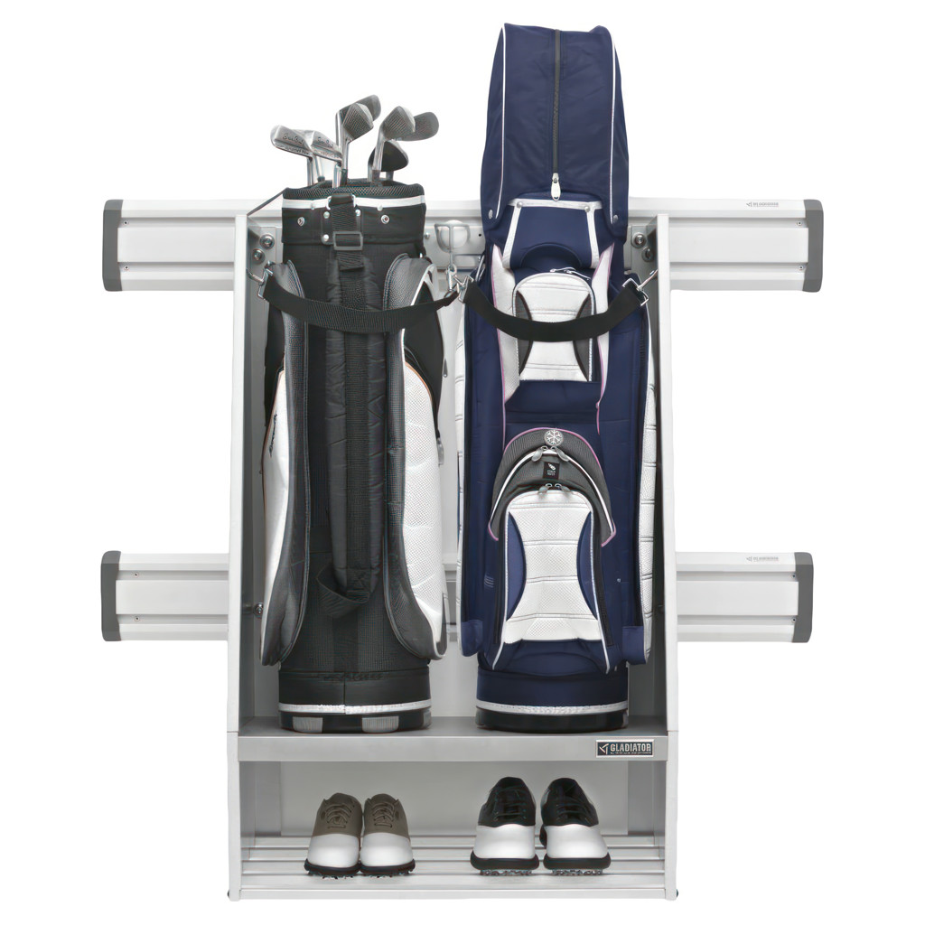 Il est facile de ranger les sacs de golfs avec la boîte de rangement d'articles de golf Gladiator. Cette boîte de rangement procure suffisamment d'espace pour deux grands sacs de golf et du rangement supplémentaire pour les balles de golf. Une tablette inférieure vous permet de ranger vos chaussures de golf avec le reste de vos affaires. Conçue pour être utilisée sur les canaux GearTrack et panneaux GearWall, elle s'accroche puis se repositionne facilement au besoin.