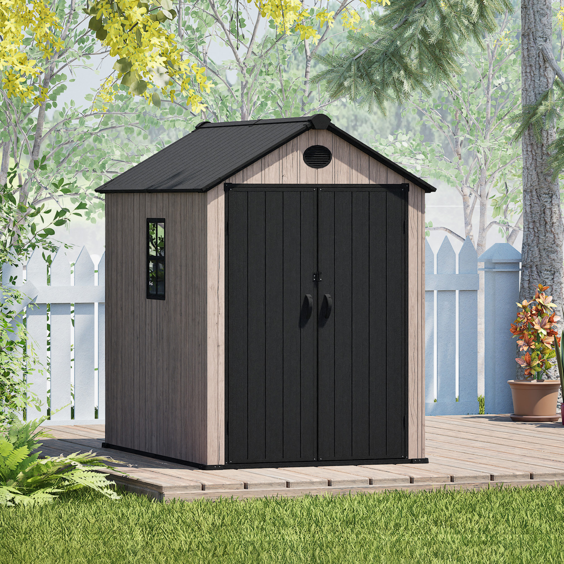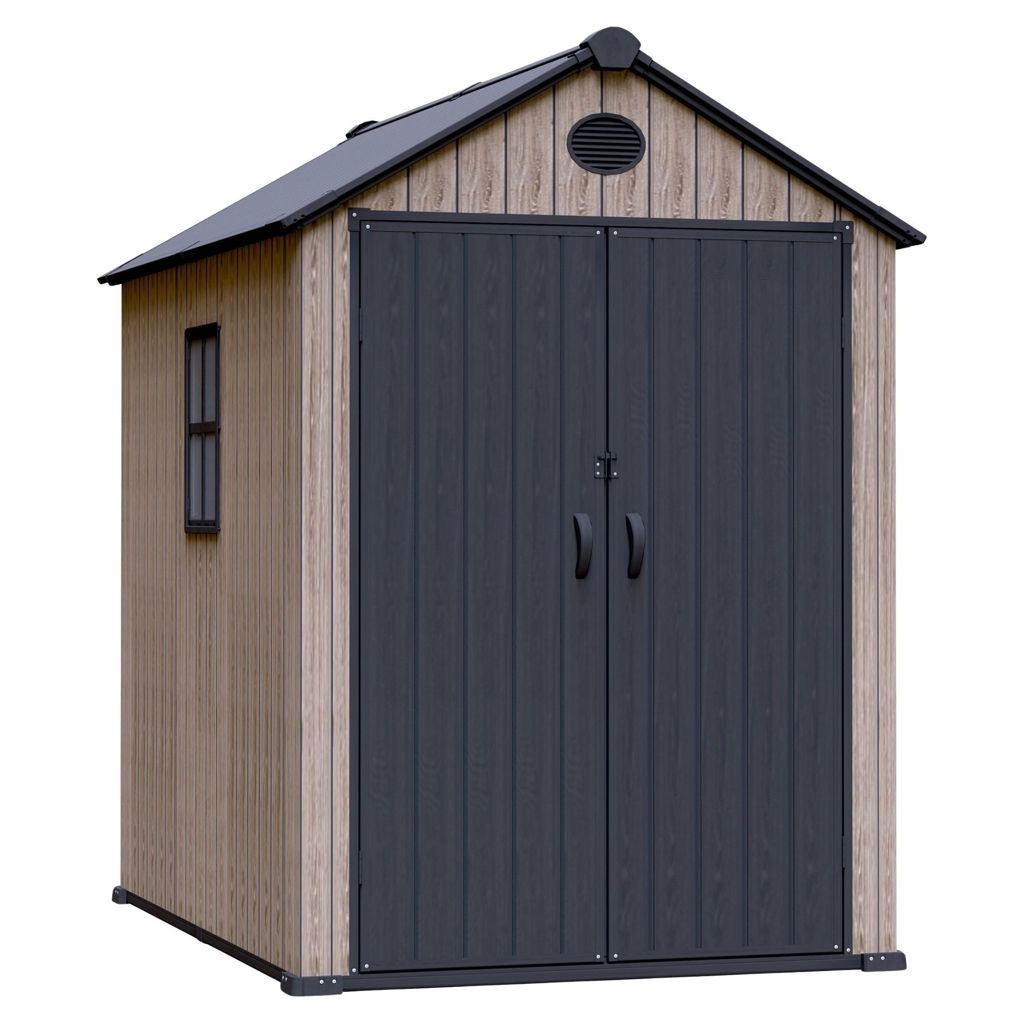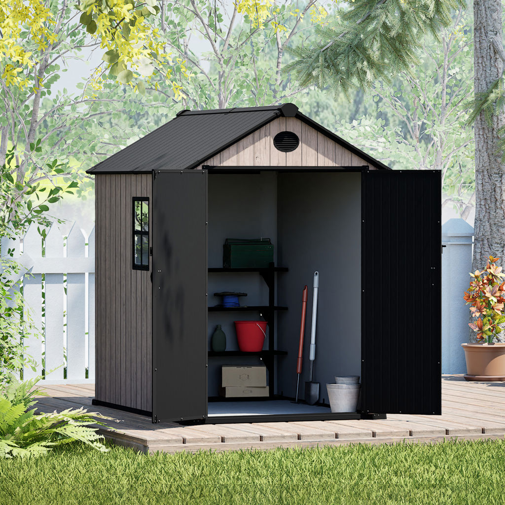 Le plancher renforcé en résine supporte les objets lourds, tandis que le toit à pignon élevé avec évent assure une bonne circulation d'air et un dégagement optimal.