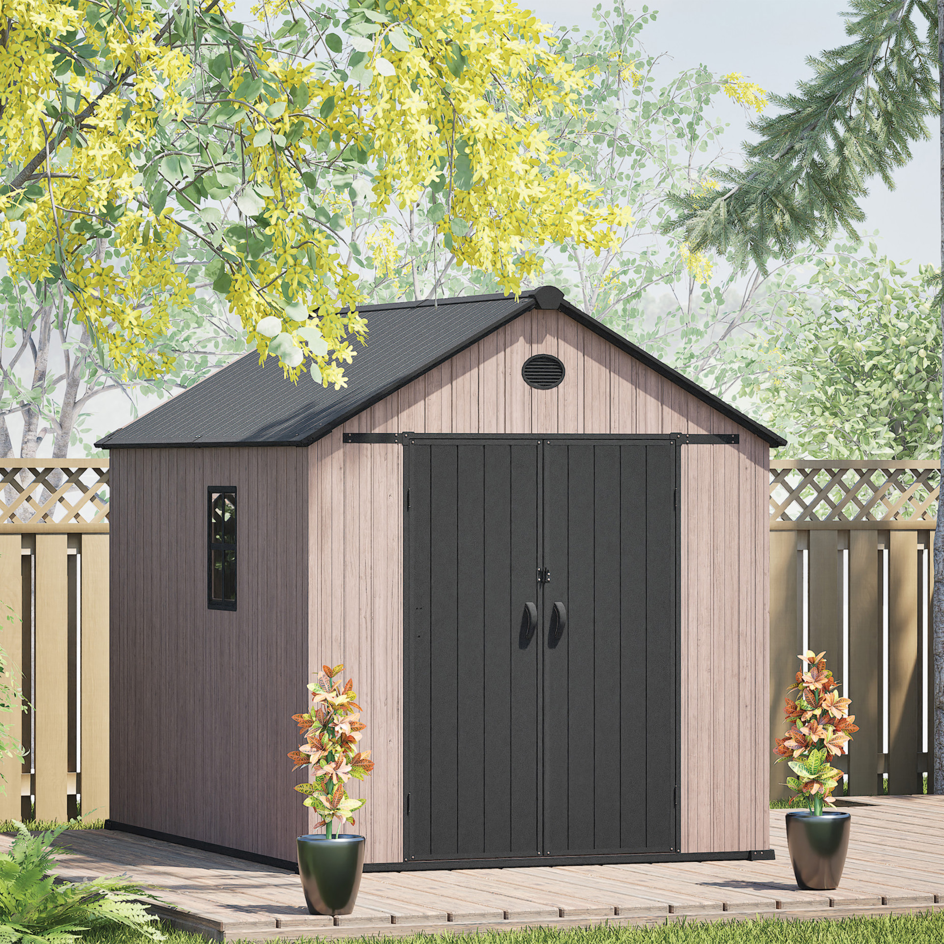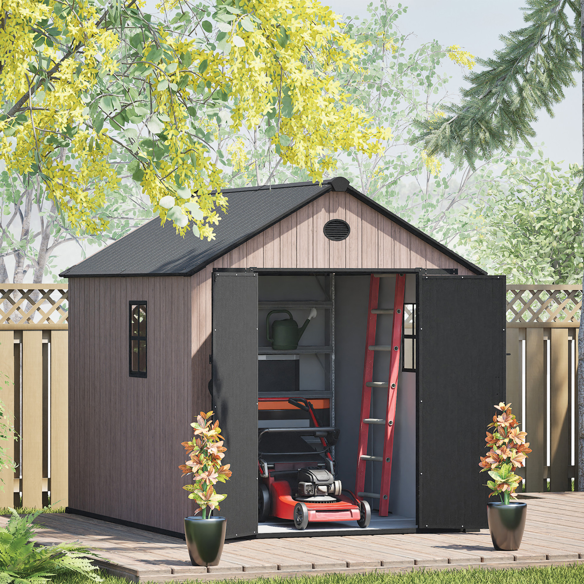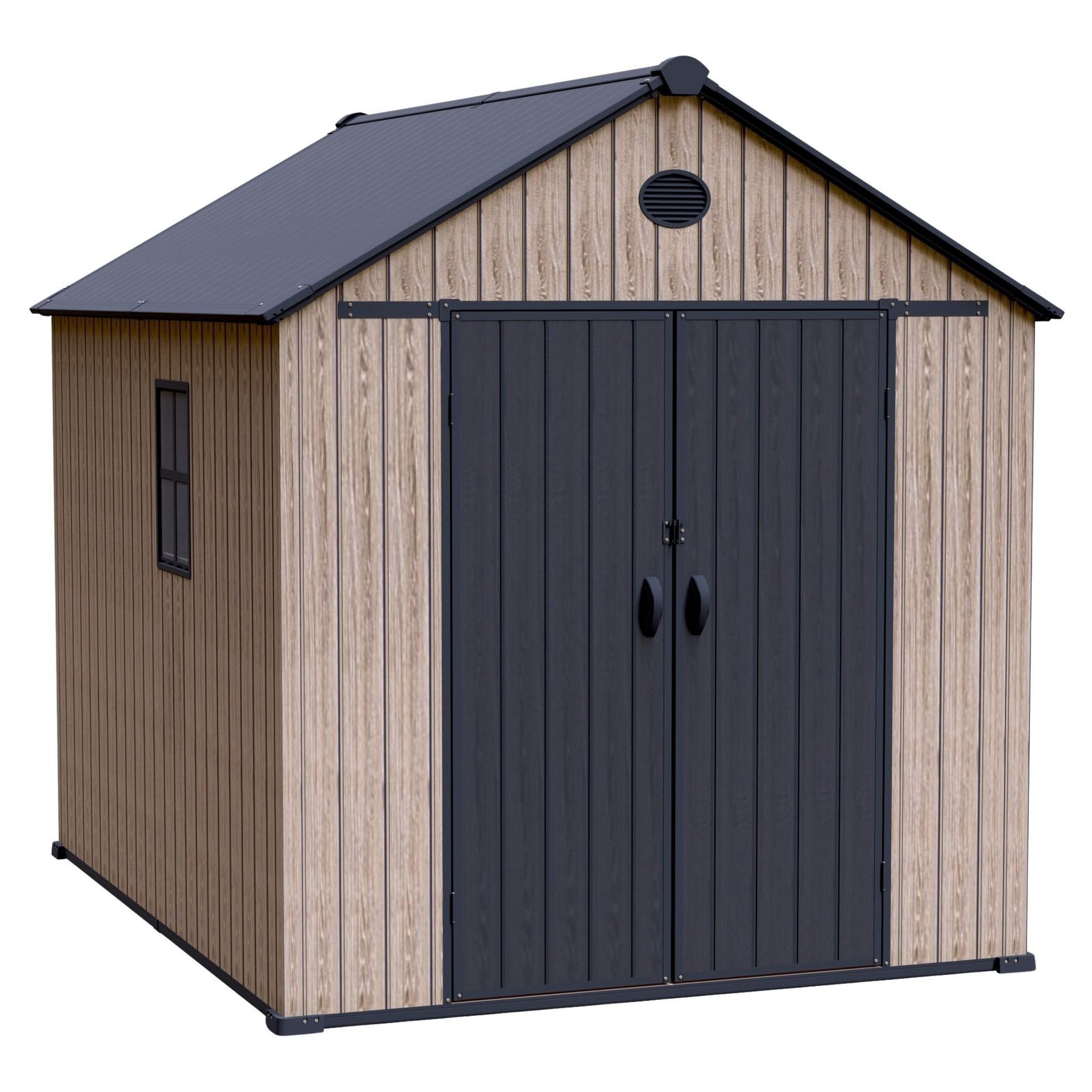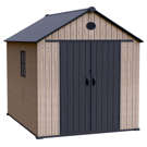 Le plancher renforcé en résine supporte les objets lourds, tandis que le toit à pignon élevé avec évent garantit une bonne circulation d'air ainsi qu'un dégagement optimal.