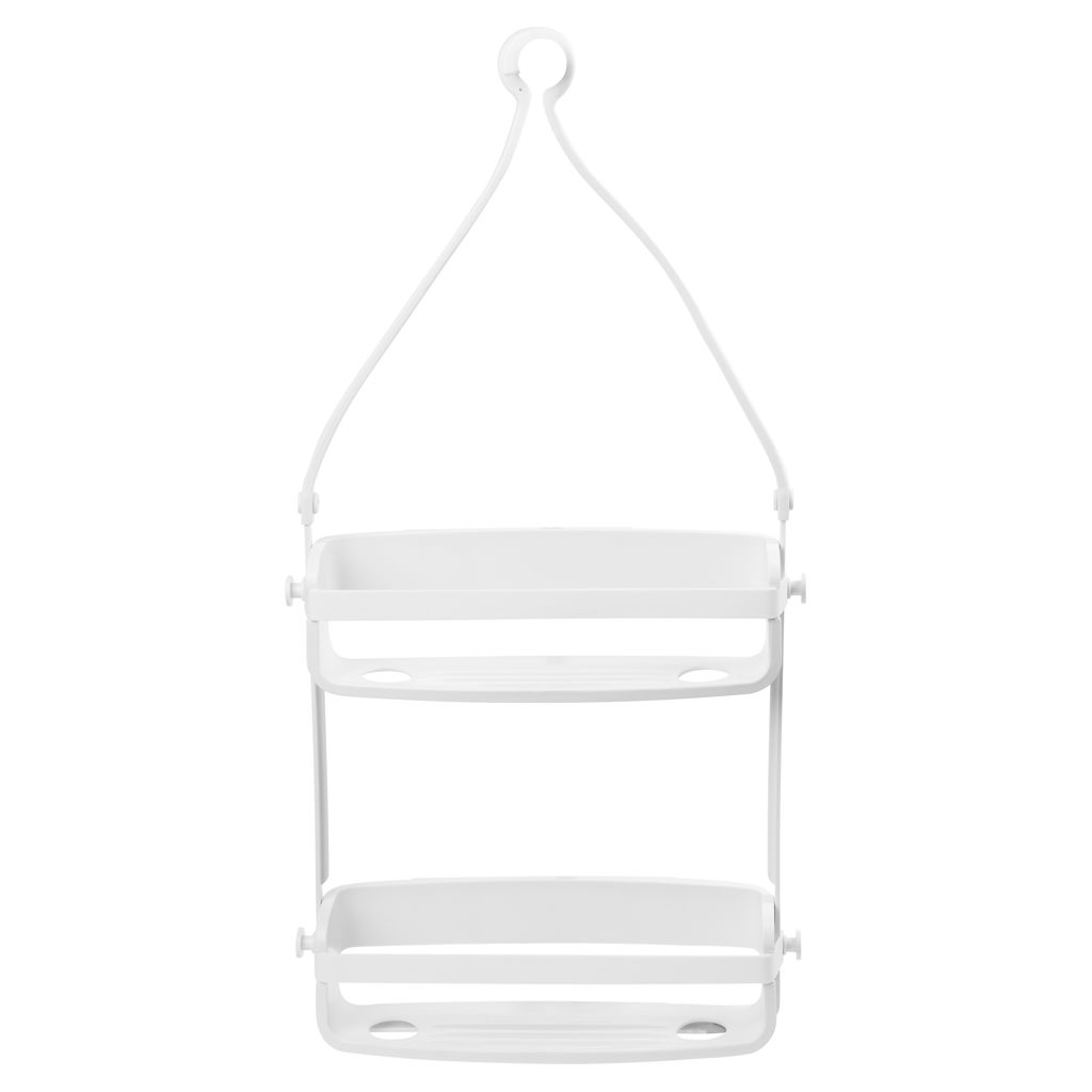Flex dispose également de deux étagères en plastique extra larges pour accueillir tous vos shampoings, revitalisants et nettoyants pour le corps, tandis que les quatre crochets sont parfaits pour les luffa et le rangement des rasoirs. Utilisez les quatre "colliers de bouteille" pour maintenir vos bouteilles de bas en haut, ce qui permet de distribuer chaque goutte, tout en maintenant votre bouteille en place. Pas besoin de vous soucier de l'humidité ou de l'accumulation de produit car Flex dispose d'un système de drainage intégré qui empêche la moisissure indésirable. Flex peut être monté au-dessus de la pomme de douche ou sur la tringle du rideau de douche.