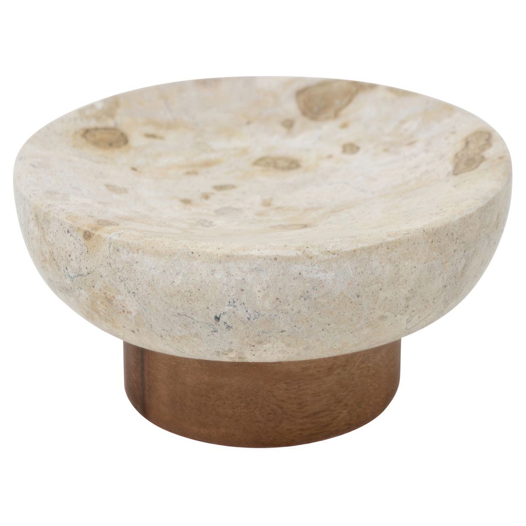 Ce porte-savon à l'apparence robuste combine une partie supérieure en marbre avec des tons naturels variés et une base en bois brun, qui ajoute une touche de chaleur à la pièce.