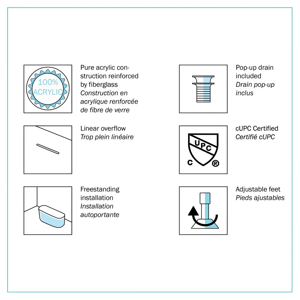 Cette baignoire autonome intègre un design sans joint et une facilité d'utilisation pour une installation autonome. Elle s'adapte aux petits espaces et ajoute du style à votre salle de bains. Débordement linéaire intégré inclus. Facile à nettoyer. Les dossiers confortables en font un complément polyvalent à votre spa d'accueil.