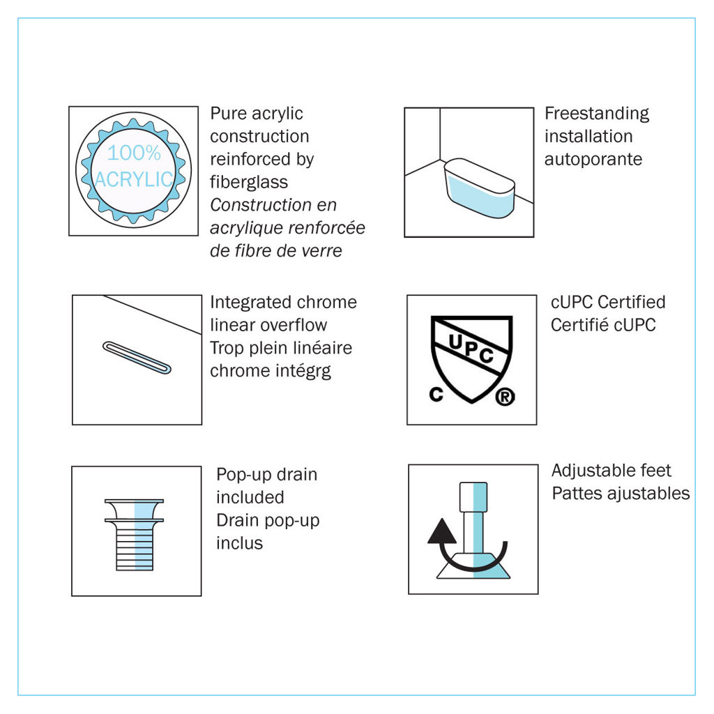 Des pieds de nivellement intégrés et un trop-plein encastré assurent confort et praticité.