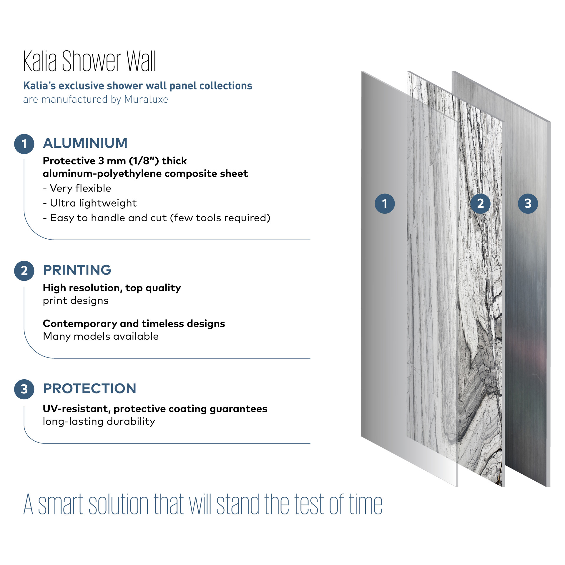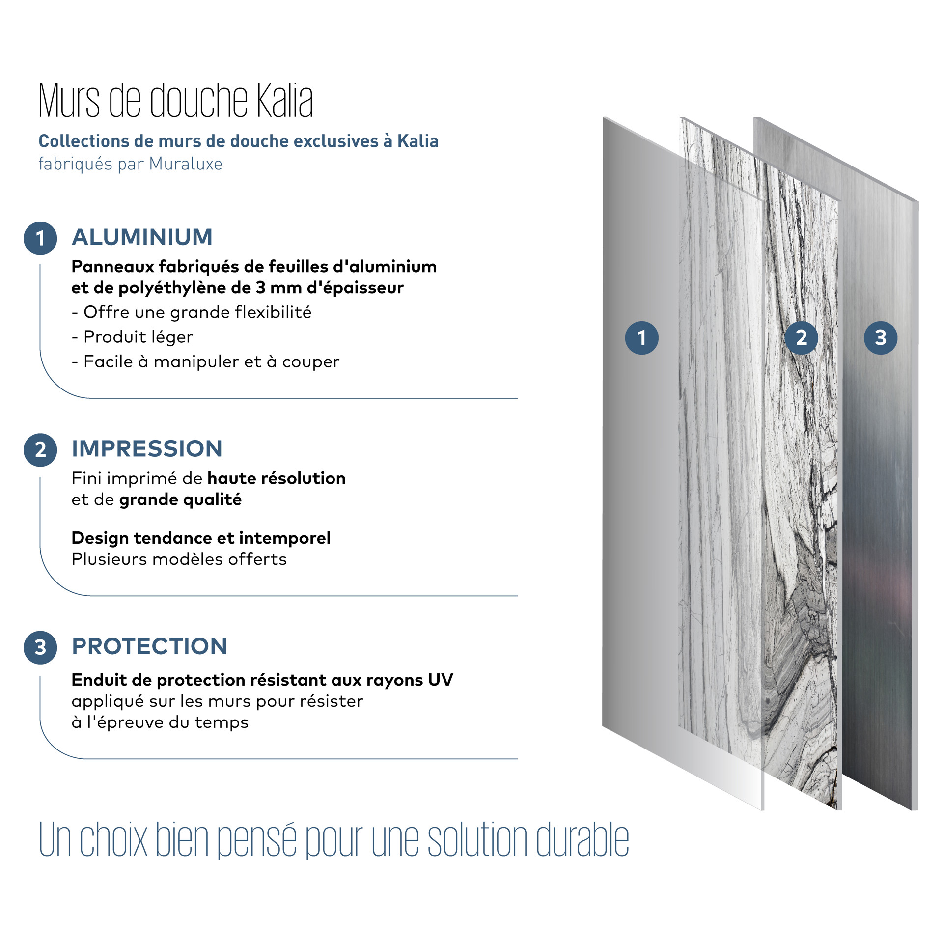 Les collections de murs de douche exclusives à Kalia sont une alternative avantageuse aux méthodes classiques ou autres revêtements de murs. En plus de s'agencer parfaitement avec les portes et bases de Kalia, la gamme propose une variété de design allant des carreaux classiques au look industriel ultramoderne en passant par le fini chic du marbre.