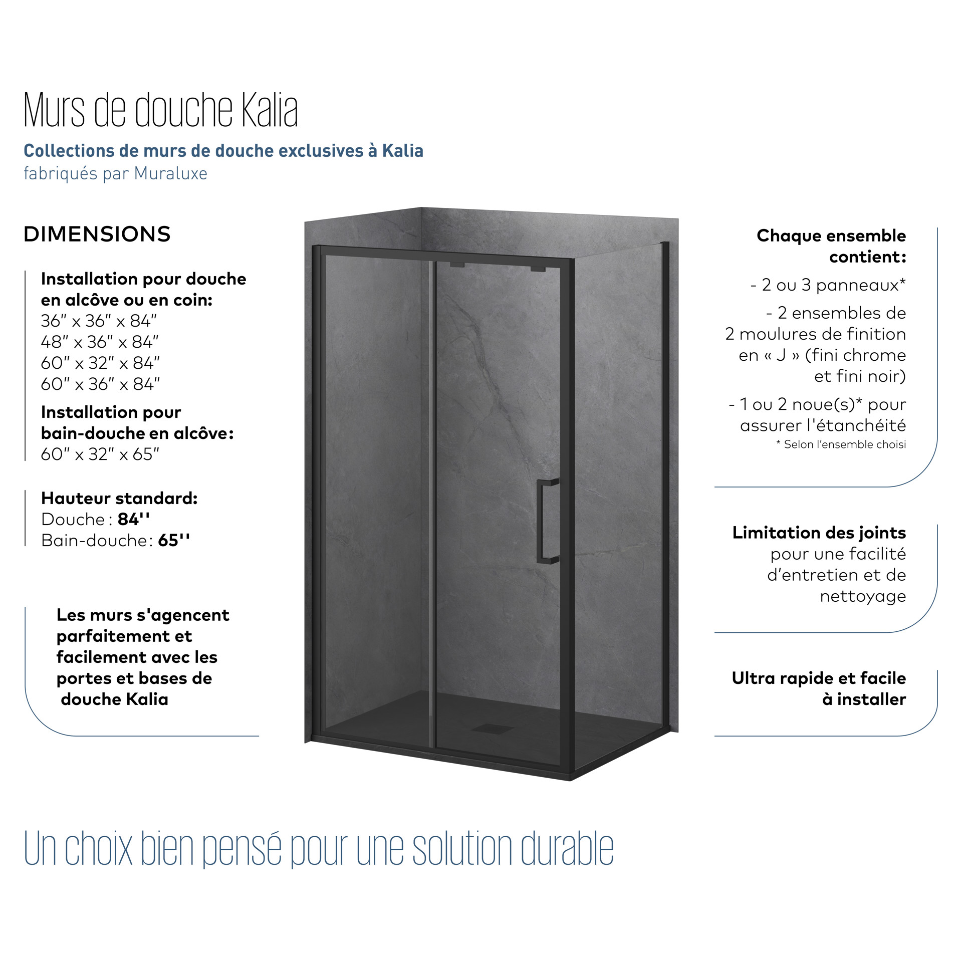 Les collections de murs de douche exclusives à Kalia sont une alternative avantageuse aux méthodes classiques ou autres revêtements de murs. En plus de s'agencer parfaitement avec les portes et bases de Kalia, la gamme propose une variété de design allant des carreaux classiques au look industriel ultramoderne en passant par le fini chic du marbre.
