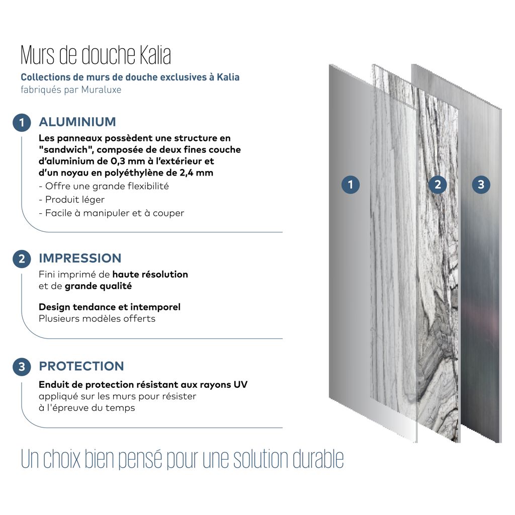 Les collections de murs de douche exclusives à Kalia sont une alternative avantageuse aux méthodes classiques ou autres revêtements de murs. En plus de s'agencer parfaitement avec les portes et bases de Kalia, la gamme propose une variété de design allant des carreaux classiques au look industriel ultramoderne en passant par le fini chic du marbre.