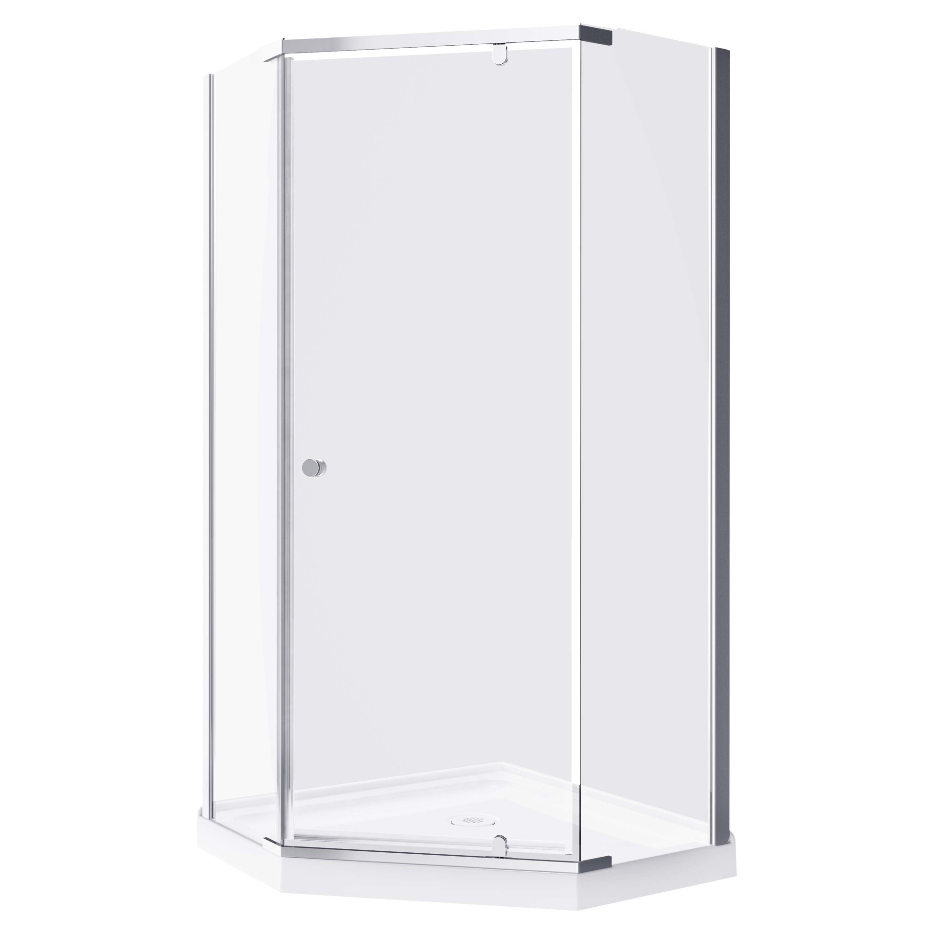 Des panneaux de verre trempé et une base de douche facile à nettoyer forment le design anguleux de cette douche néo-ronde. Les détails en aluminium ajoutent une touche moderne à la porte de douche en verre transparent qui s'ouvre pour révéler un espace de douche accueillant contre chaque mur. Le kit comprend également un drain de douche en chrome poli pour une élimination rapide de l'eau et de la mousse.