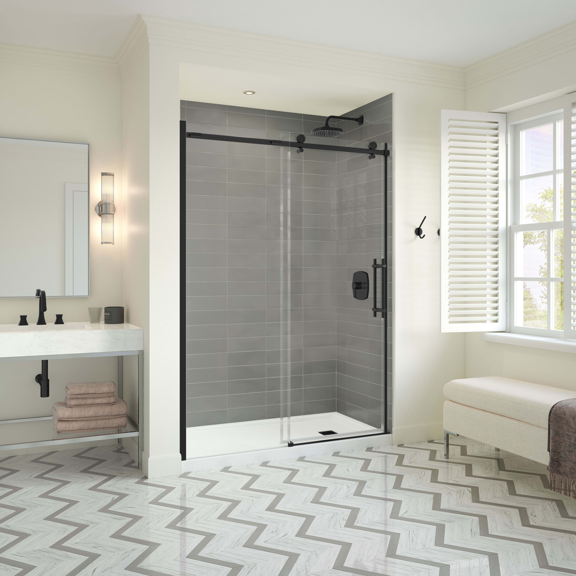 La porte de douche Odyssey confère un look moderne et raffiné à toute salle de bain avec son mouvement fluide et ses finitions élégantes telles que le chrome, le nickel brossé et le noir mat.