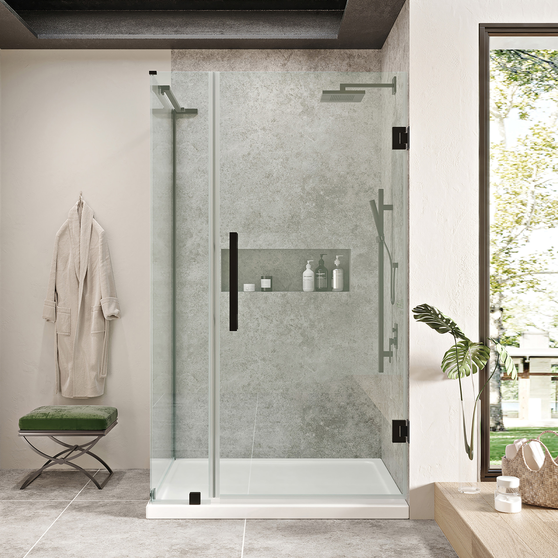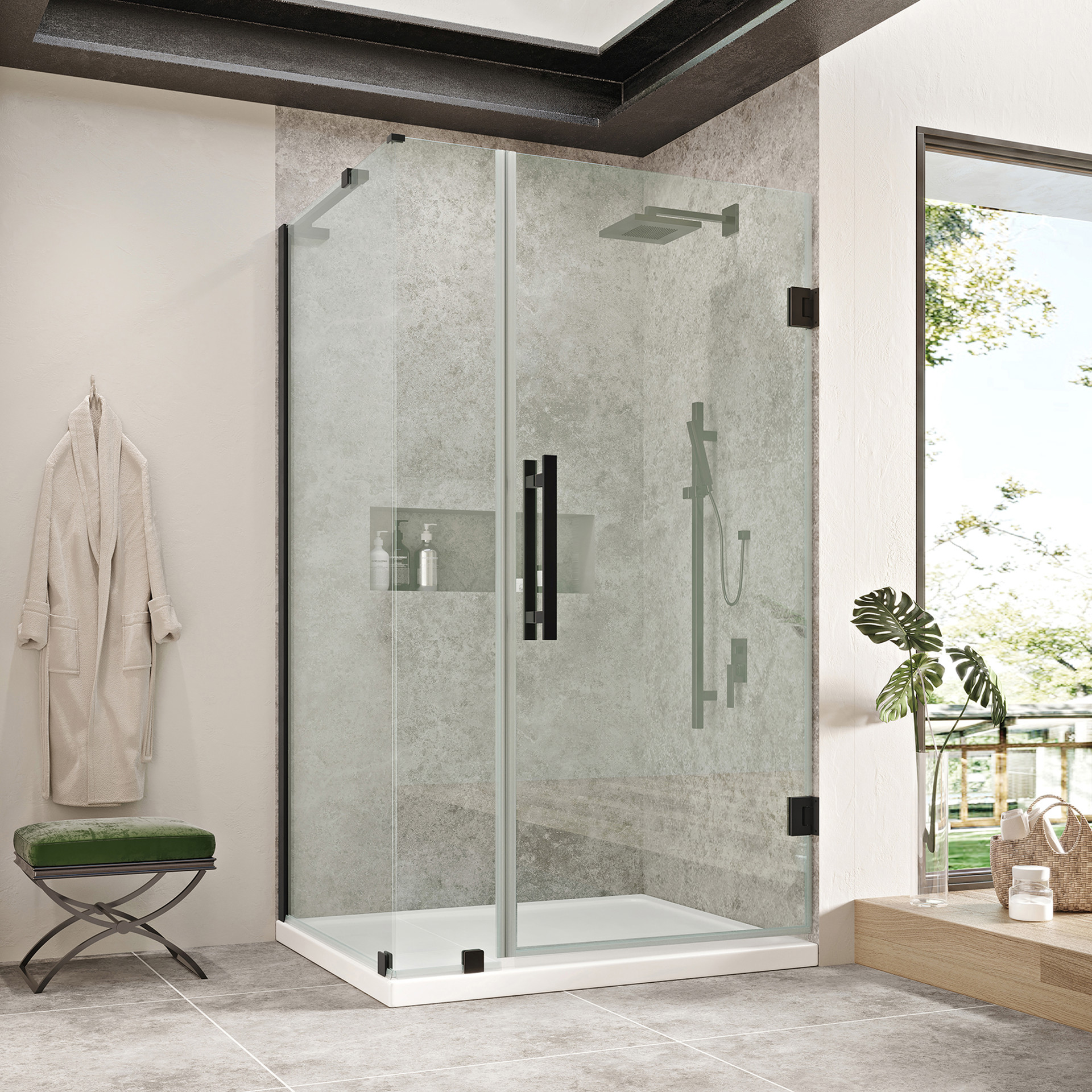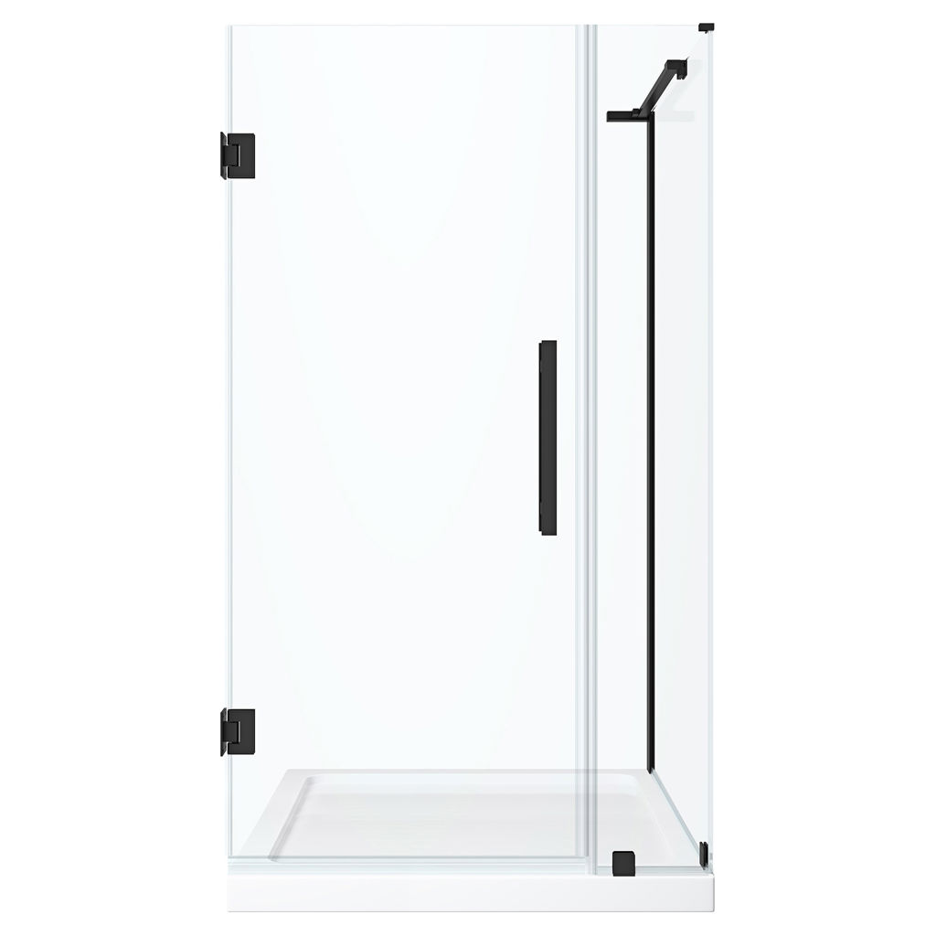 L’ensemble comprend une quincaillerie de qualité supérieure avec une finition noire élégante, un panneau de porte de 23 po, un panneau fixe de 10 po et une base de douche 36 x 32 x 2,75 po, idéale pour une installation en coin.