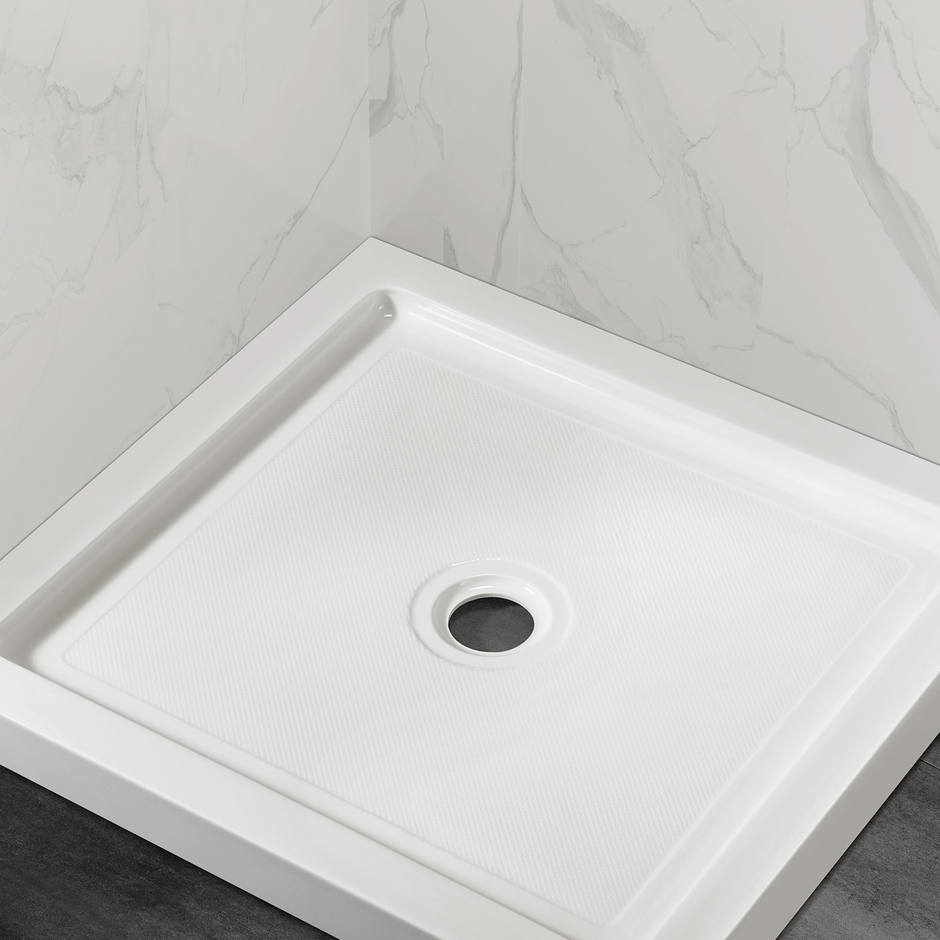 La base à drain central est en acrylique renforcé de fibre de verre, avec surface antidérapante et facile à nettoyer.