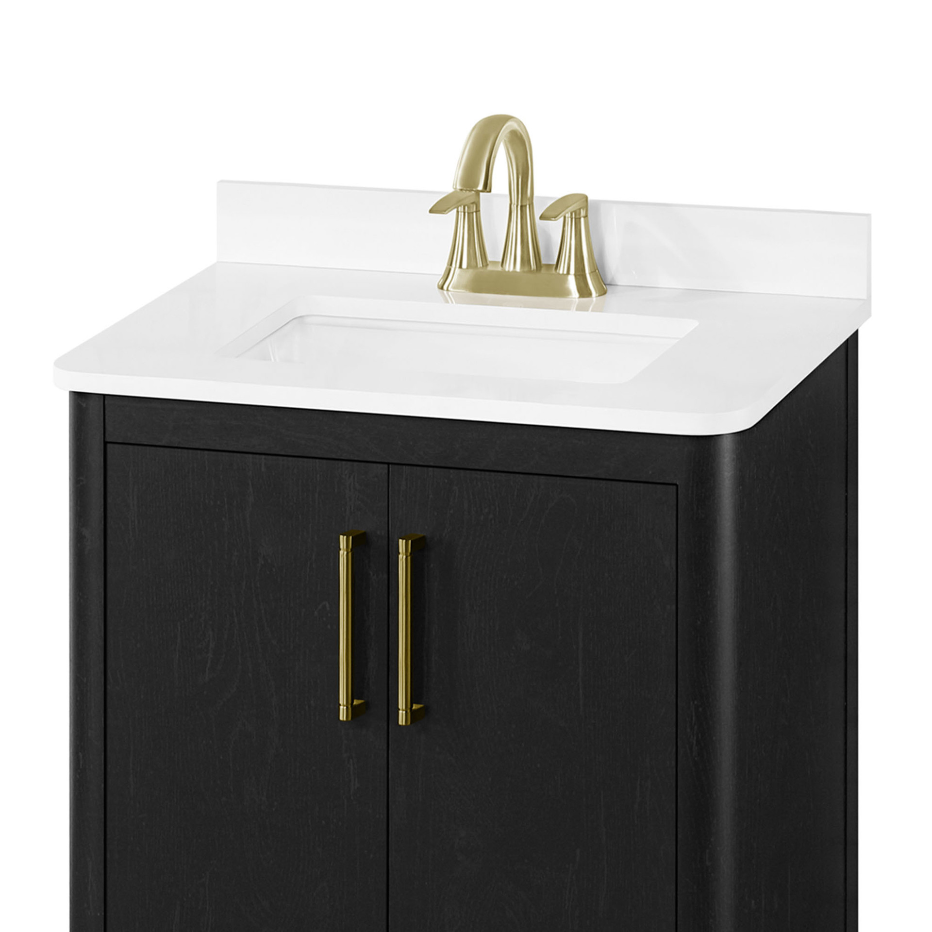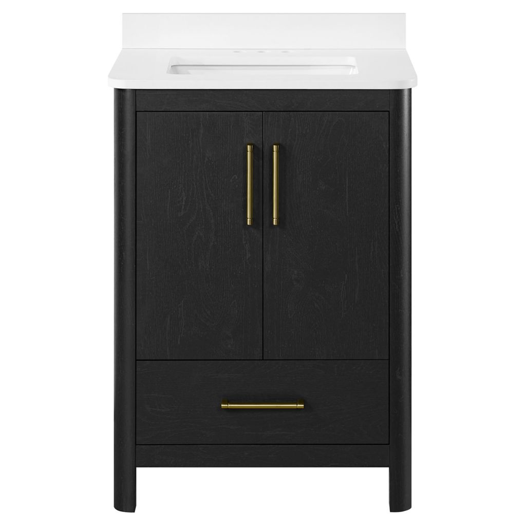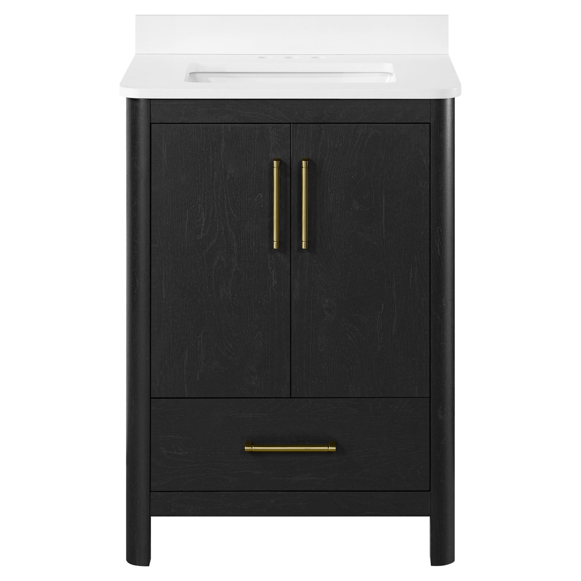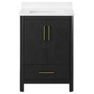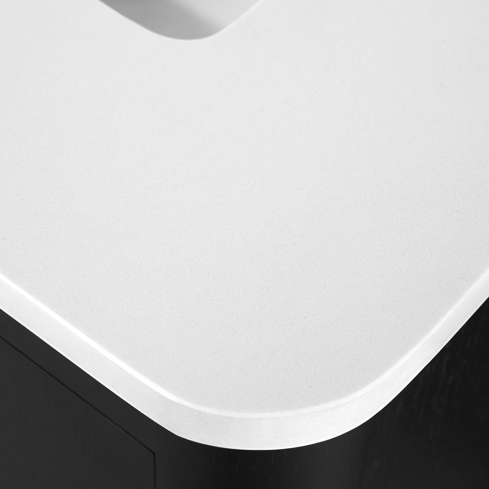 • Finition en bois noir mat avec quincaillerie en or brossé incluse. Comptoir en marbre artificiel blanc avec bords droits, coins arrondis et dosseret amovible