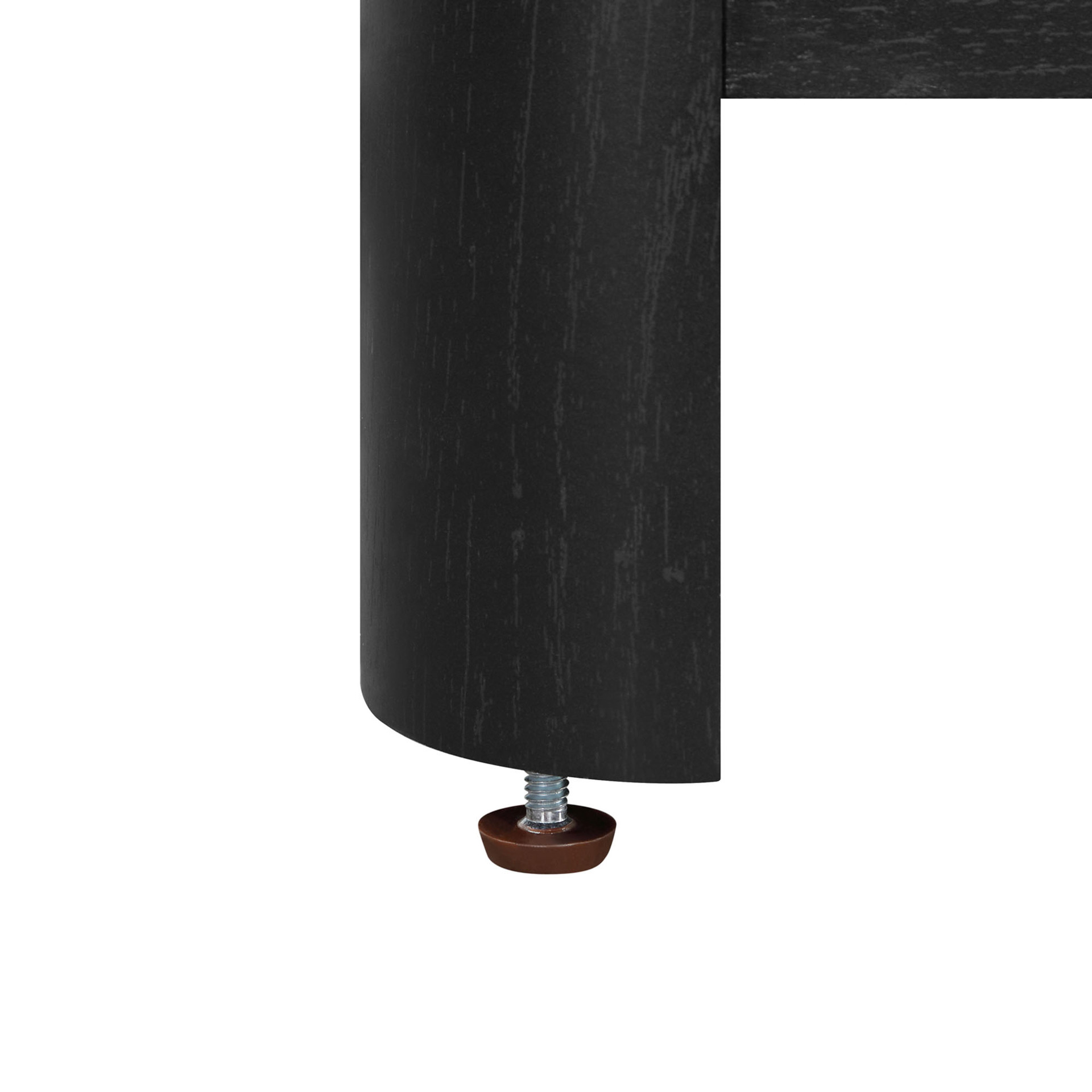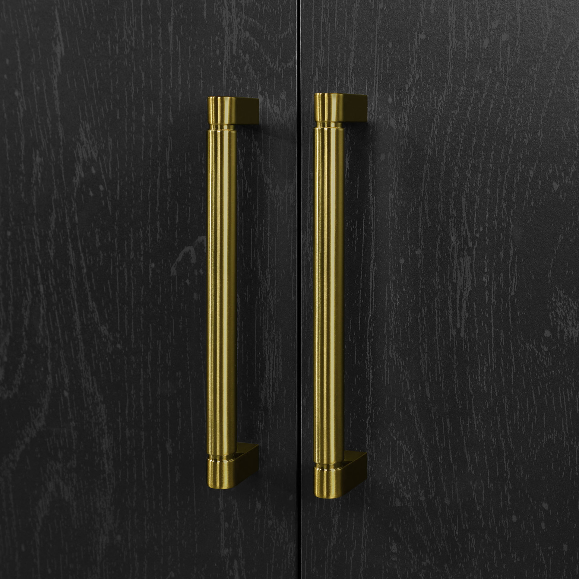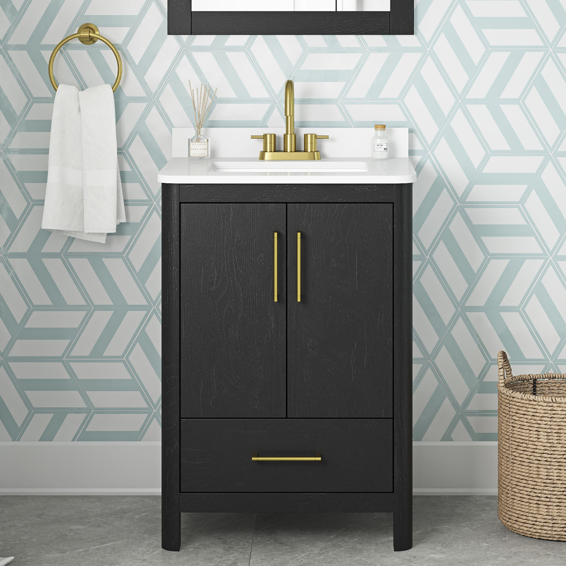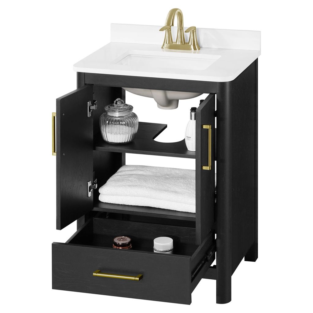 • Finition en bois noir mat avec quincaillerie en or brossé incluse. Comptoir en marbre artificiel blanc avec bords droits, coins arrondis et dosseret amovible
