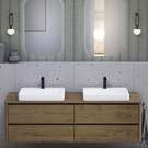 Les vasques semi-encastrées de la collection KOSLA se distinguent par leur élégance et la pureté de leur ligne. Leur forme rectangulaire s'intègre en parfaite harmonie au-dessus du meuble-lavabo, laissant une partie de leur silhouette visible qui apporte une touche de chic.