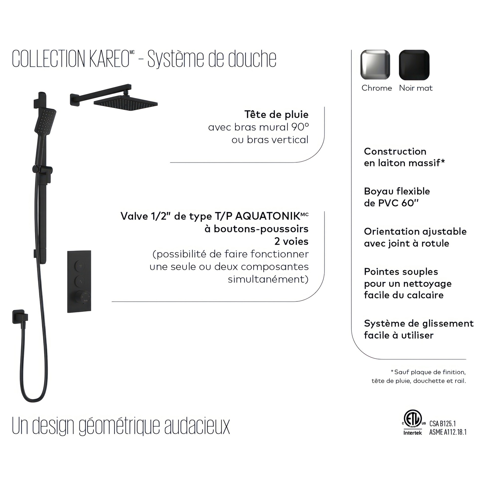 • Construction en laiton massif (sauf tête de pluie, douchette et rail).