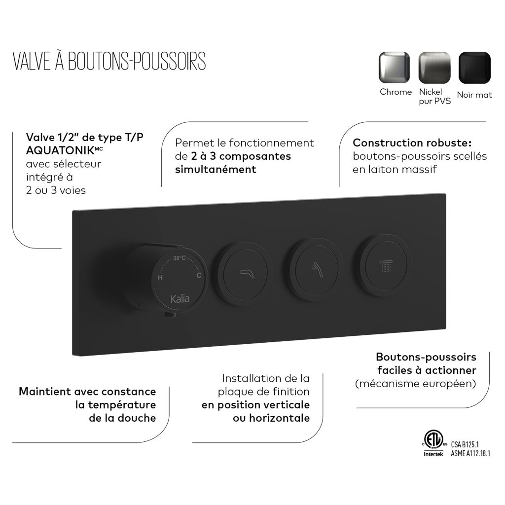 • Vanne thermostatique à bouton-poussoir brut à 2 voies AQUATONIK™ de type T/P ½'' (fonctionne avec 1 ou 2 composants à la fois)