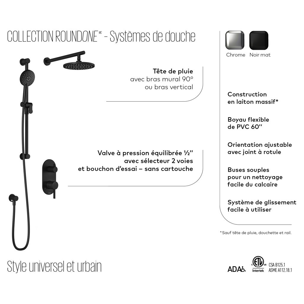 Système de douche Roundone PB4 à pression équilibrée avec sélecteur 2 voies et bras vertical- Noir mat