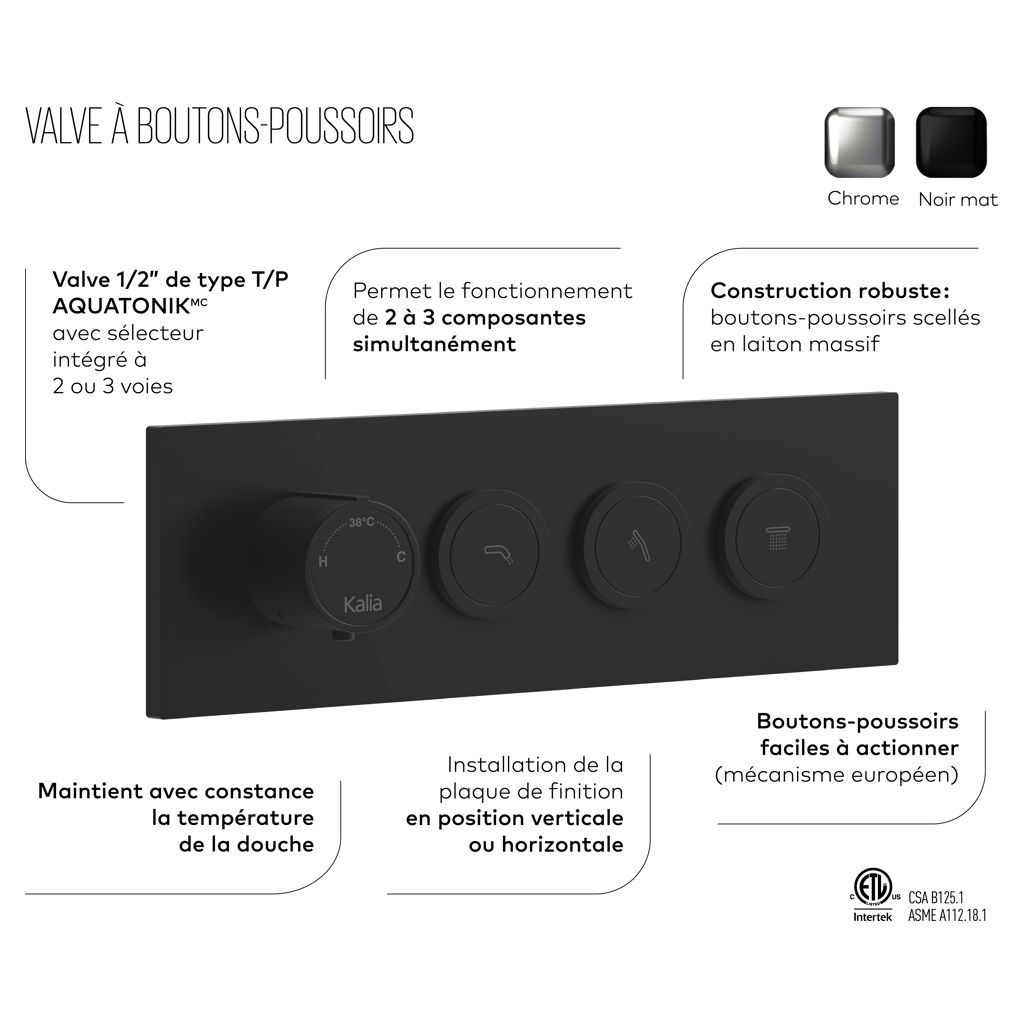Doté d'un bouton de contrôle de la température et de bouton-poussoirs encastrés, vous pouvez facilement utiliser 2 ou 3 composantes simultanément pour une expérience de douche personnalisée.