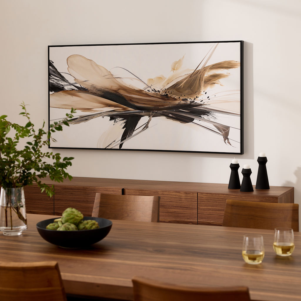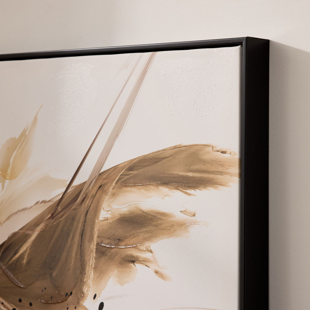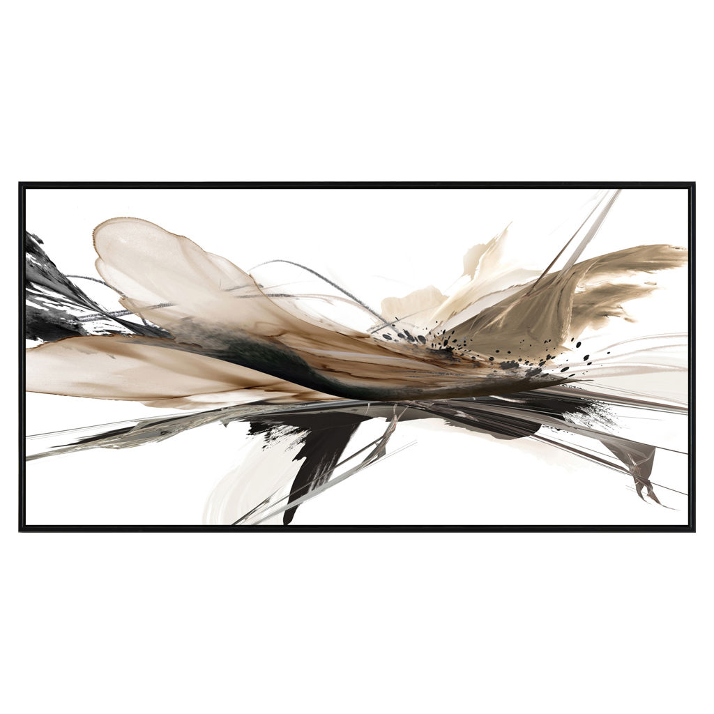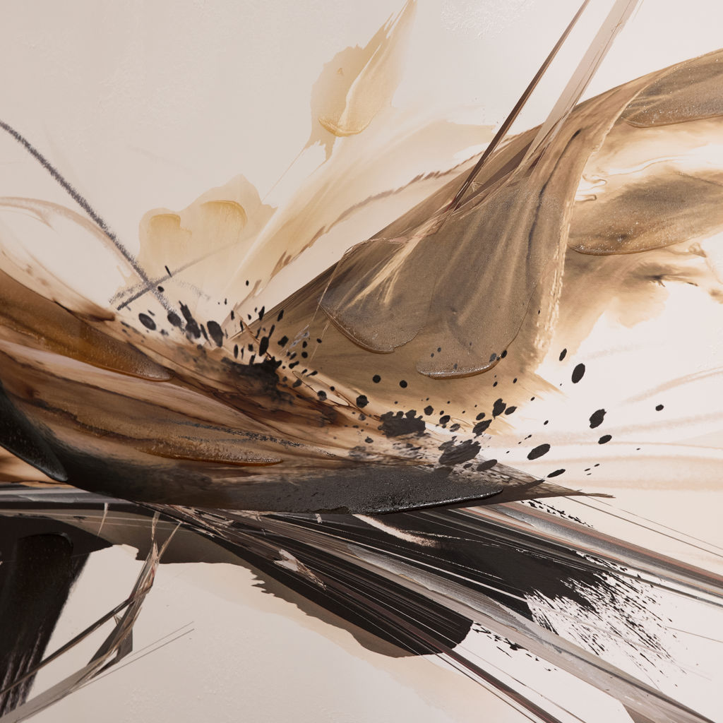 Ce tableau dynamique capte immédiatement l’attention grâce à ses mouvements fluides et ses tons naturels contrastés. Les formes énergiques se déploient sur un fond clair, créant une composition à la fois expressive et harmonieuse.