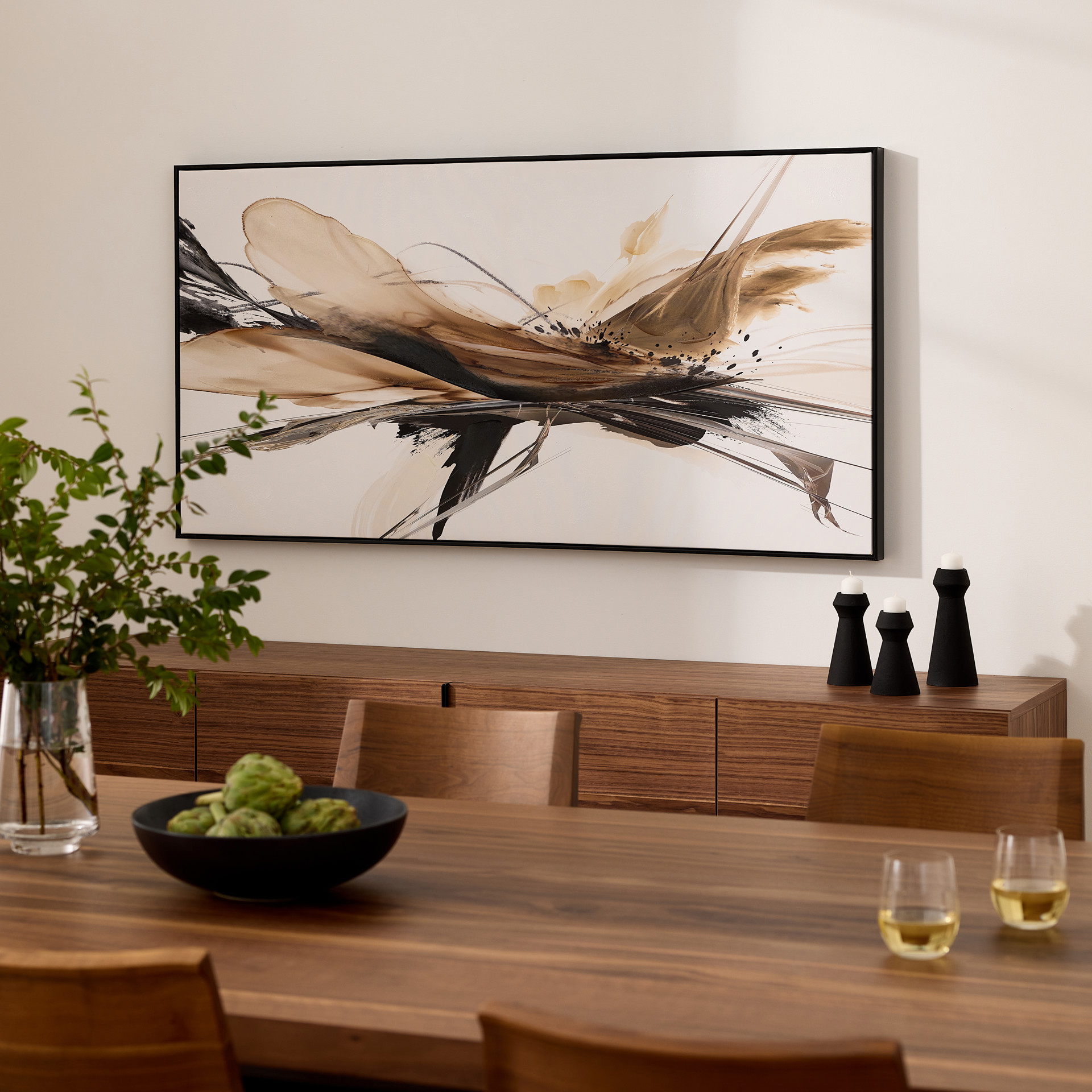 Encadrée d’une bordure noire épurée, cette pièce ajoute une présence moderne et raffinée à votre décor, parfaite pour rehausser un salon, un bureau ou tout espace recherchant une touche visuelle forte.