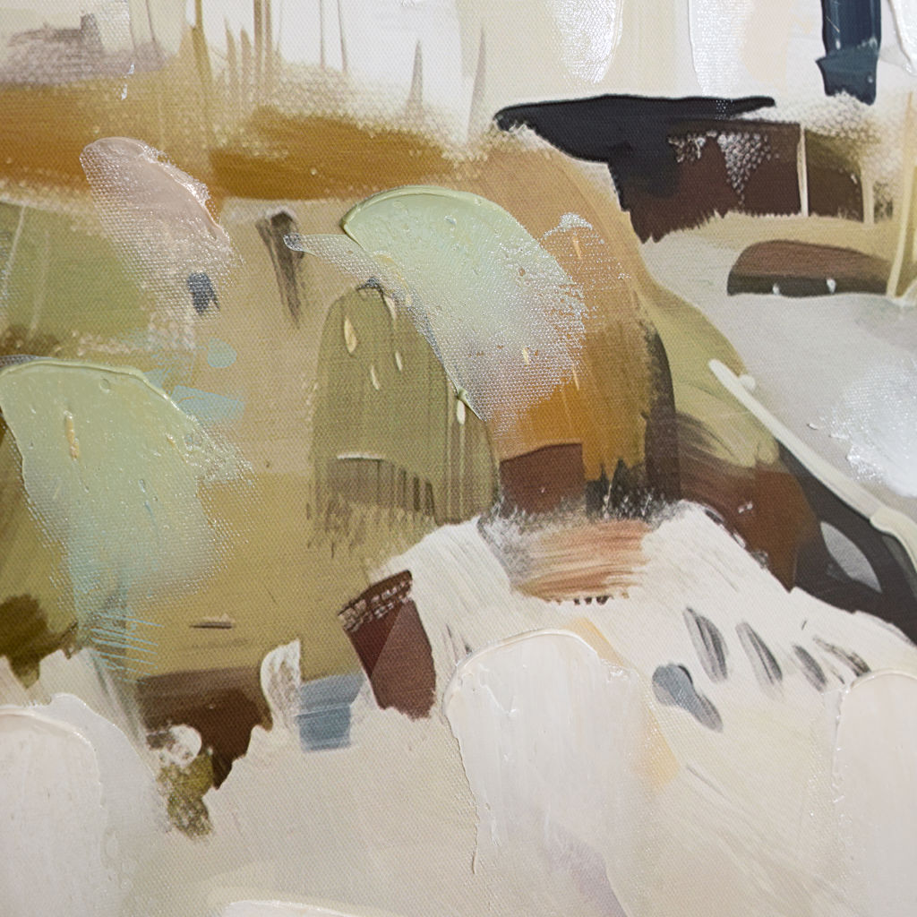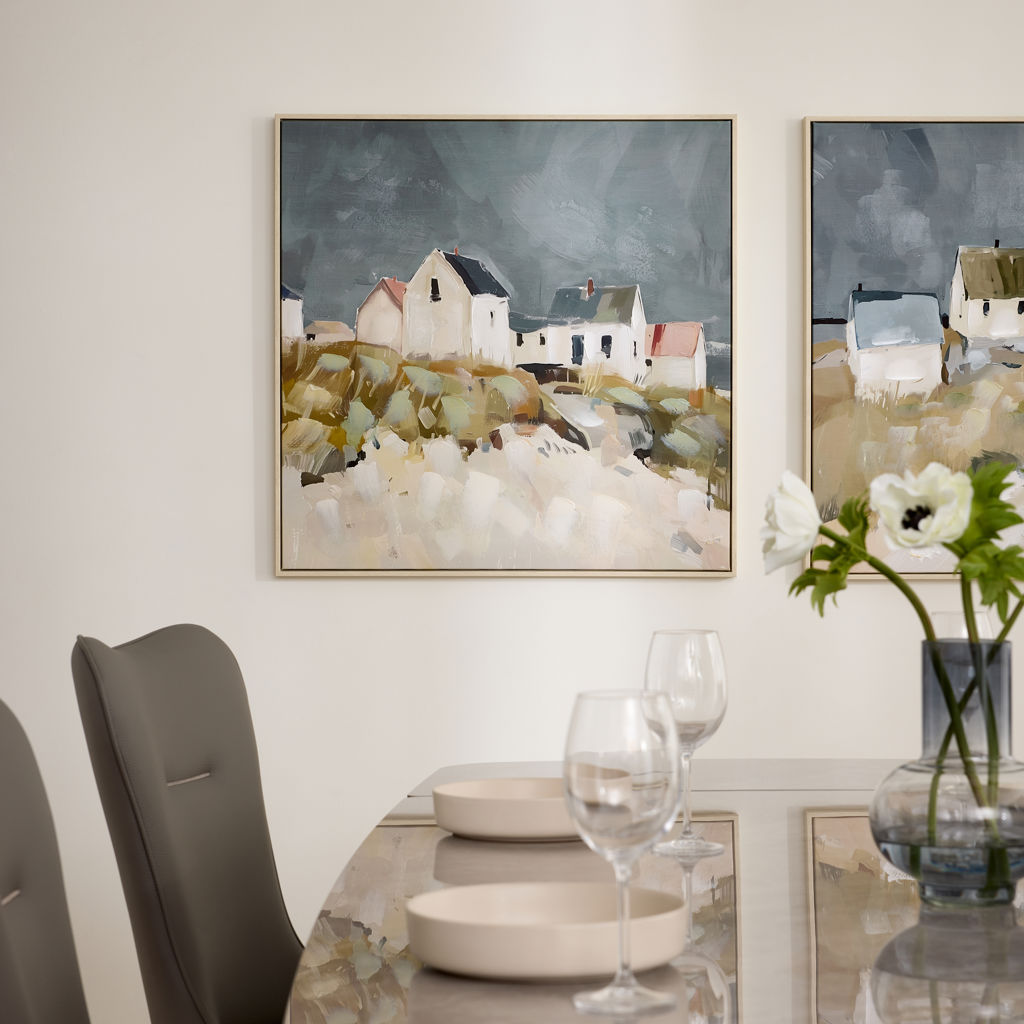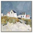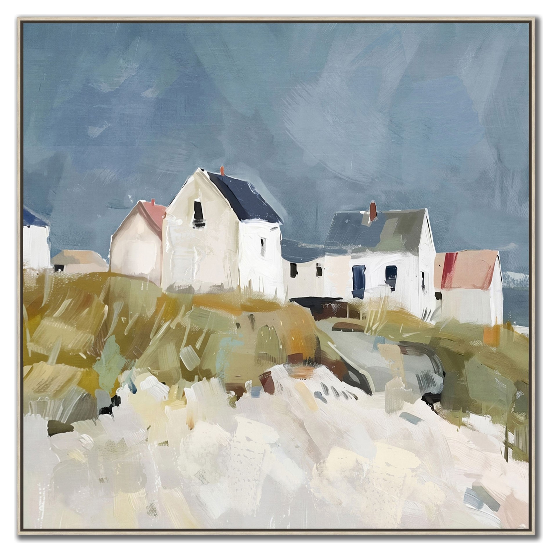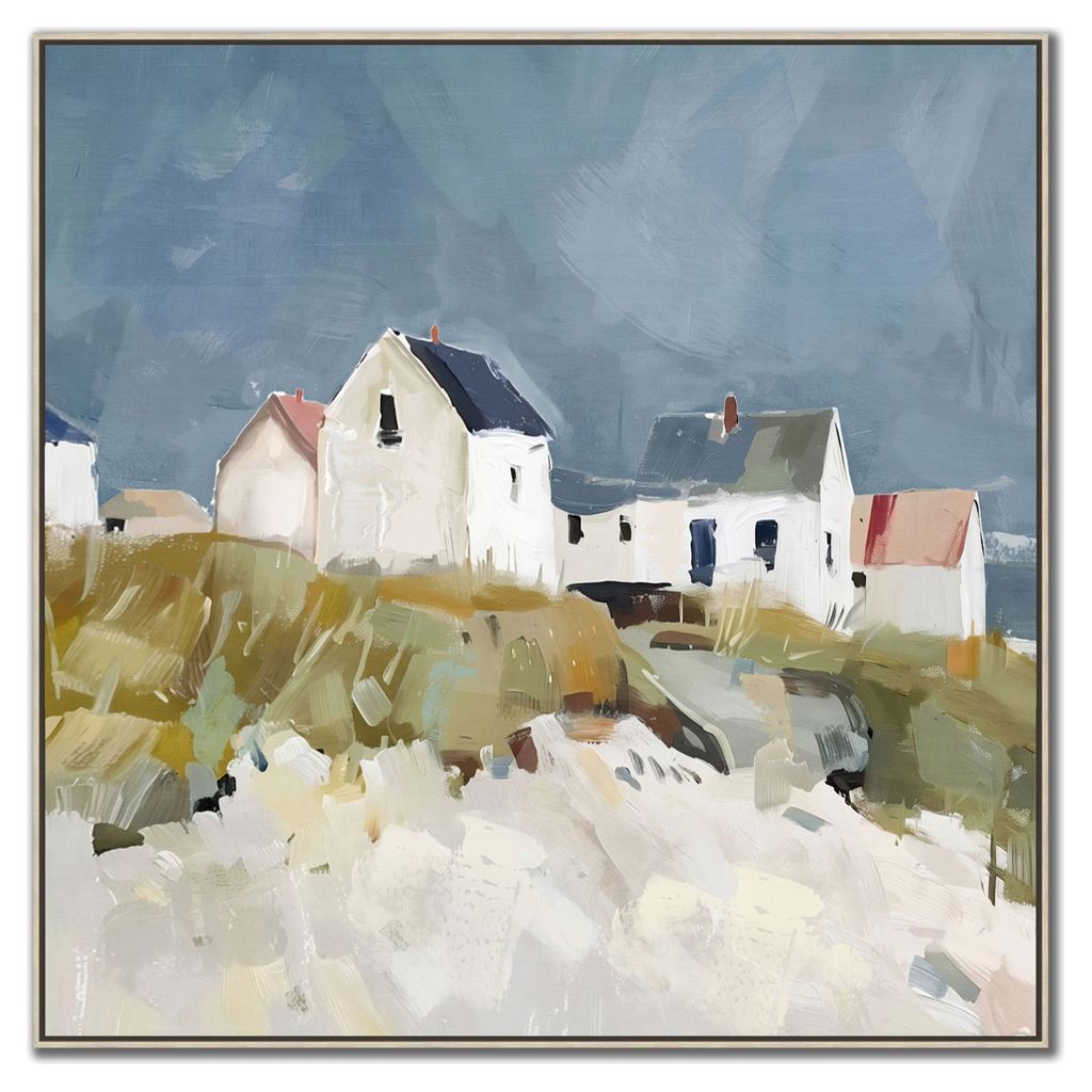 Ce tableau apporte une ambiance douce et lumineuse à votre décor. Ses maisons claires et son paysage côtier évoquent la tranquillité des petits villages en bord de mer.