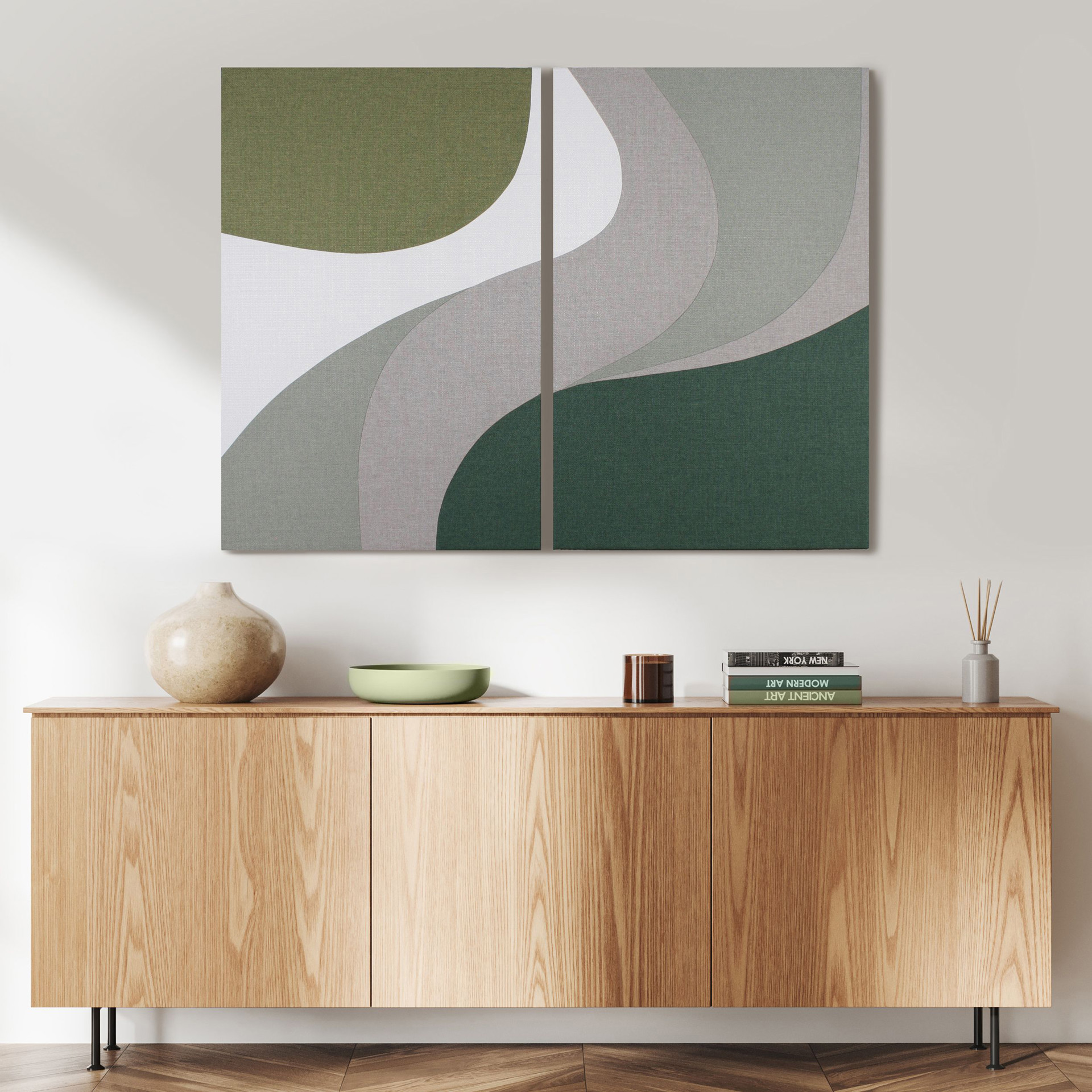La murale VISION est une composition abstraite minimaliste de 2 tableaux dans les tons de gris et vert.