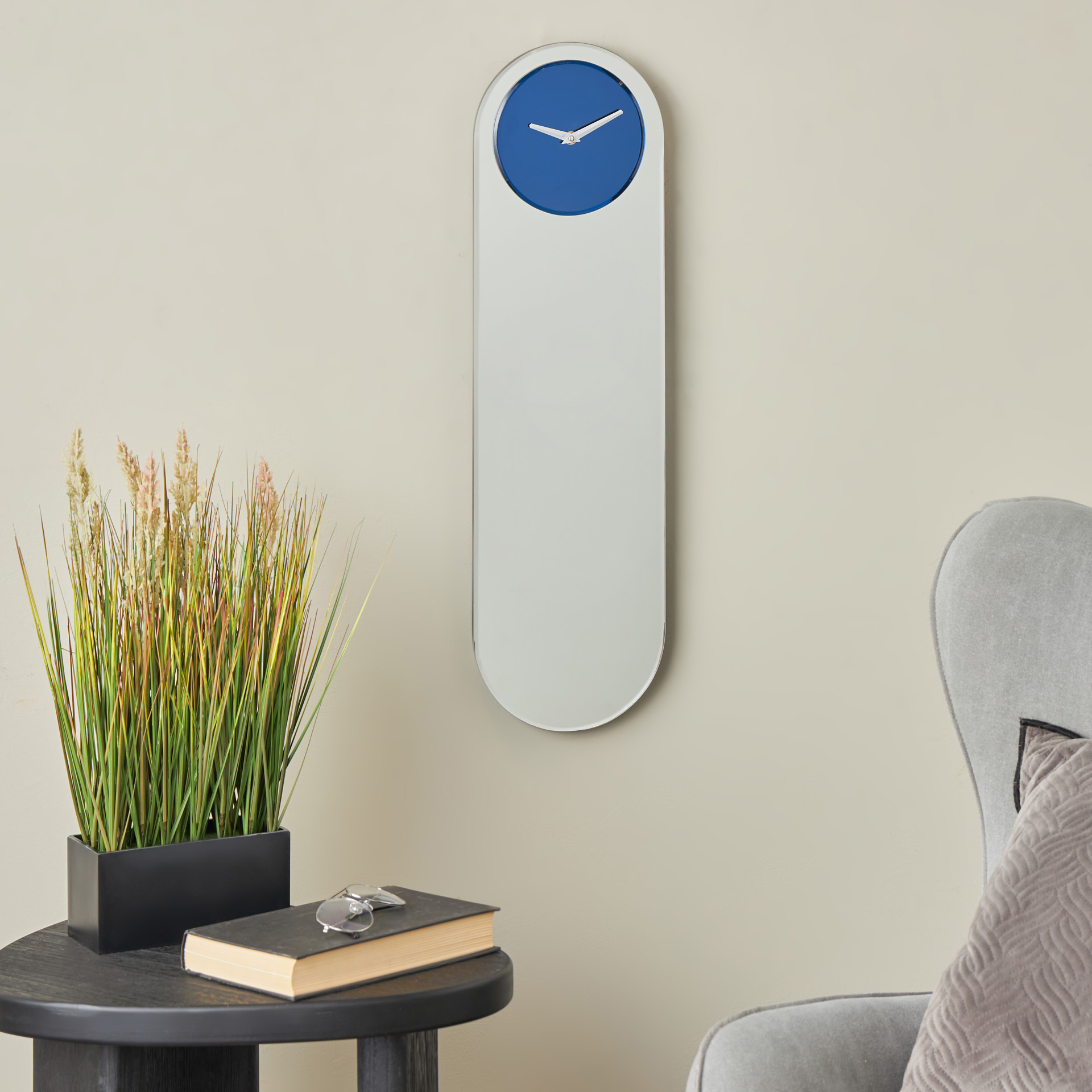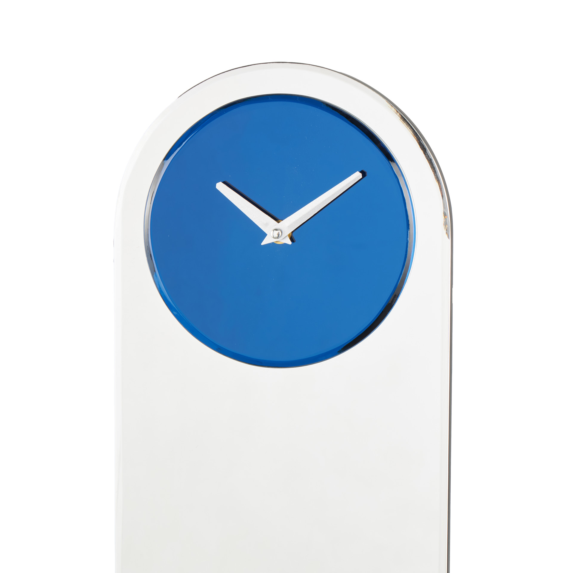 L'horloge murale ovale présente une superbe combinaison d'argent et de bleu avec une finition miroir.