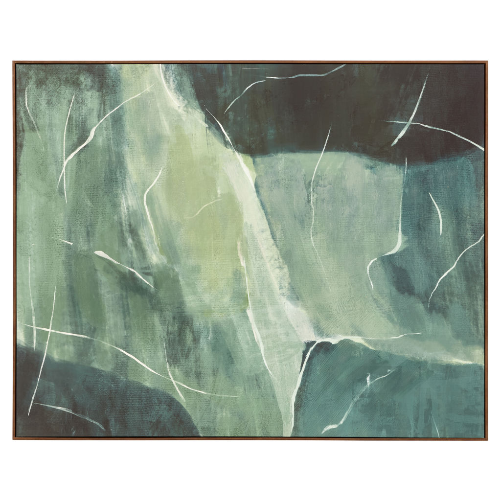 Impression utilise un doux mélange de nuances tonales pour transmettre la facilité. Les coups de pinceau d'un blanc éclatant ajoutent de la dimension et un mystère subtil. Cette pièce à grande échelle est finie dans un cadre en bois de pin chaleureux pour un attrait patrimonial.