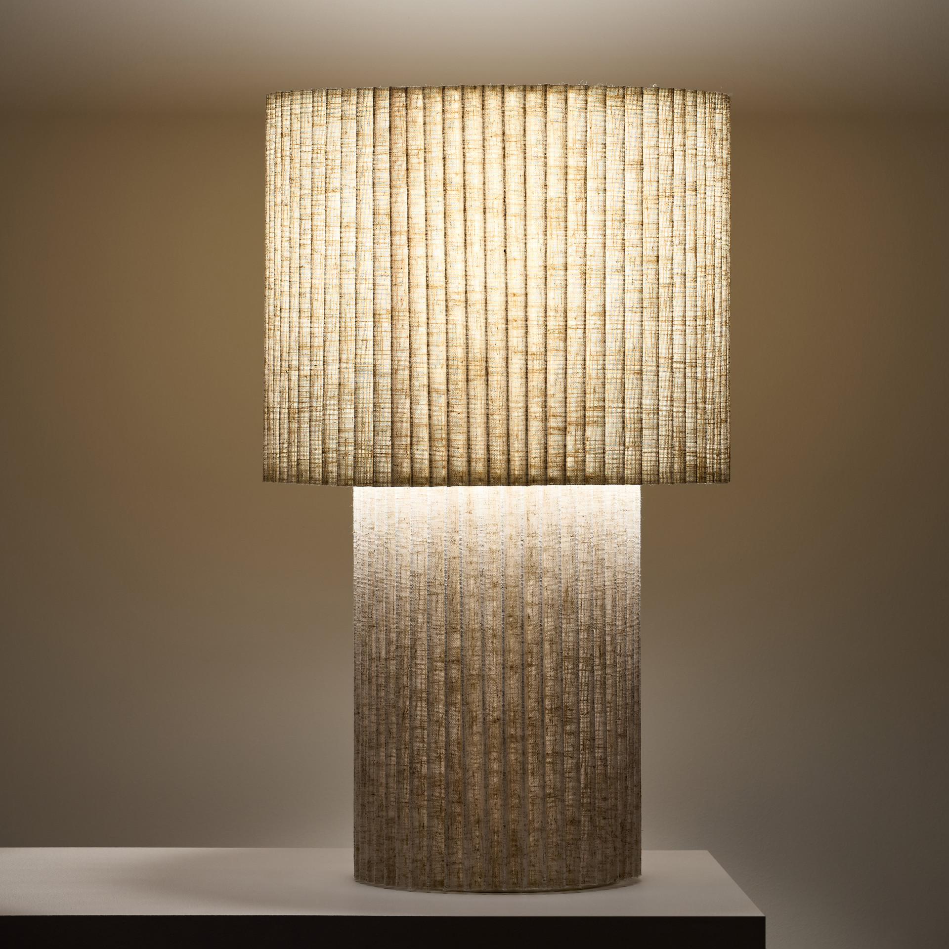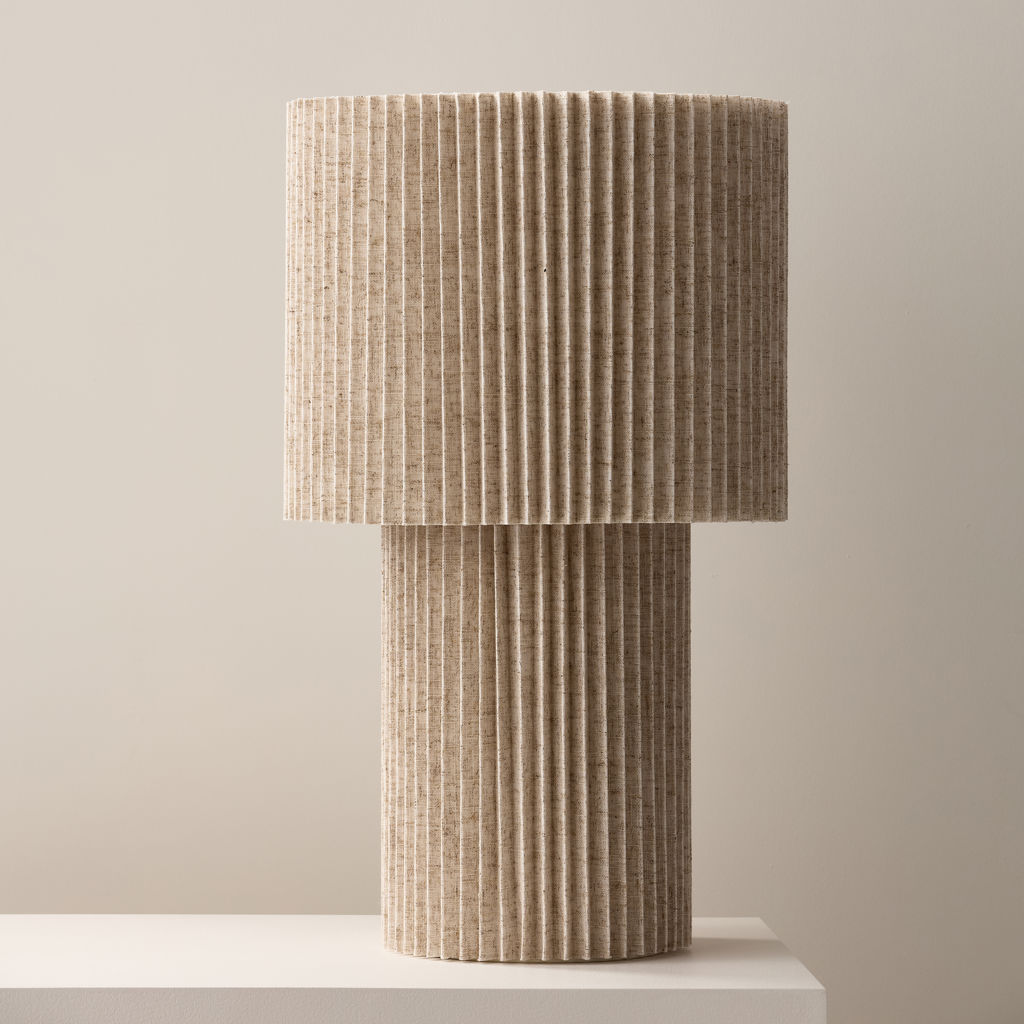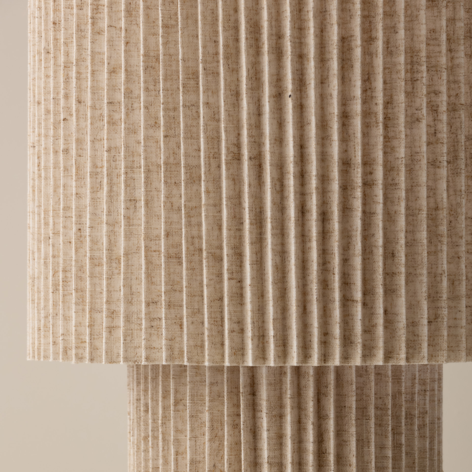 Cette lampe de table à l'abat-jour et base plissés en lin beige offre un aspect classique et élégant. La lampe est fabriquée à partir d'un lin beige de haute qualité, détaillé par des plis au couteau, créant une texture raffinée et sophistiquée.