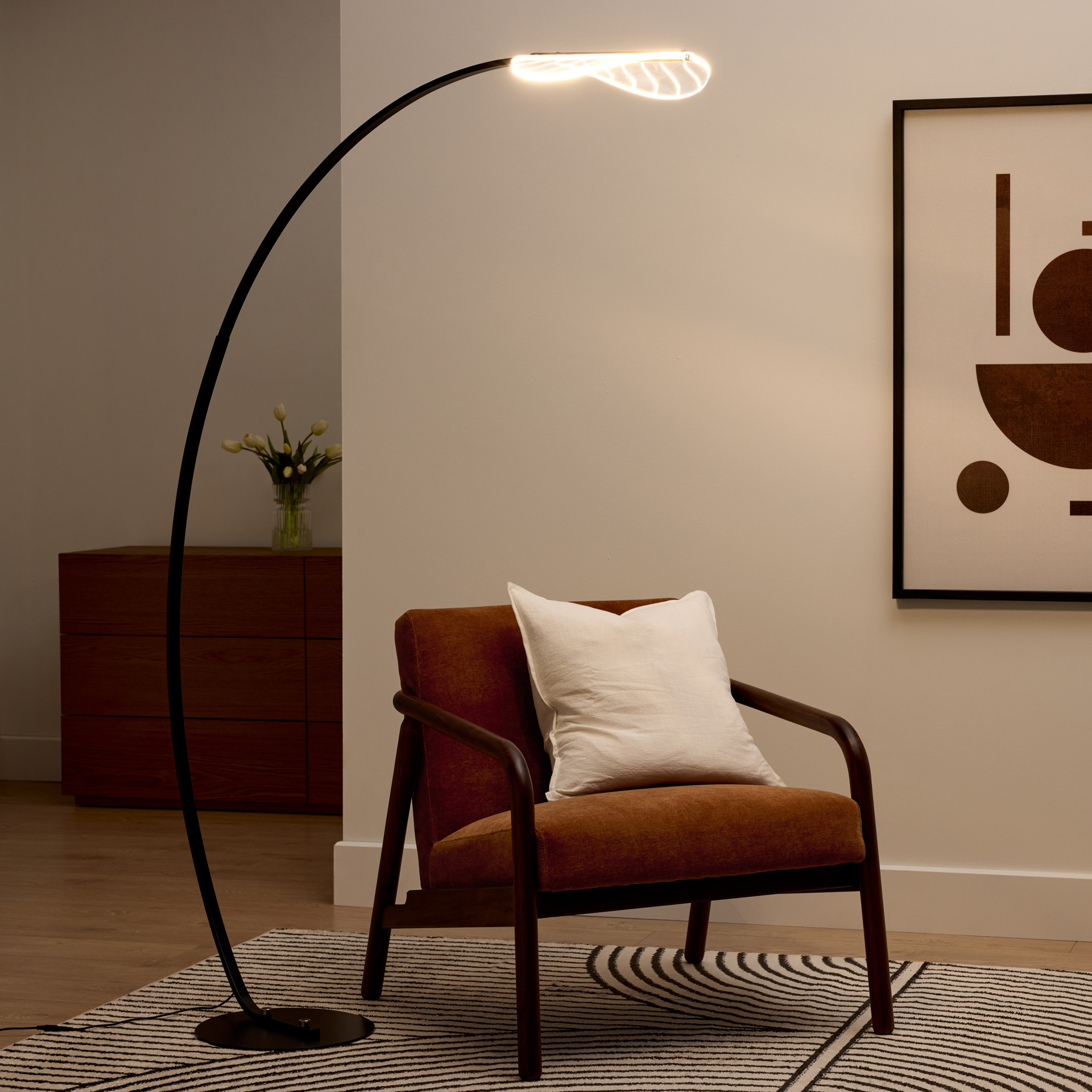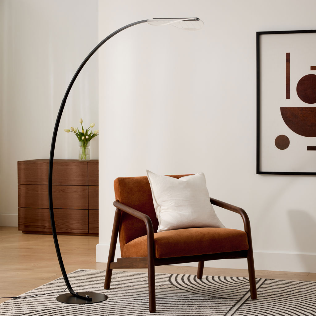 Cette lampe sur pied offre un éclairage ciblé idéal pour les moments de lecture ou de détente. Son bras courbé permet de diriger la lumière exactement là où vous en avez besoin, tout en prenant peu d’espace au sol.