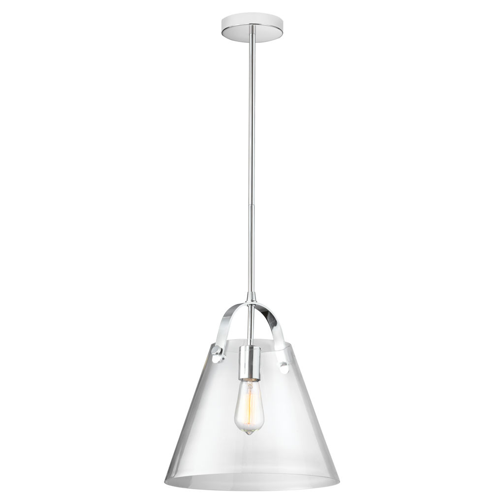 Cette lampe suspendue combine la légèreté aérienne du verre transparent avec l'éclat chaleureux du chrome brossé. Le diffuseur conique en verre clair laisse l'ampoule apparente devenir l'élément décoratif central, créant un jeu lumineux élégant.