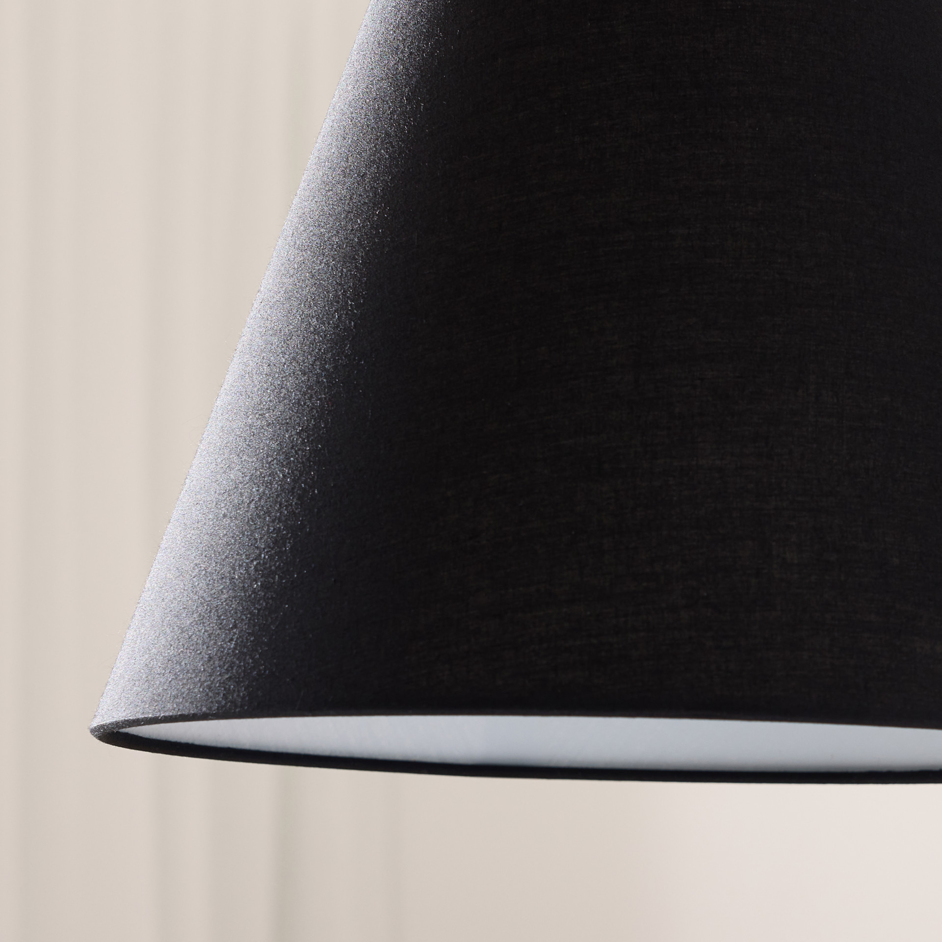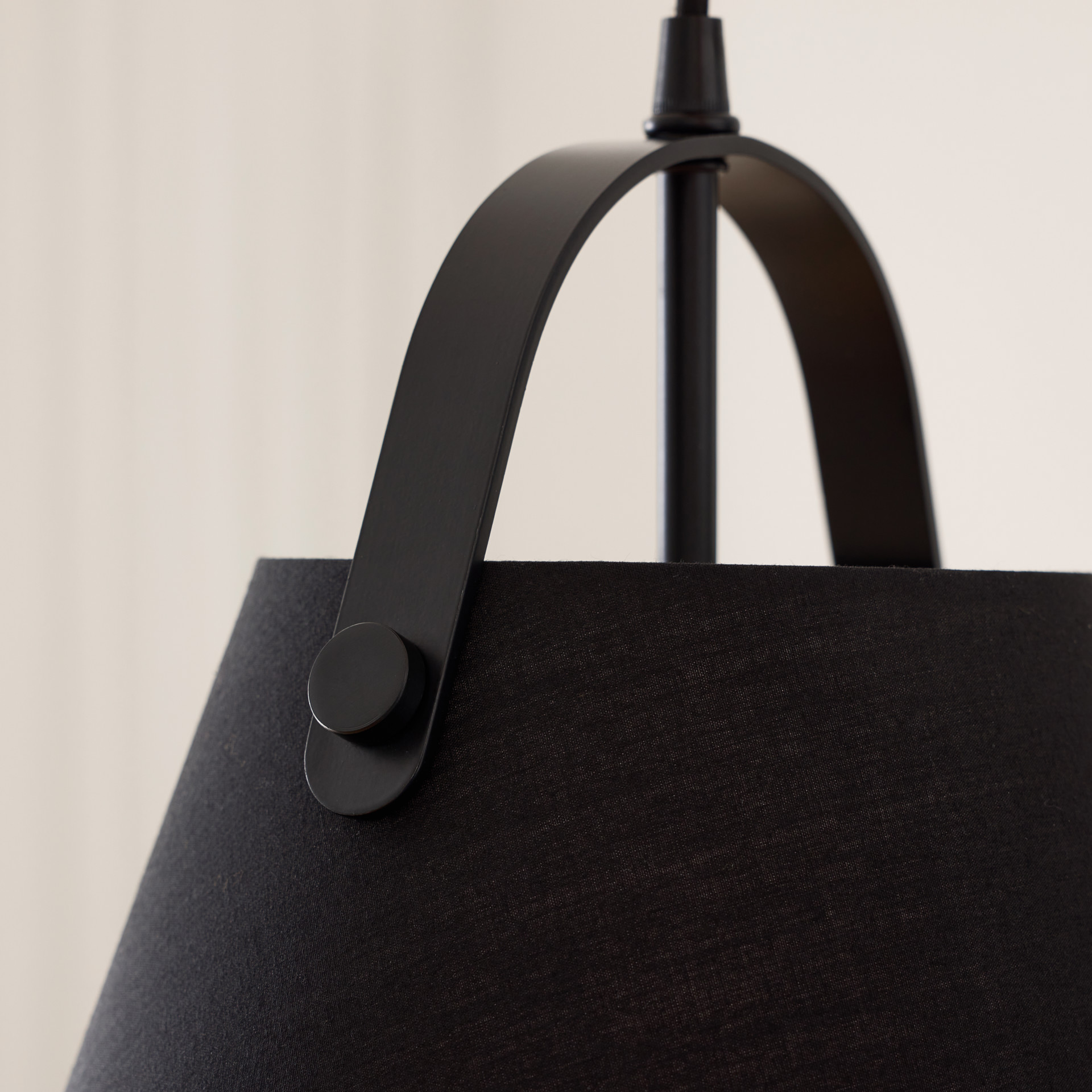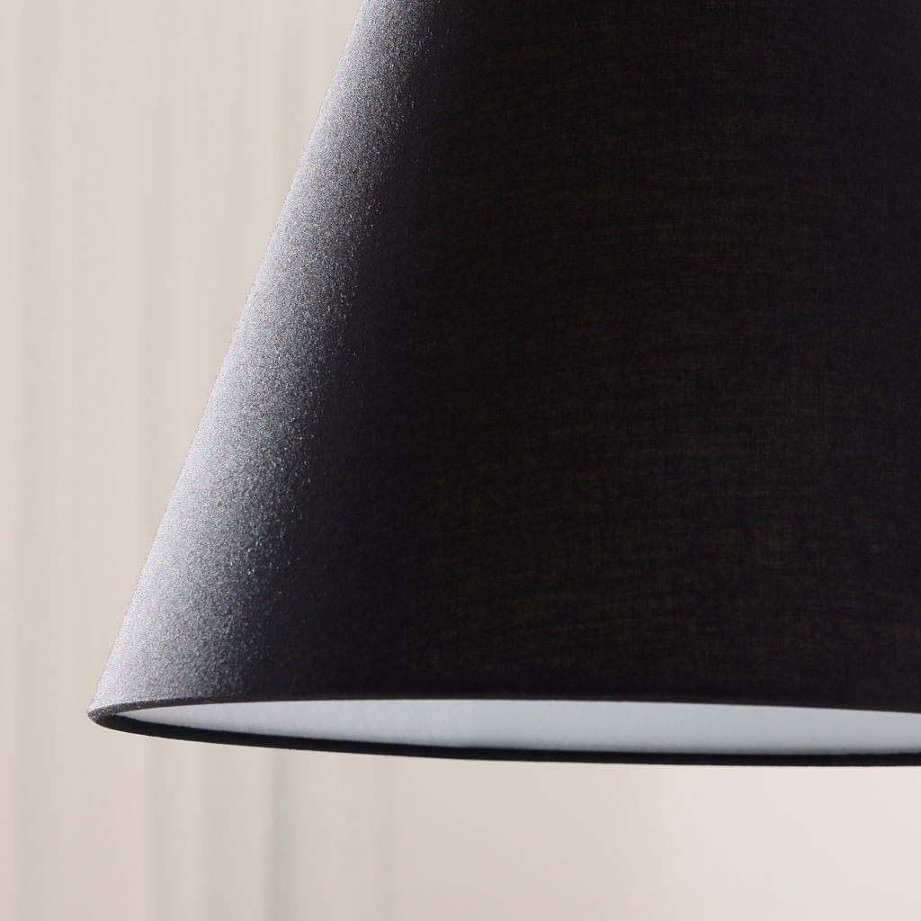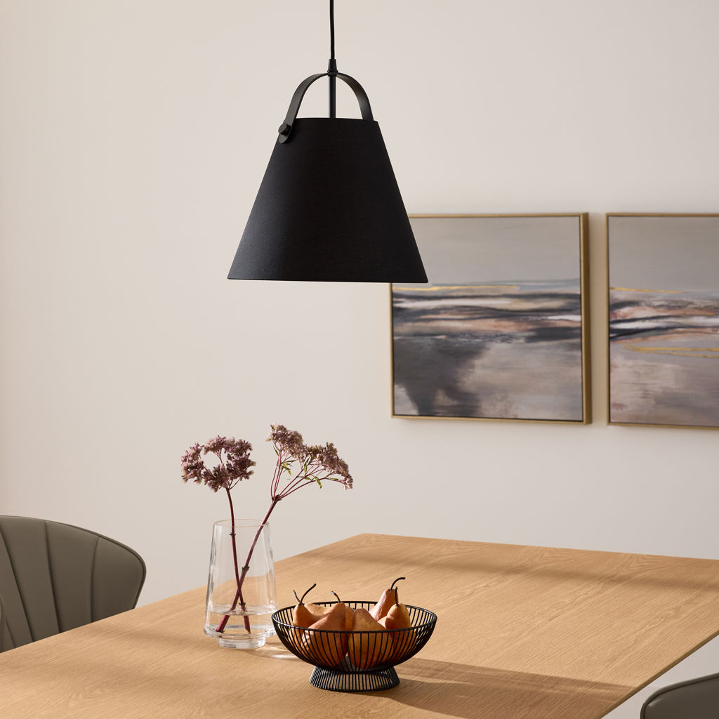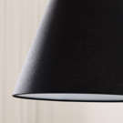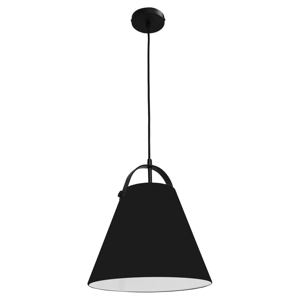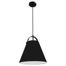 Cette lampe suspendue tout métal noir marie forme conique classique et détail d'anse distinctive qui rappelle une lanterne portable. L'extérieur noir mat contraste avec l'intérieur blanc qui réfléchit efficacement la lumière vers le bas pour un éclairage ciblé et fonctionnel.