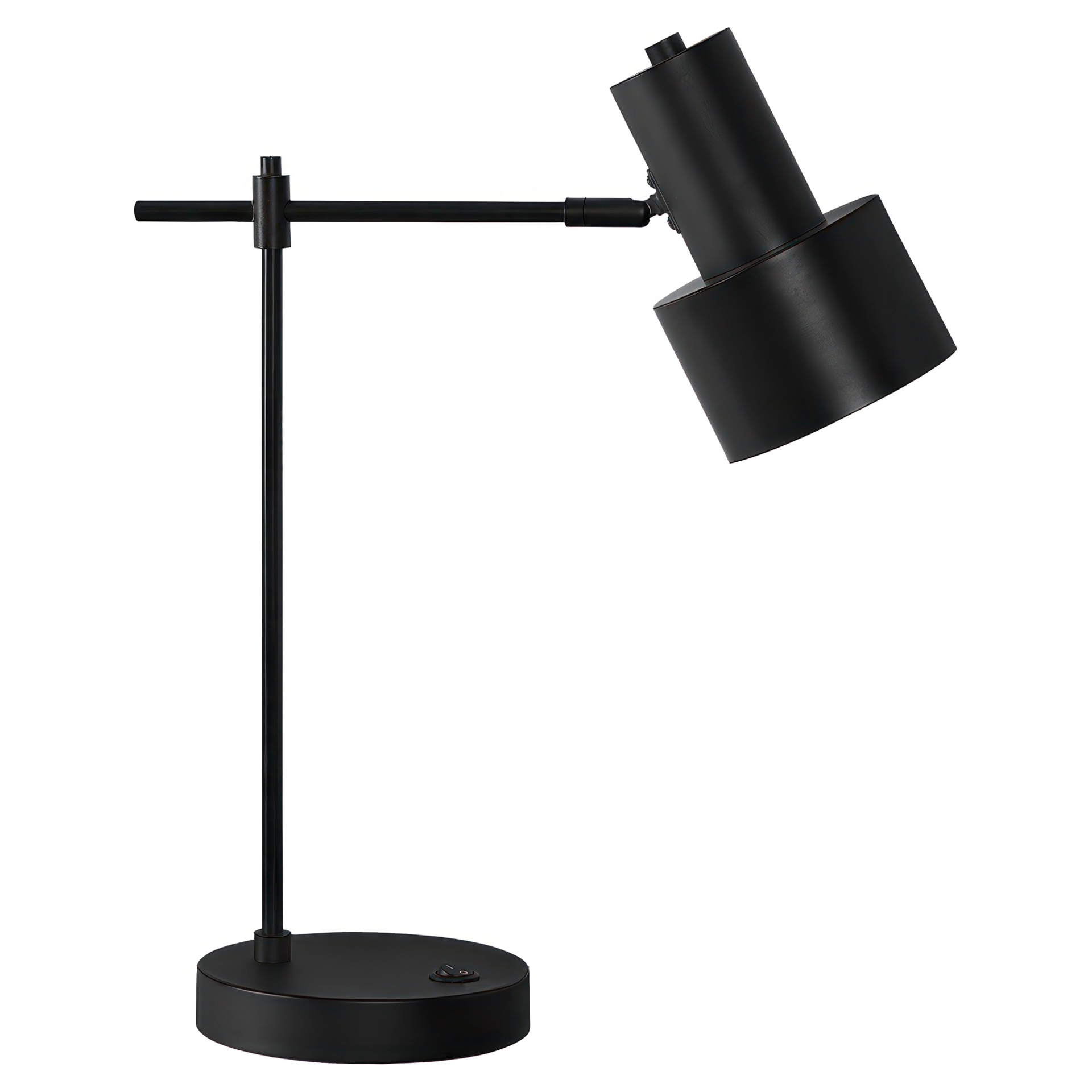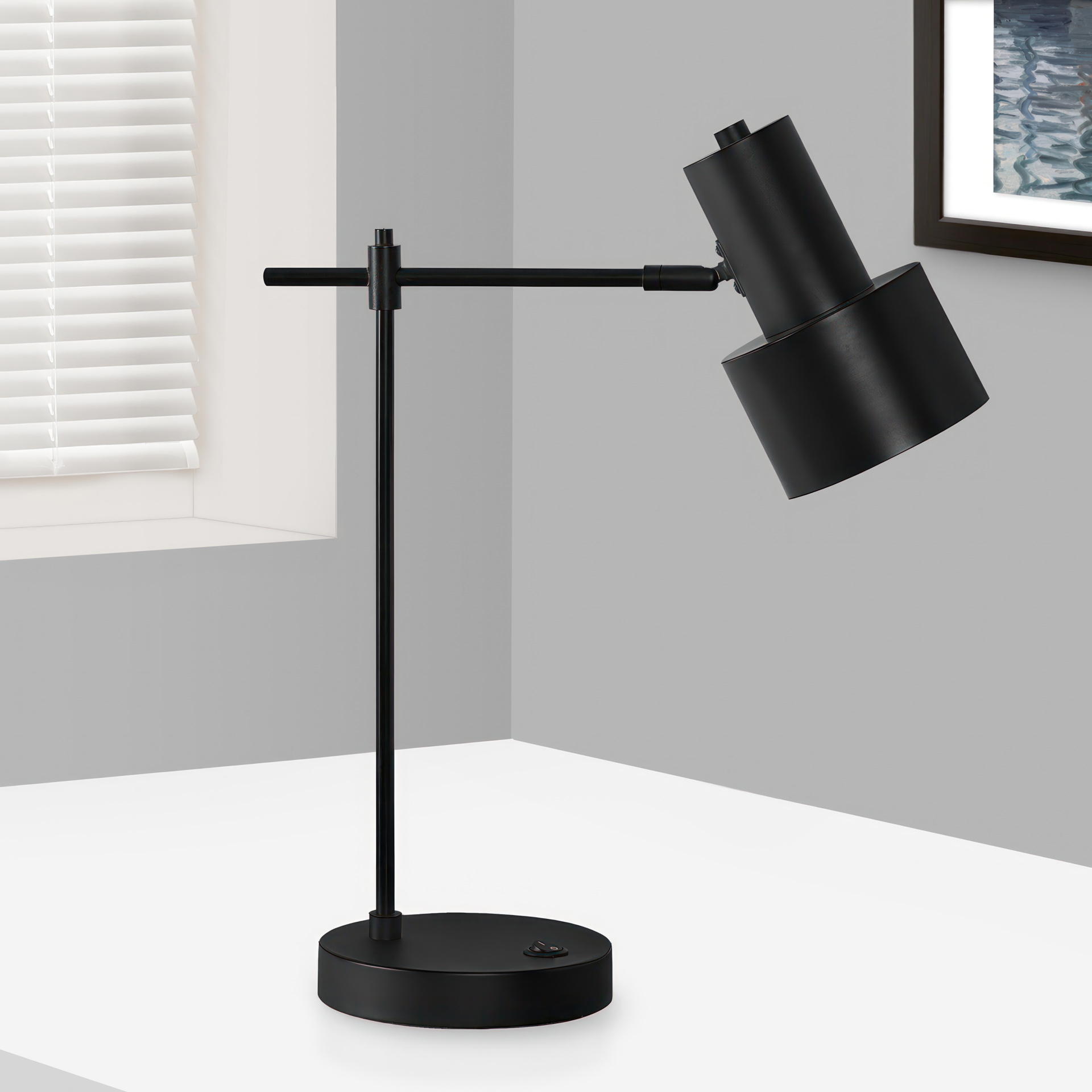 Lumière, caméra, action avec cette élégante lampe de table de 21" de haut, dotée d'une base et d'un cadre fixes en métal noir et d'un abat-jour noir réglable qui peut être déplacé pour concentrer la lumière sur la tâche à accomplir.