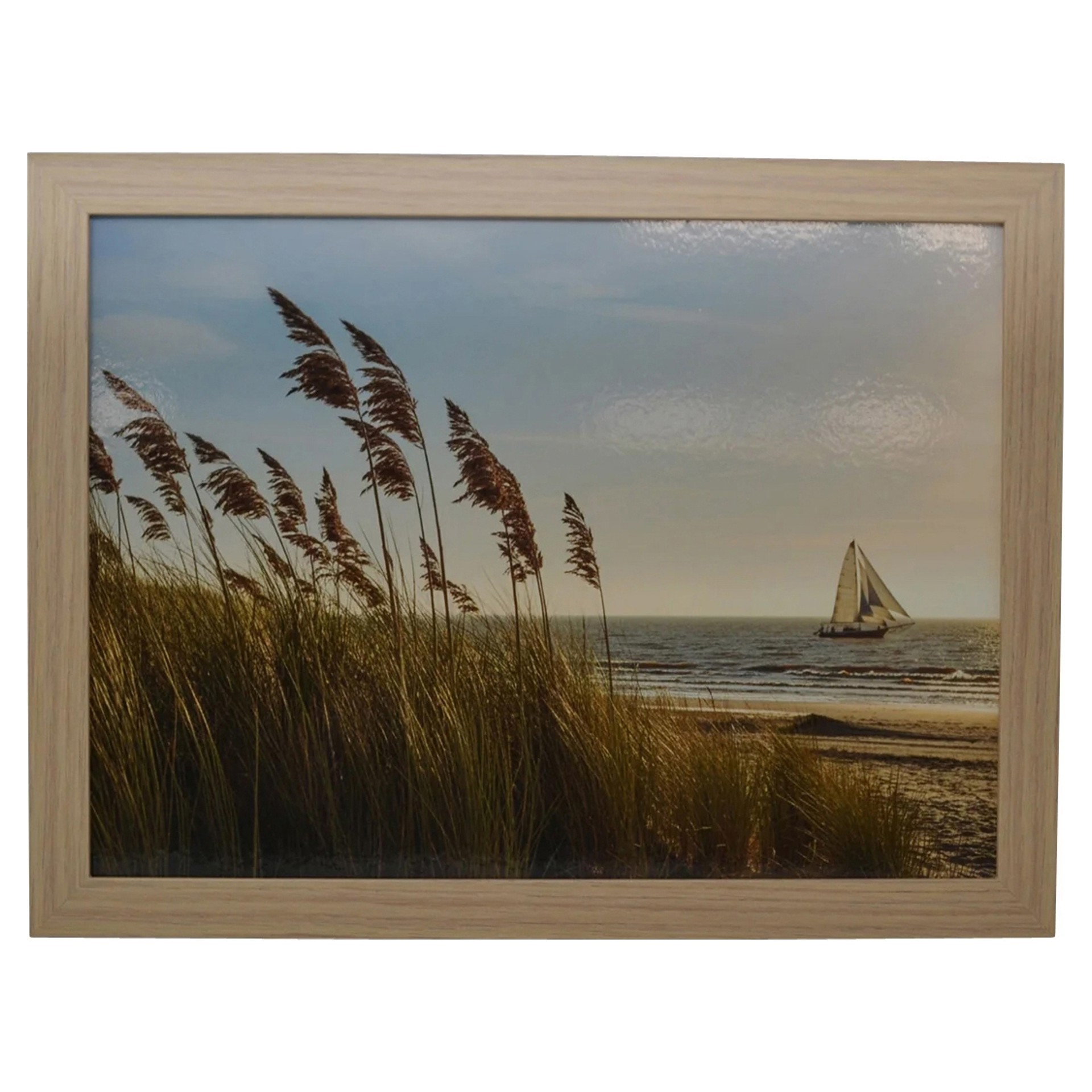 Ce plateau de lecture en bois et en tissu allie fonctionnalité et esthétisme avec son décor apaisant de plage et de pampas.