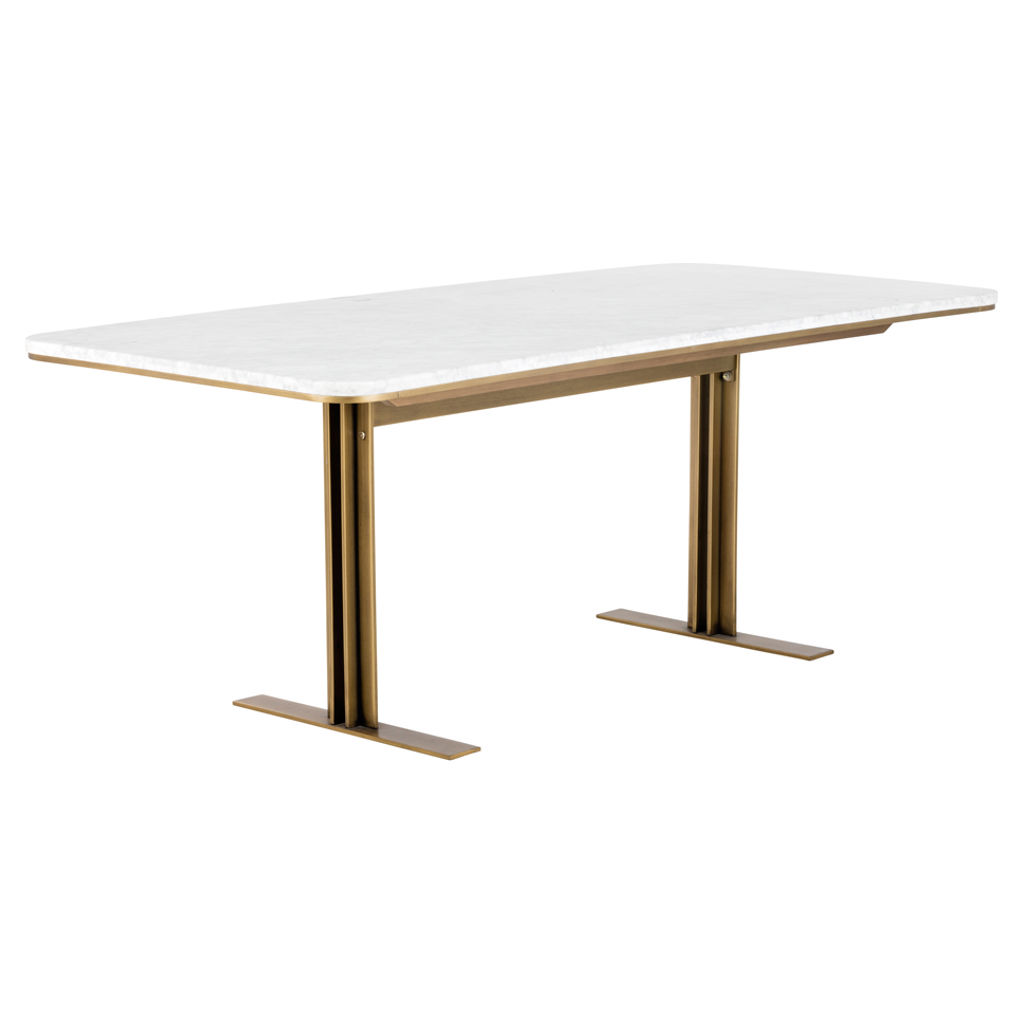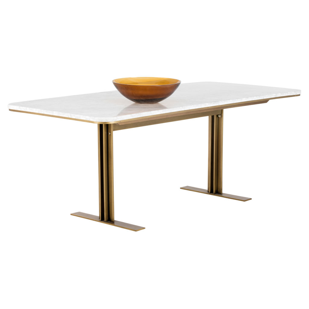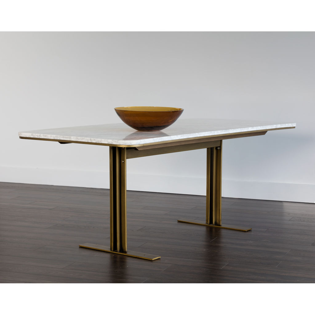 Cette table à manger intrigante de notre collection Zenn apportera un style art déco aux espaces de restauration. Fabriqué avec un beau dessus en marbre avec des bords arrondis et une base contemporaine en T en laiton antique. Peut accueillir jusqu'à huit personnes.
