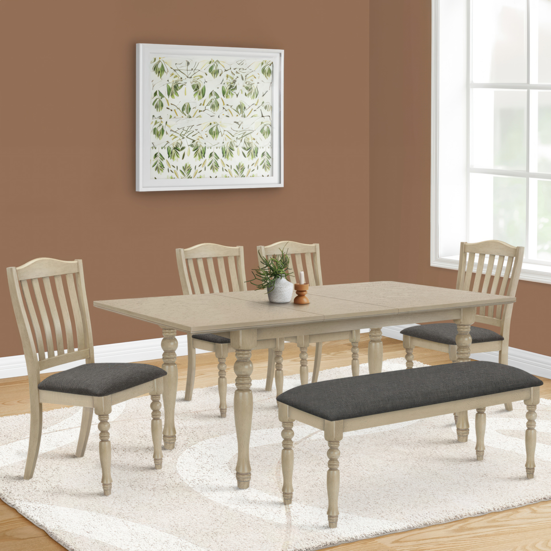 Transformez votre salle à manger en un espace élégant et fonctionnel avec cette magnifique table à manger en placage gris antique. Pouvant accommoder confortablement plusieurs personnes, cette table à la mode comprend un panneau d'extension de 18 pouces, ce qui vous donne beaucoup d'espace pour asseoir votre famille et vos amis.