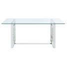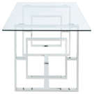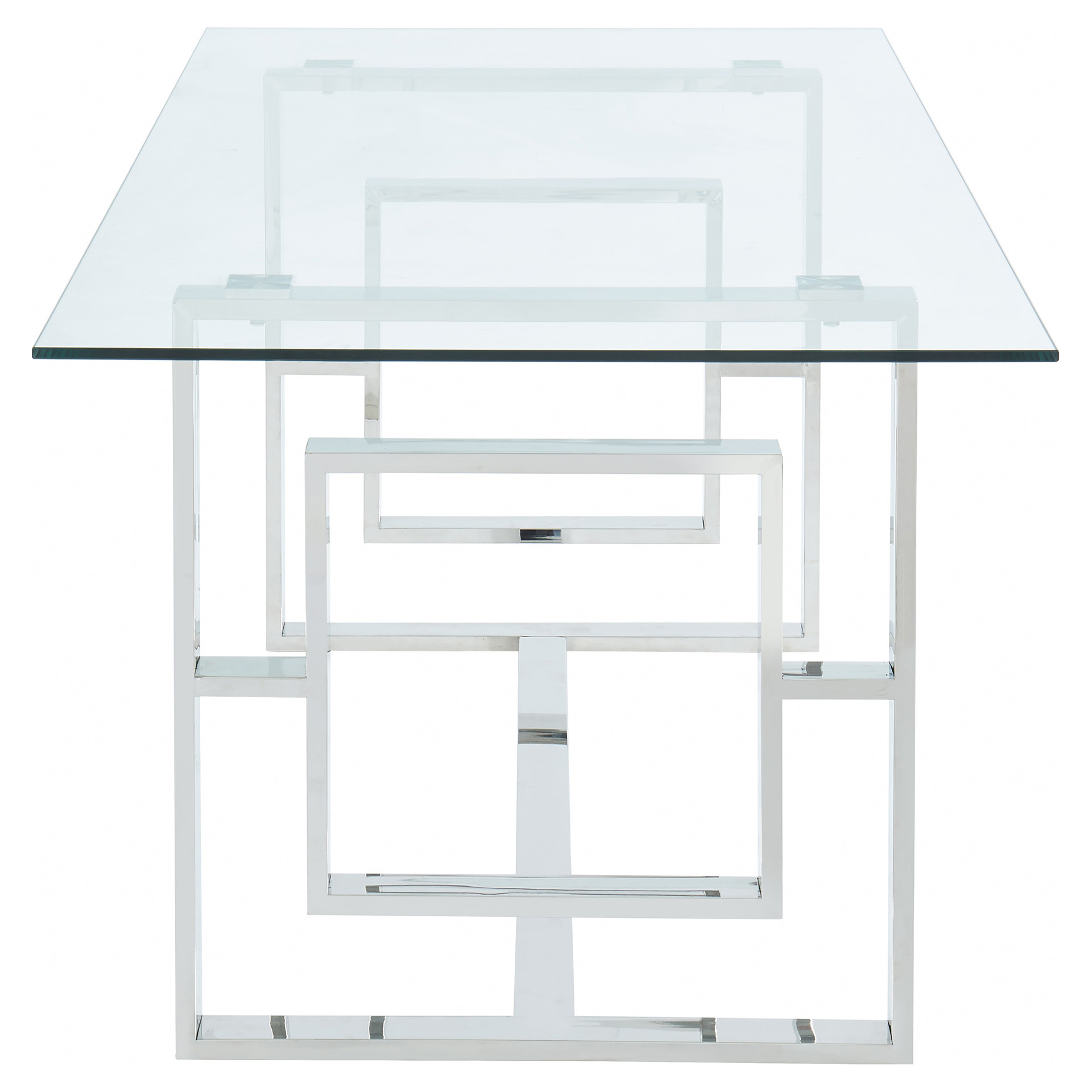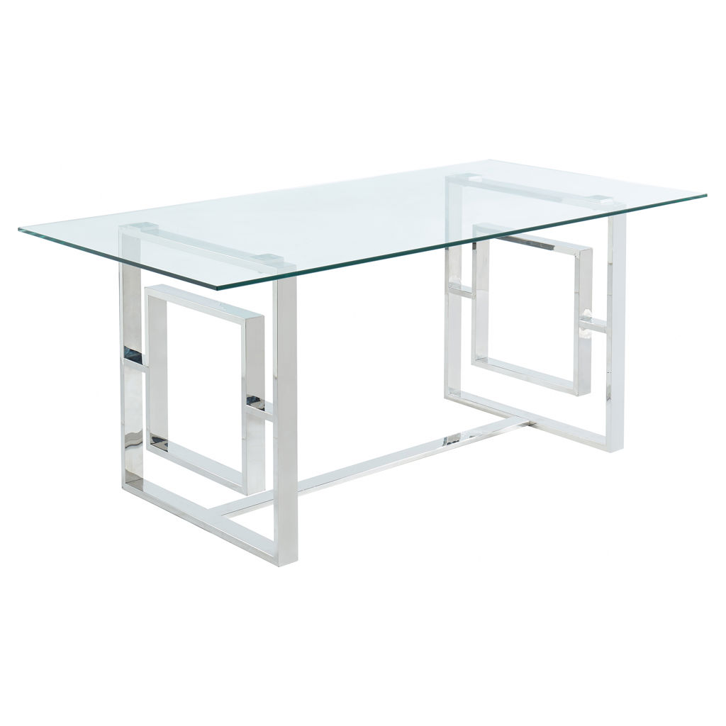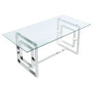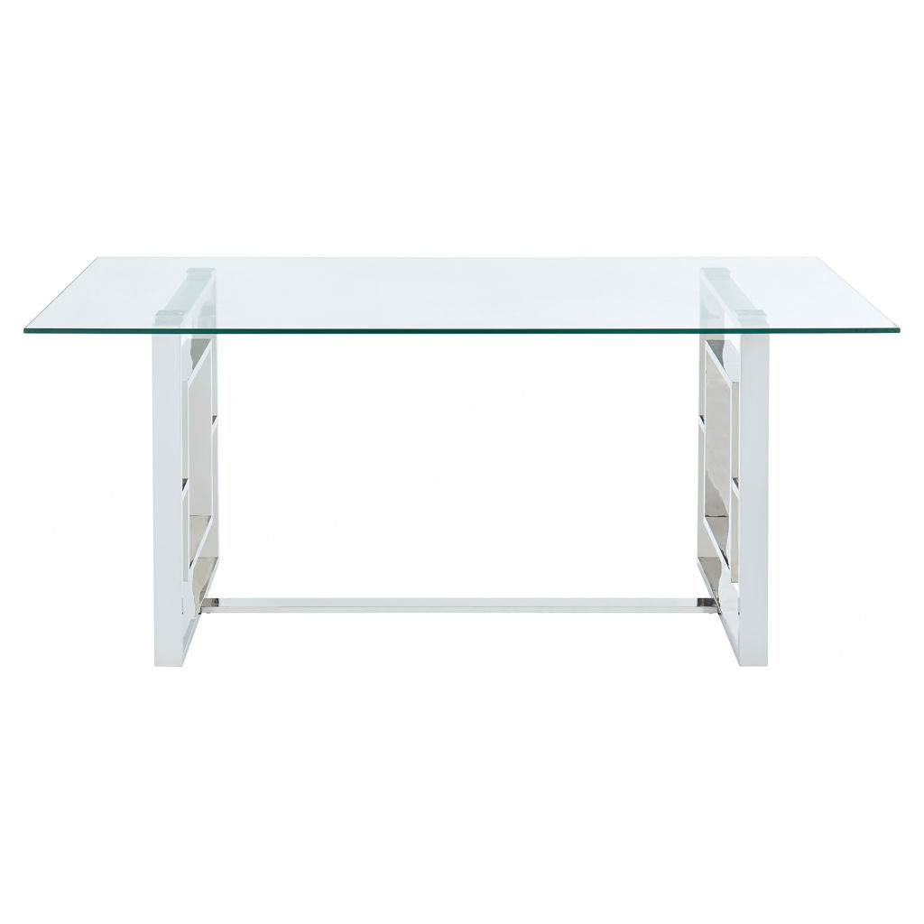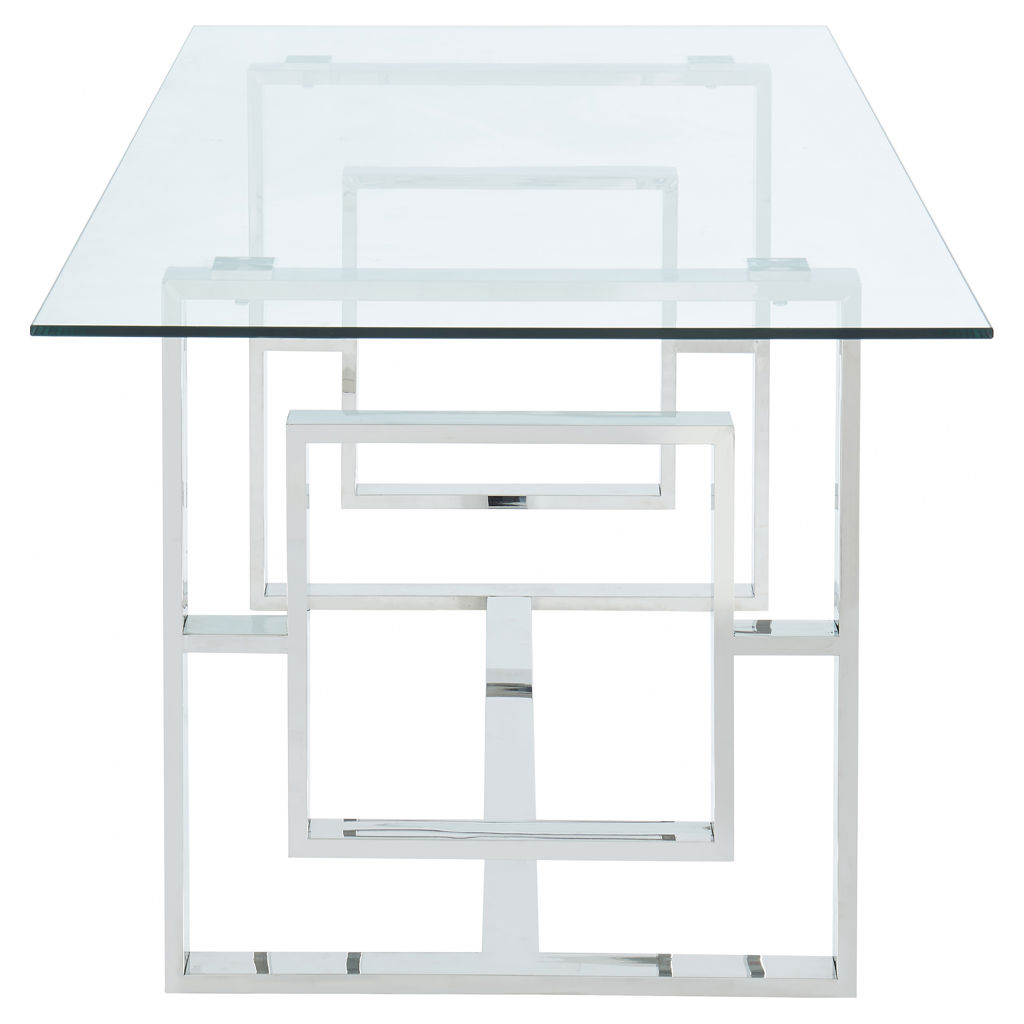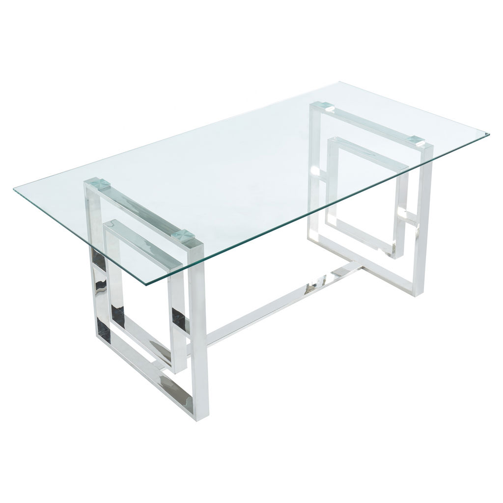 Le fini argenté sur les pattes à motifs géométriques uniques donne un brin d'éclat au look léger et aéré du dessus de table en verre.