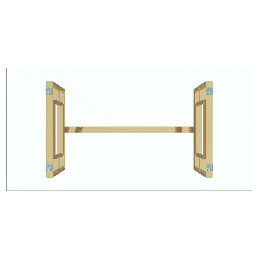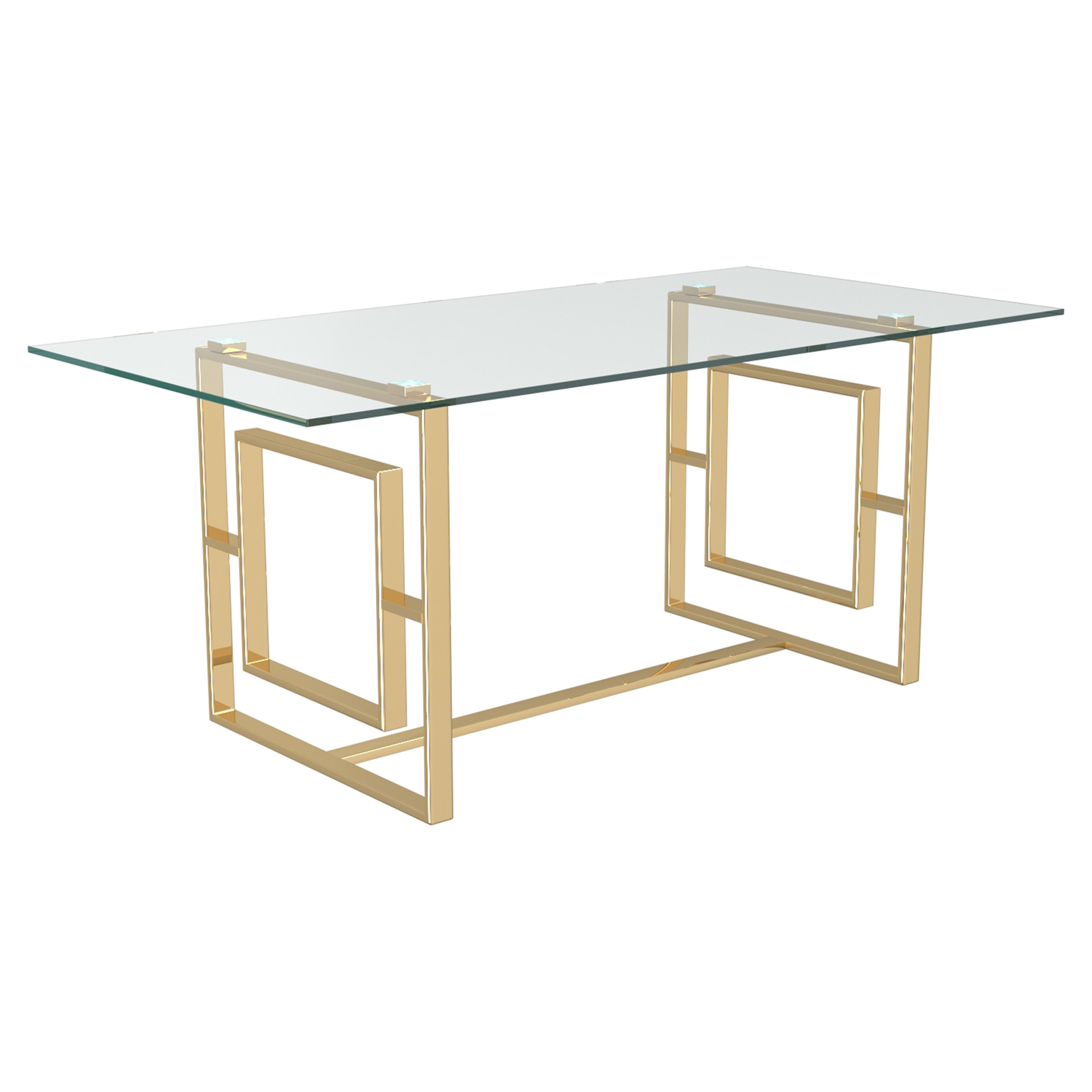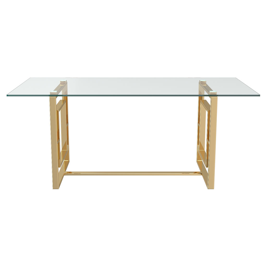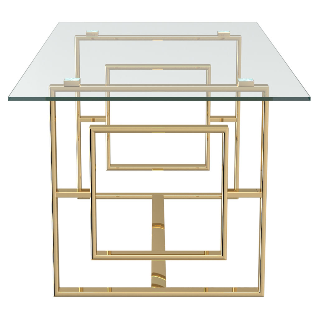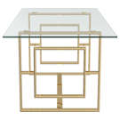 Le fini doré sur les pattes à motifs géométriques uniques donne un brin d'éclat au look léger et aéré du dessus de table en verre.