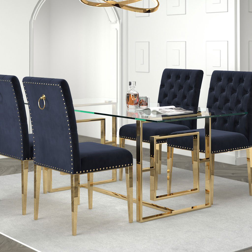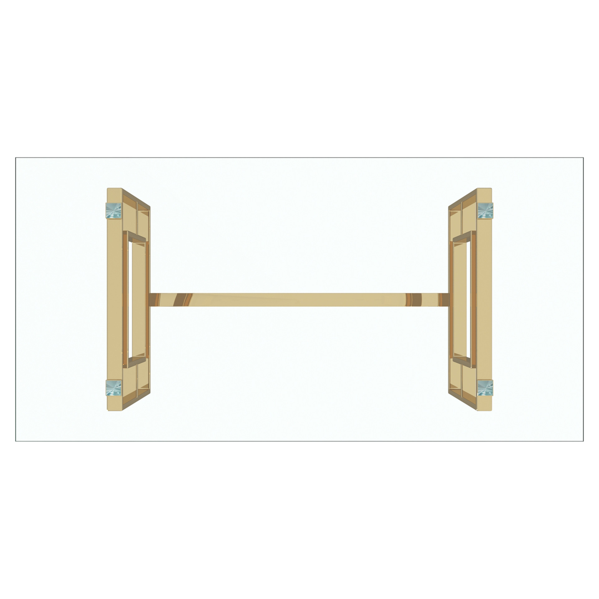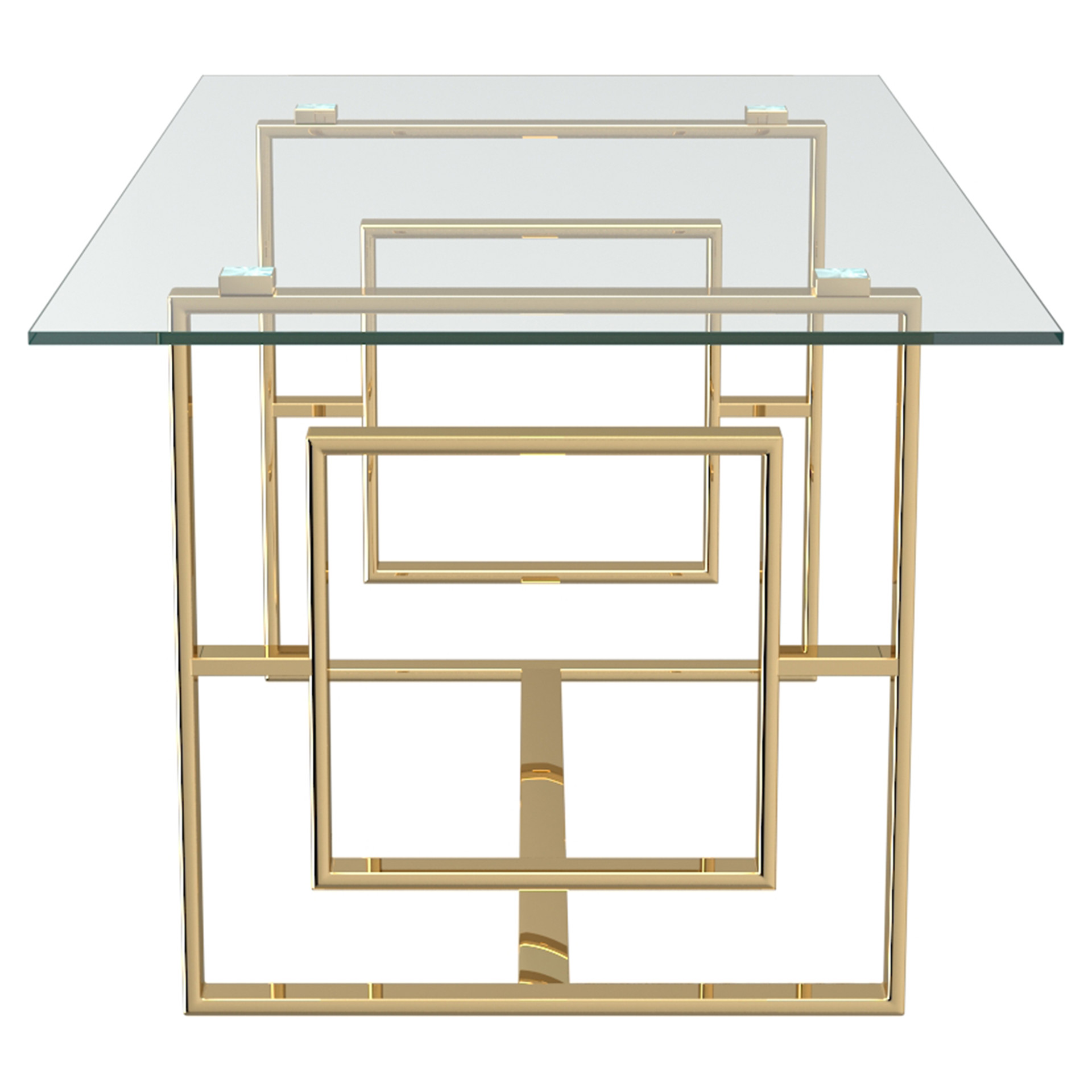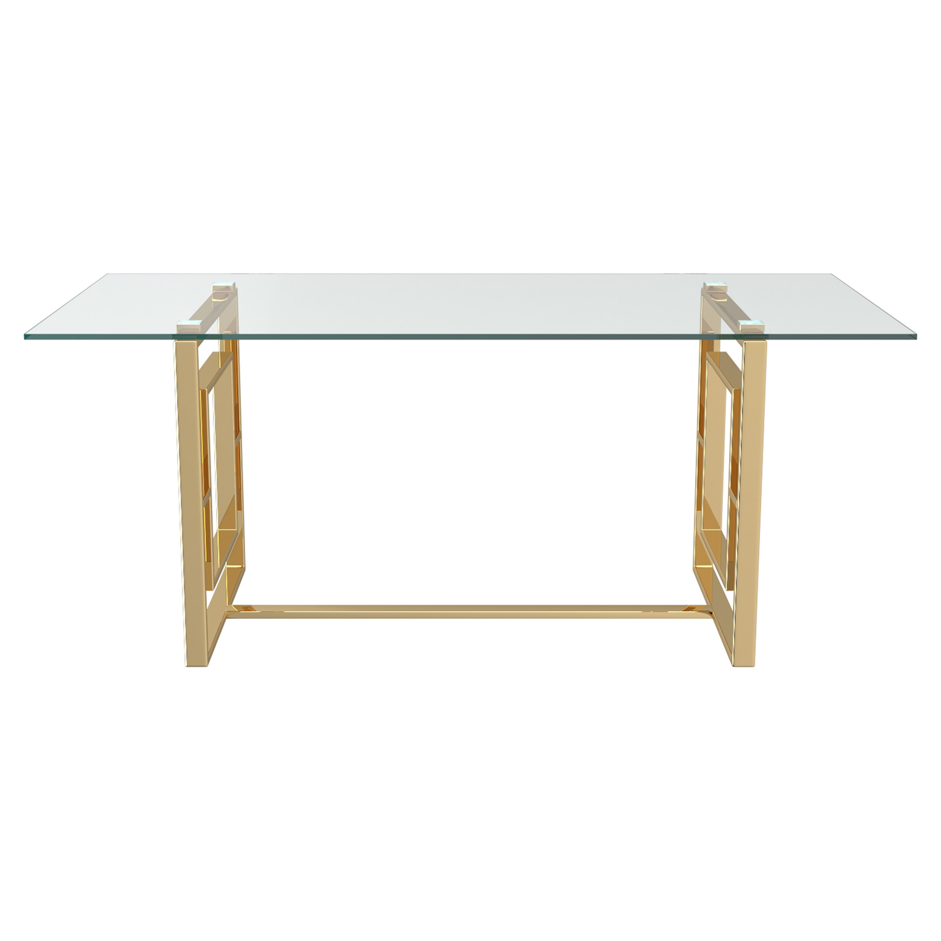 Le fini doré sur les pattes à motifs géométriques uniques donne un brin d'éclat au look léger et aéré du dessus de table en verre.