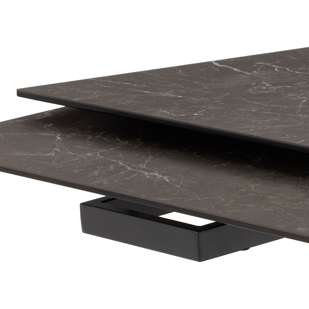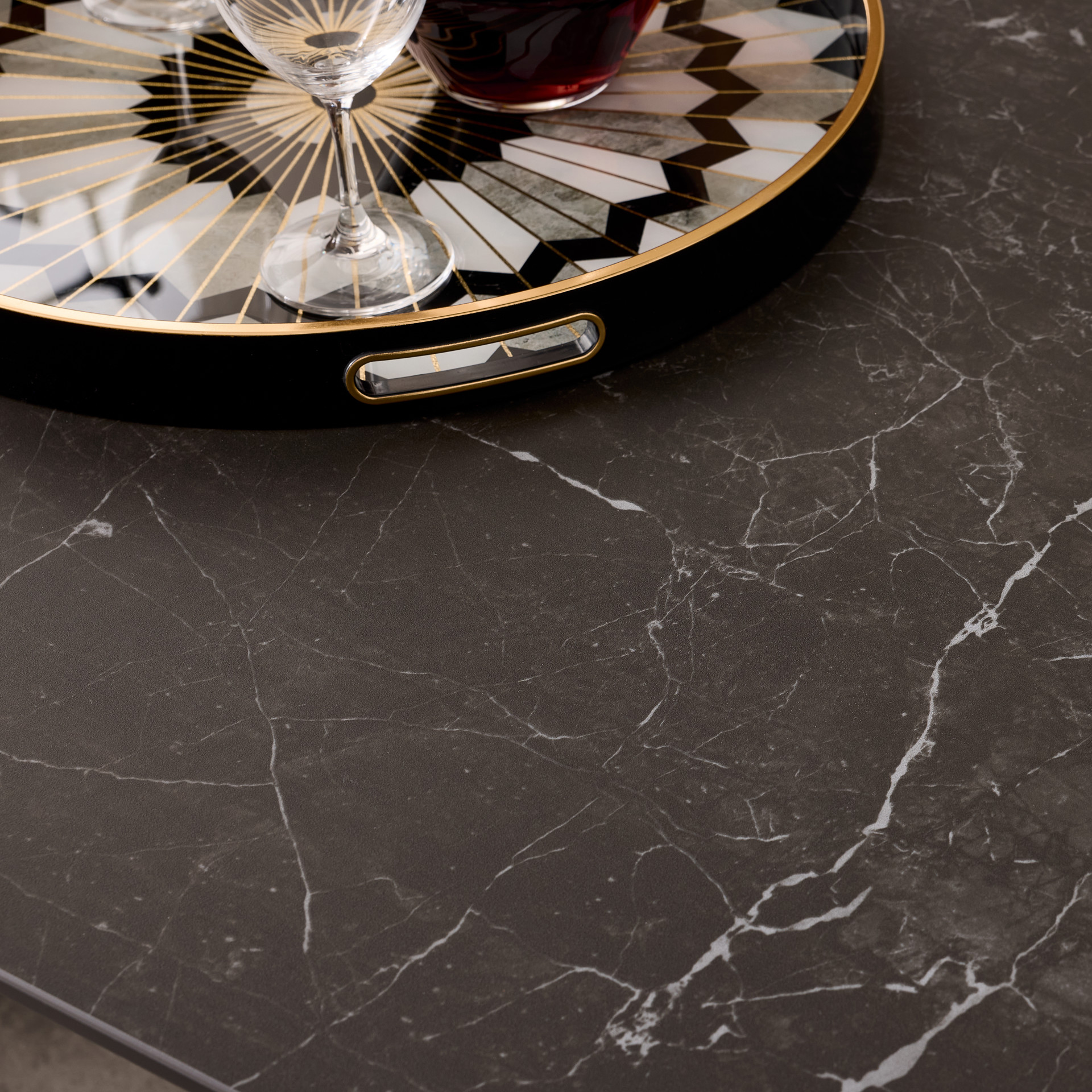 Son plateau en céramique italienne, inspiré du marbre Nero Marquina, séduit par sa texture mate et son allure sophistiquée.