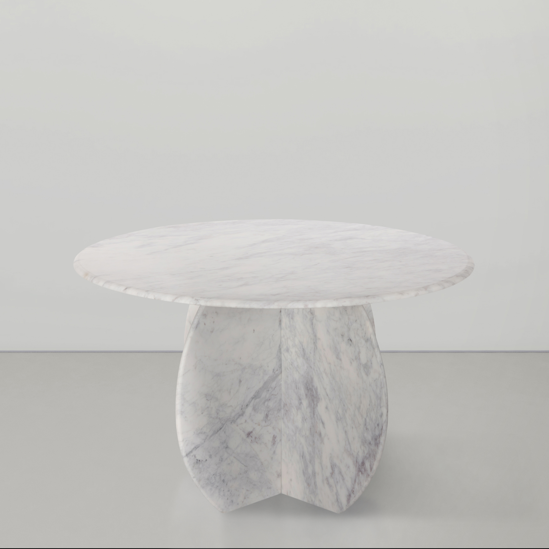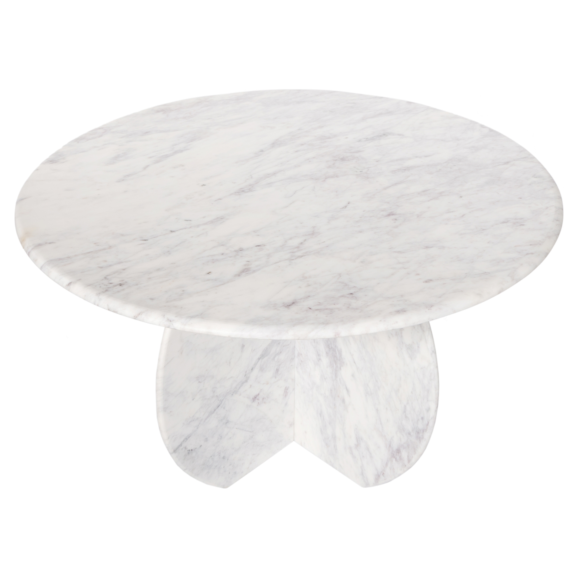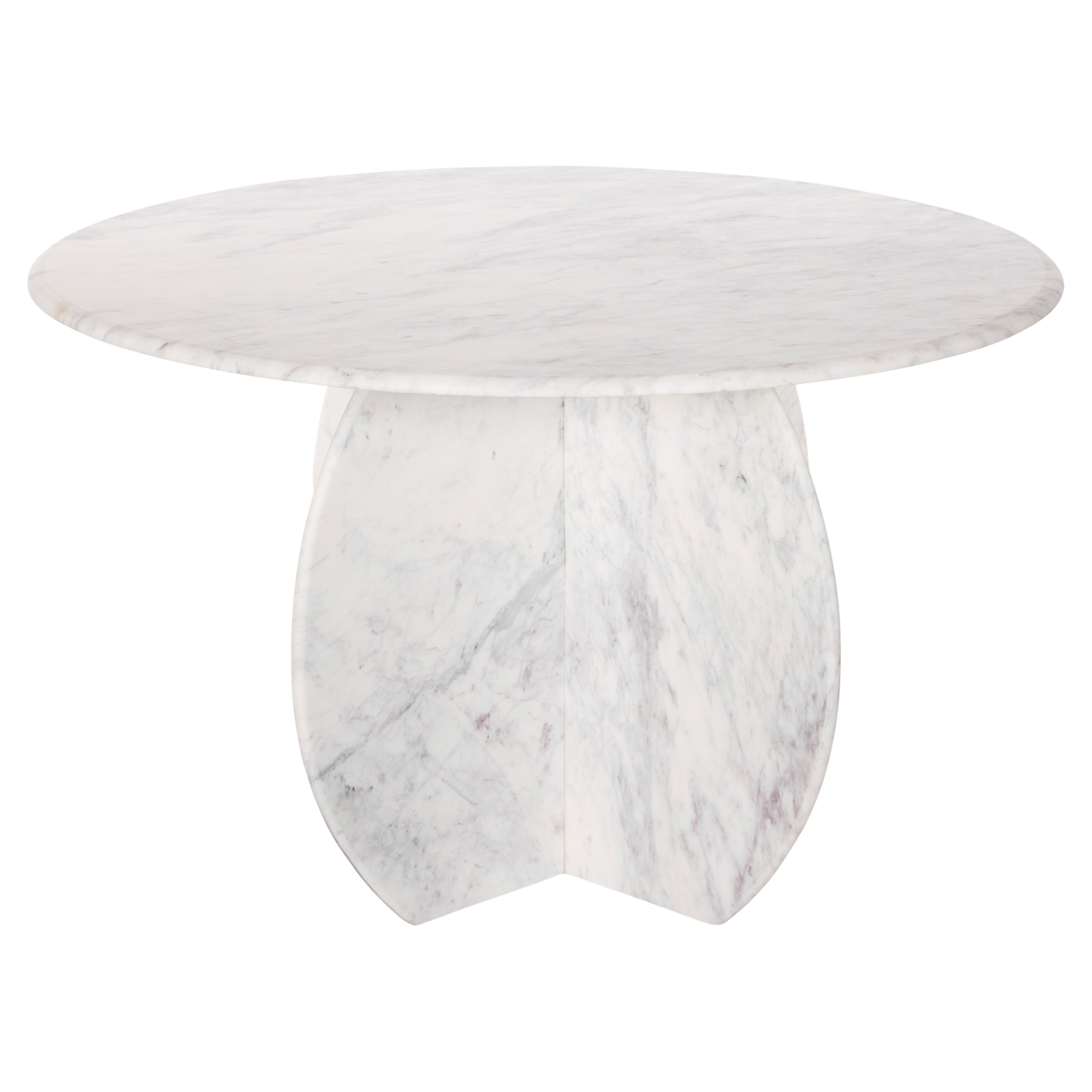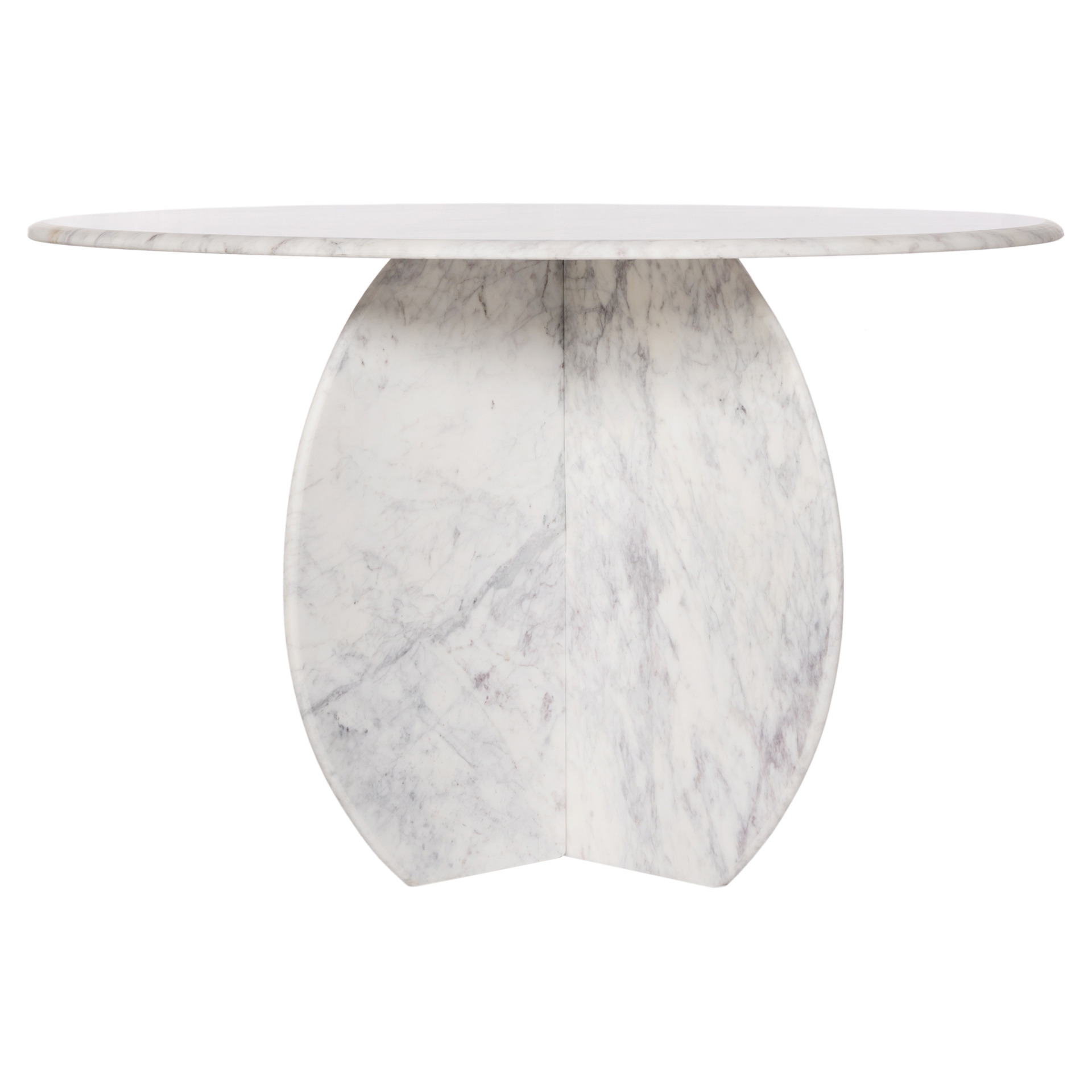 Cette table respire la sophistication depuis son marbre blanc avec des veines gris clair jusqu'à sa base de forme unique.