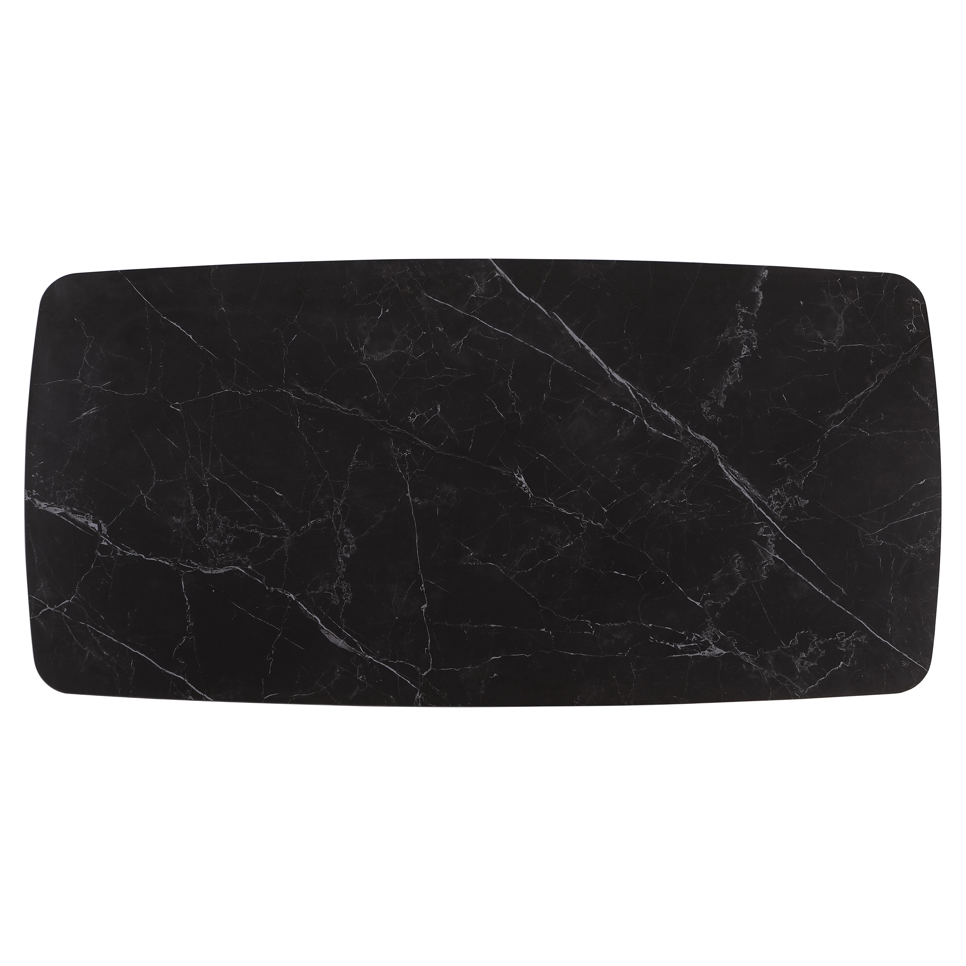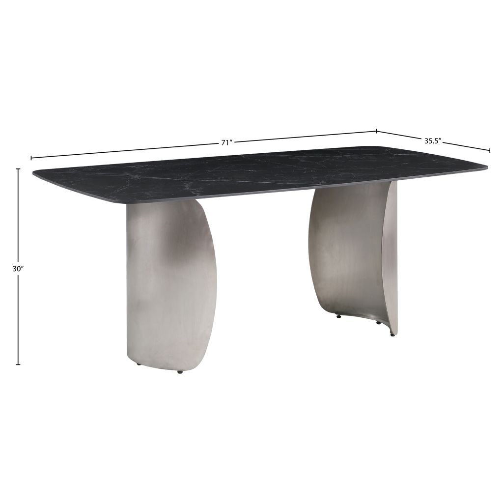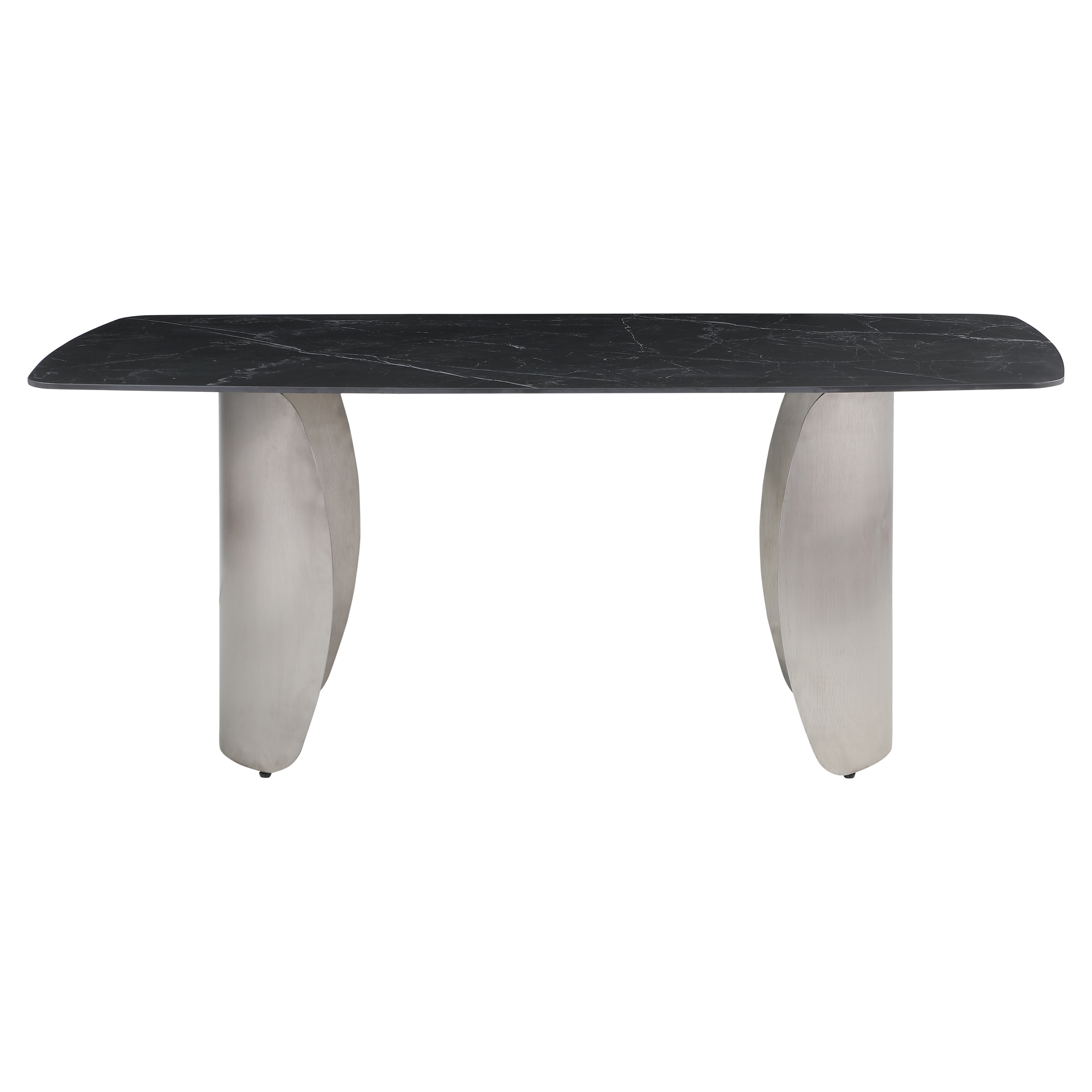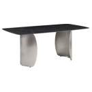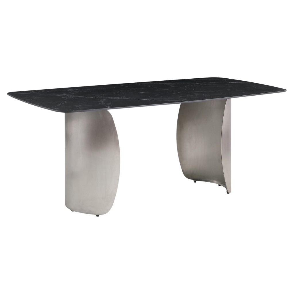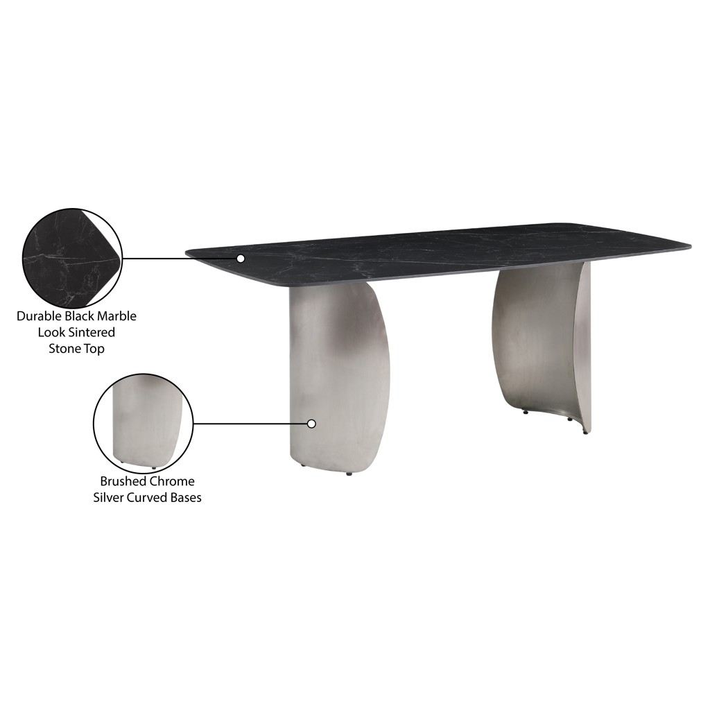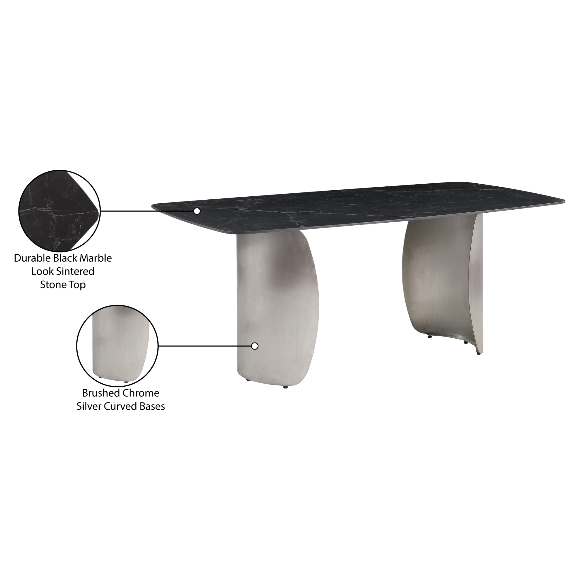 Cette belle table est à la fois une oeuvre d'art et un incontournable de la salle à manger, avec son plateau en pierre frittée d'aspect marbre noir élégant mais durable et ses bases courbes en or brossé.