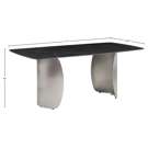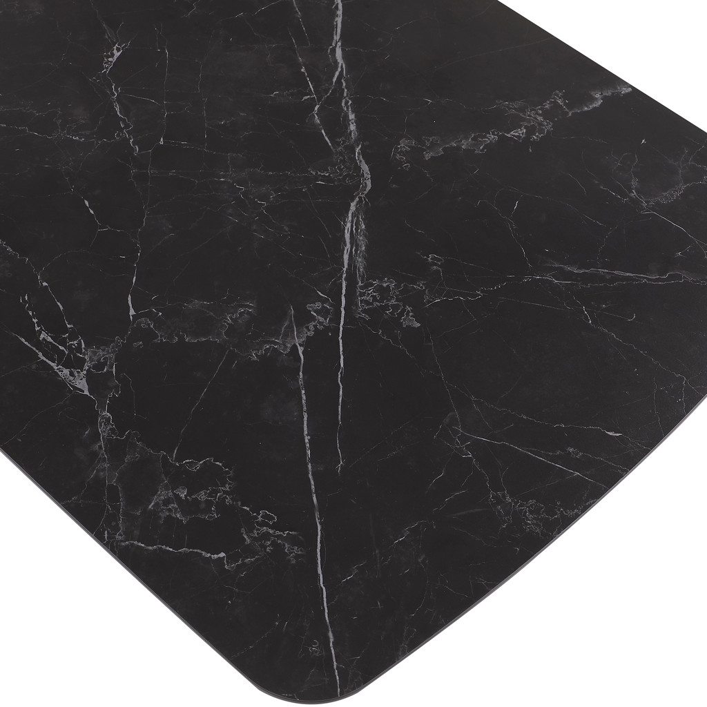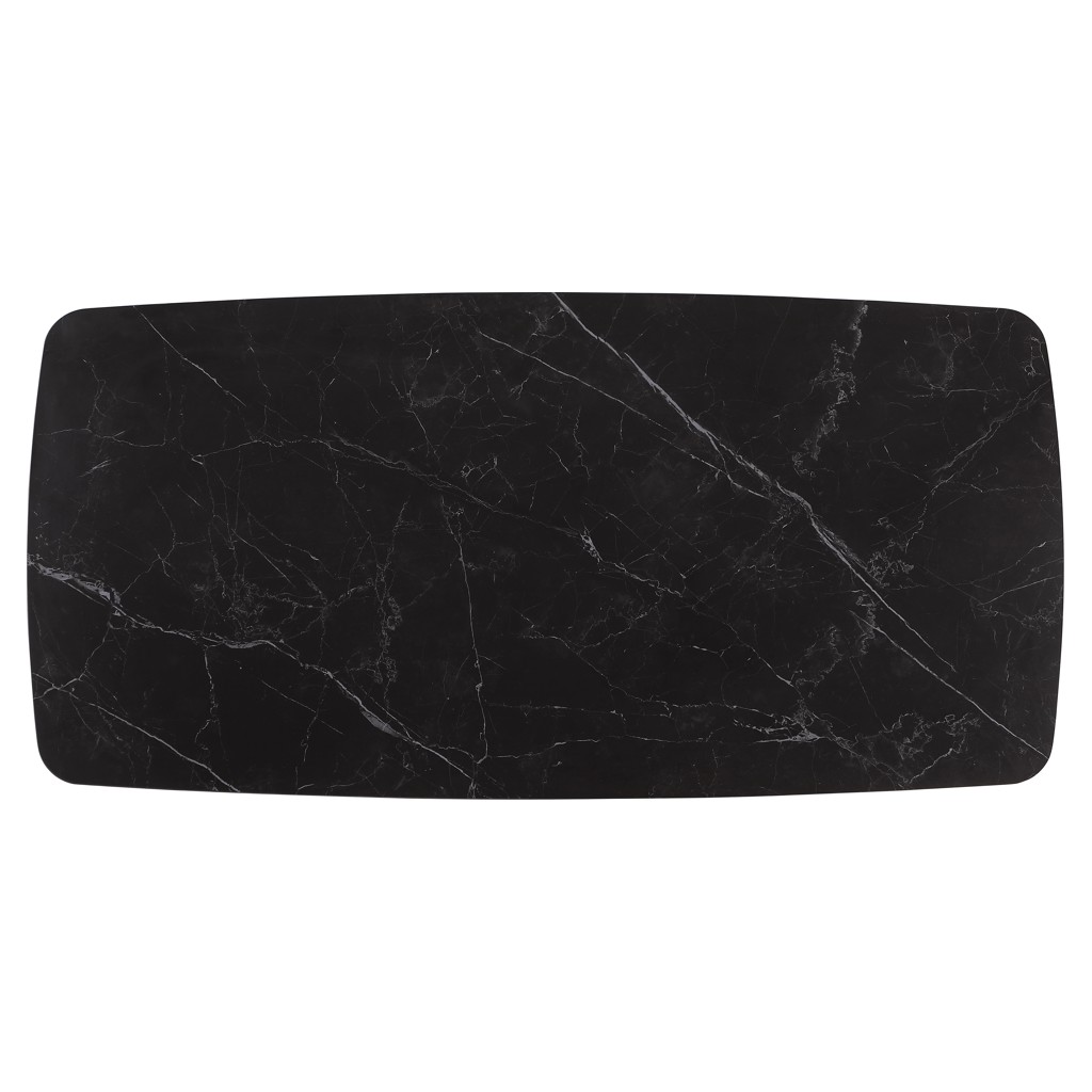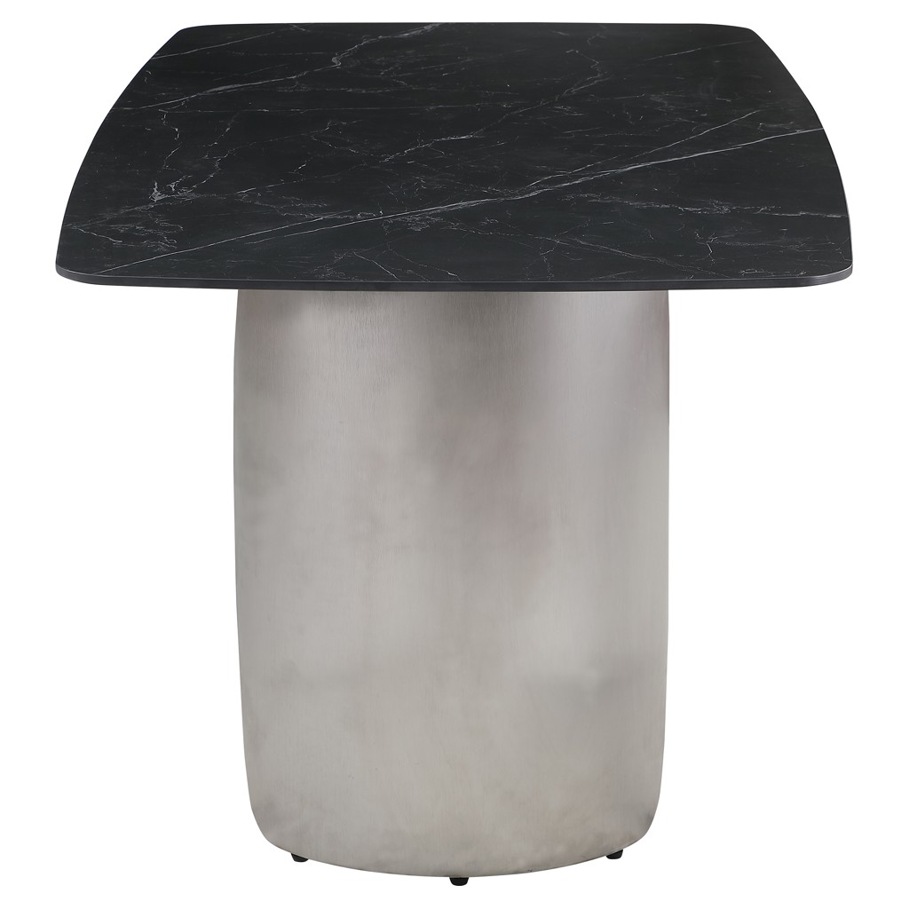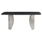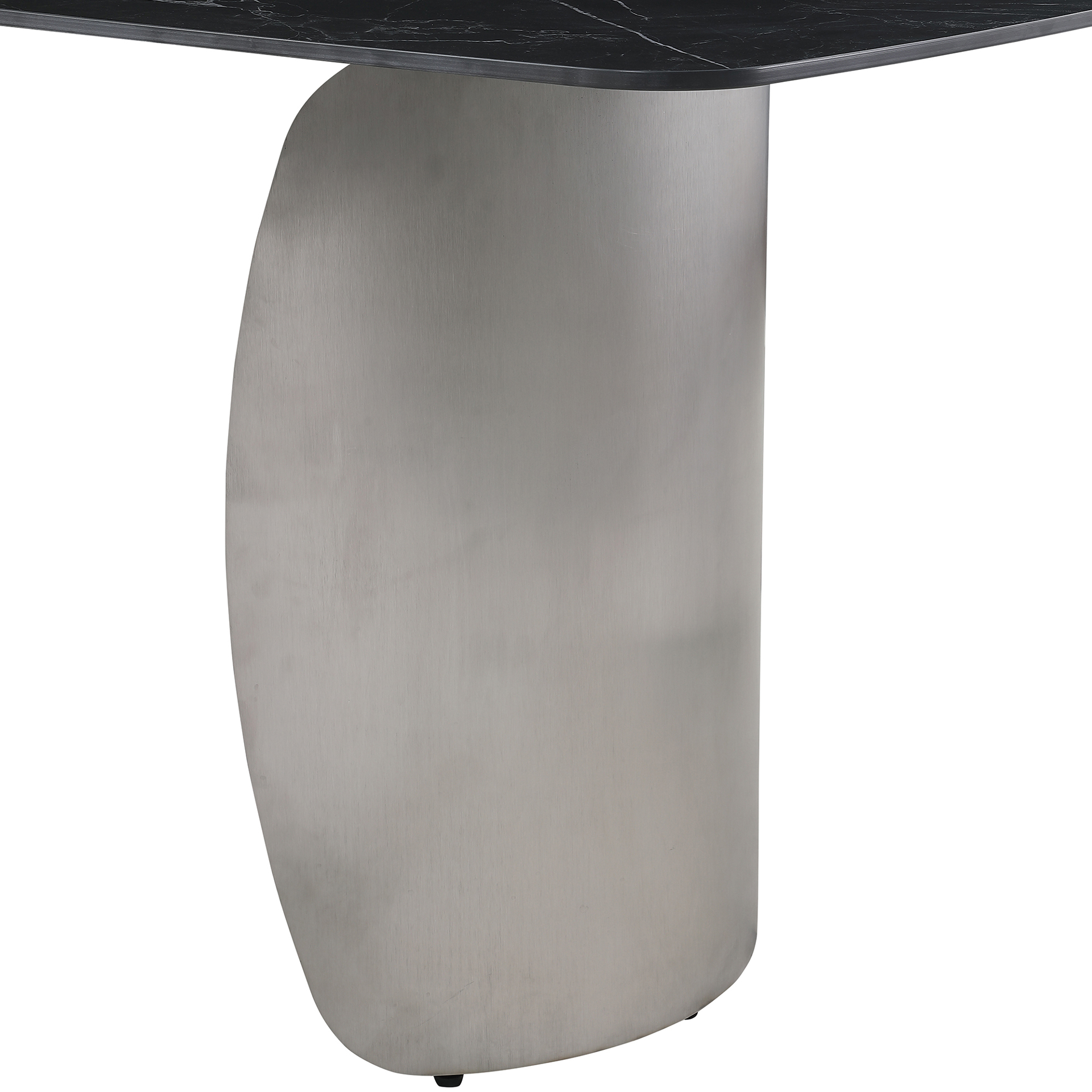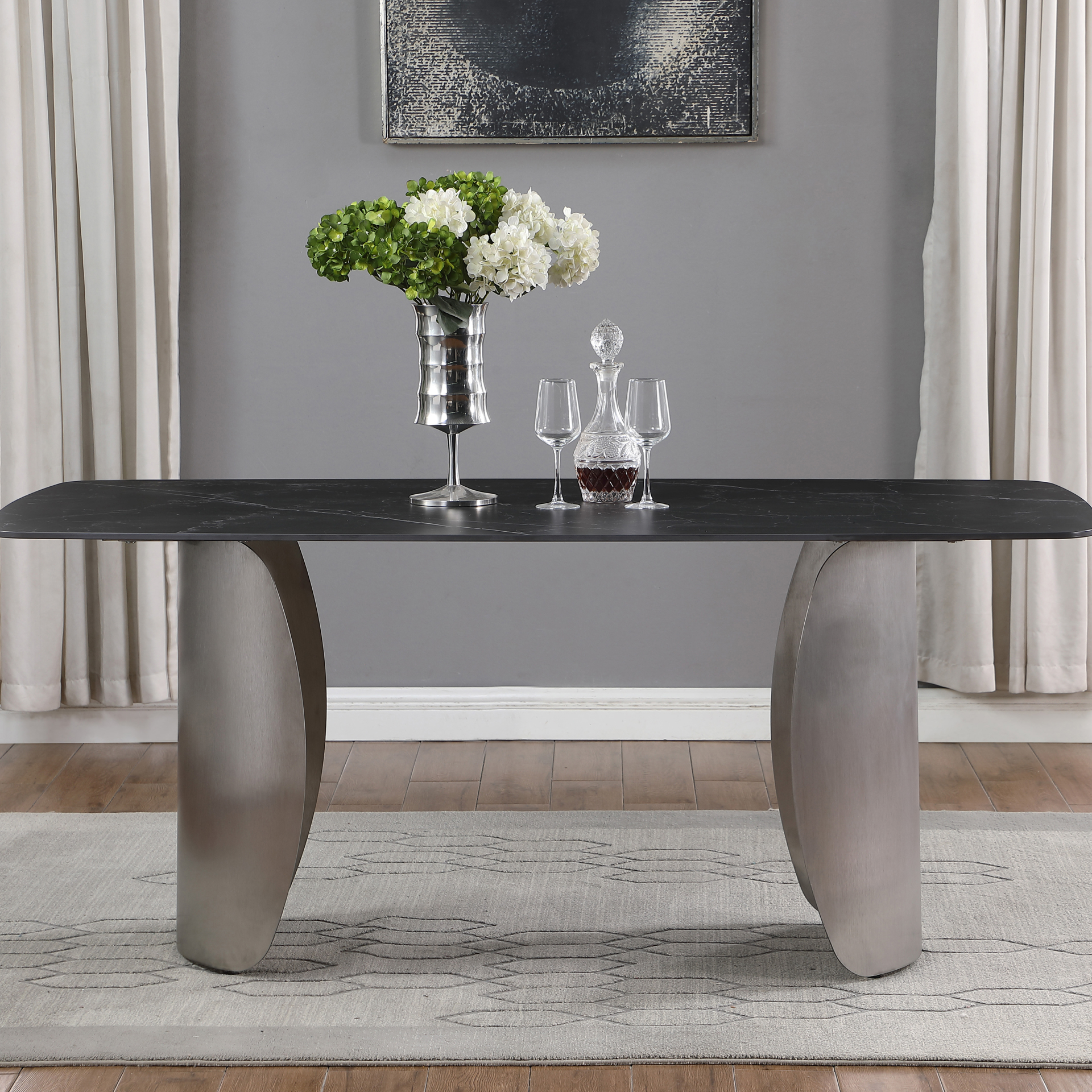Cette belle table est à la fois une oeuvre d'art et un incontournable de la salle à manger, avec son plateau en pierre frittée d'aspect marbre noir élégant mais durable et ses bases courbes en or brossé.