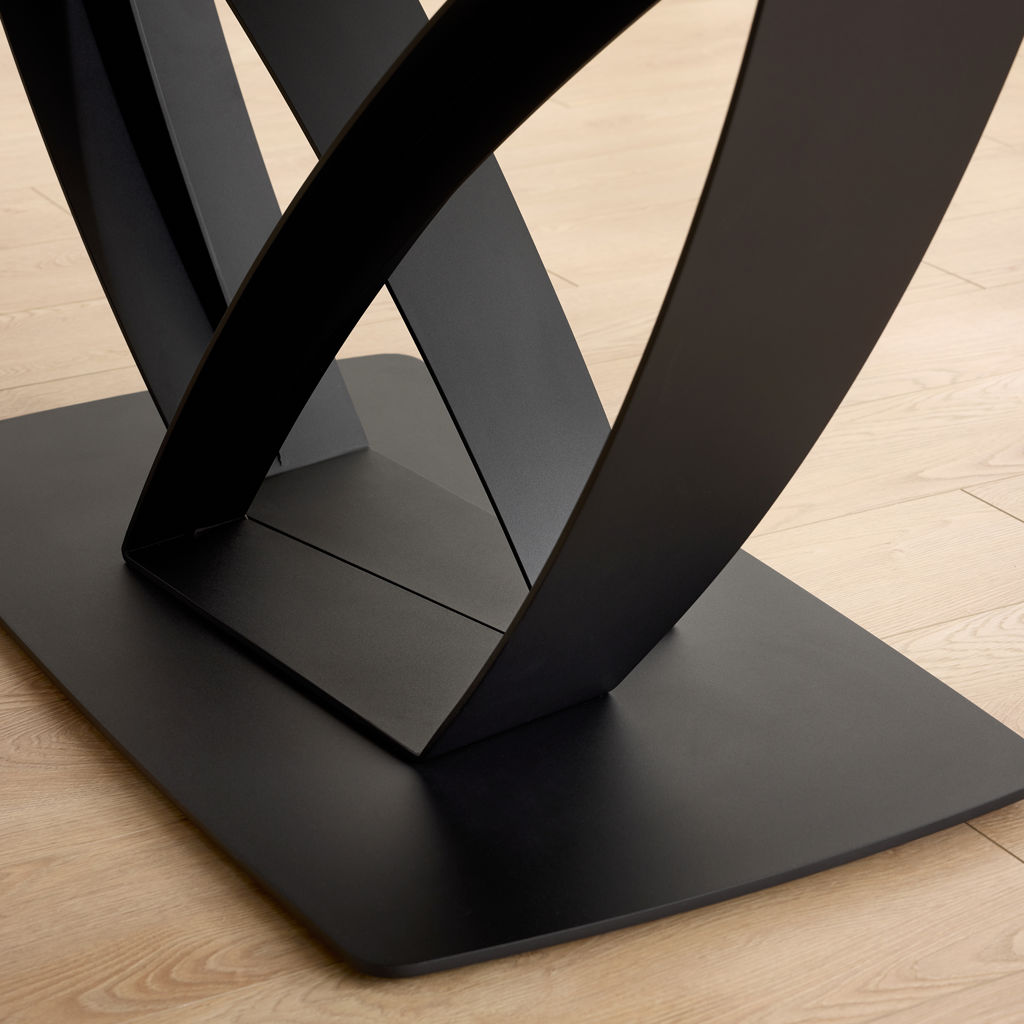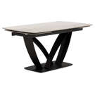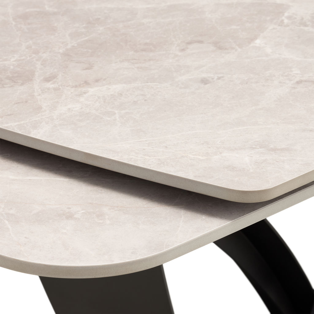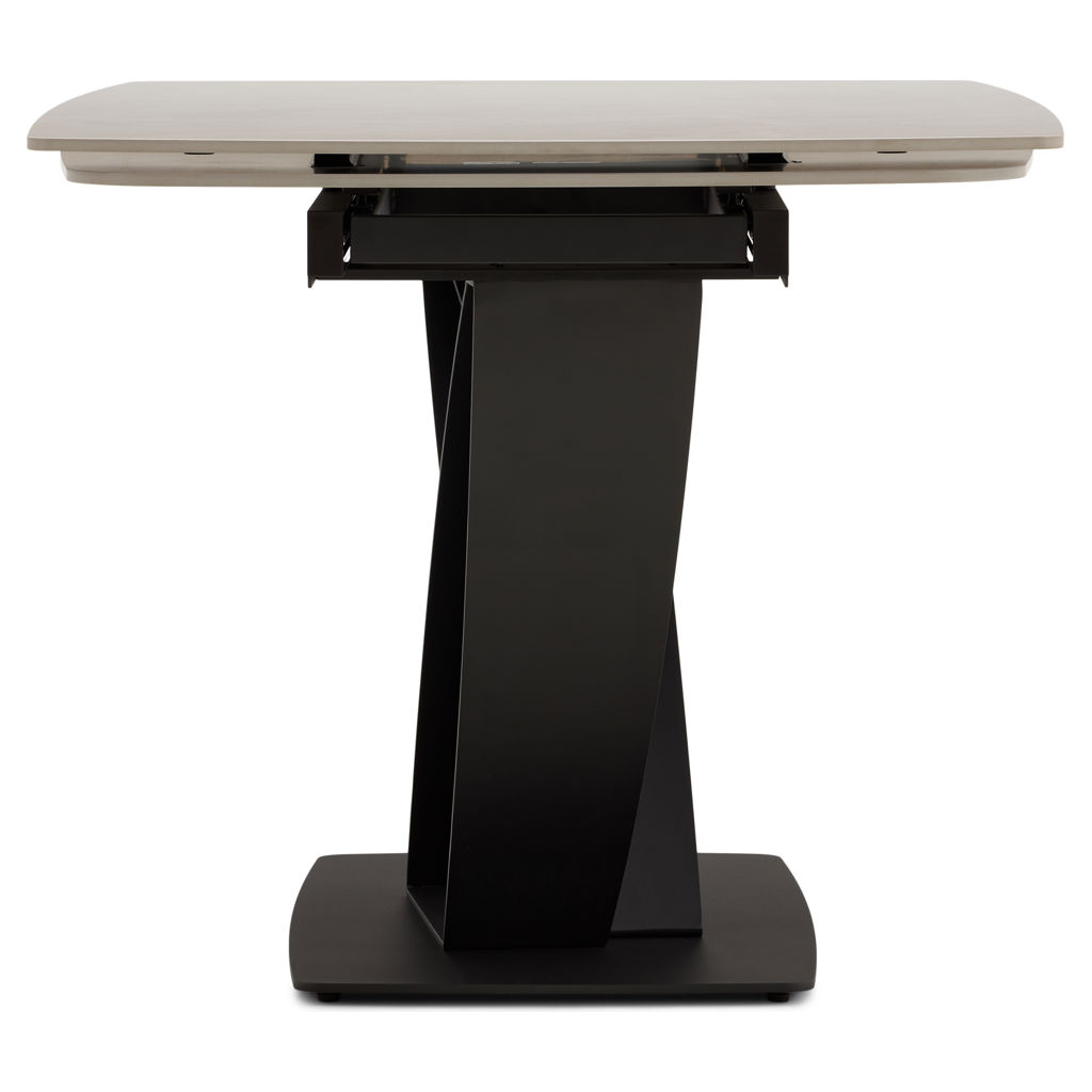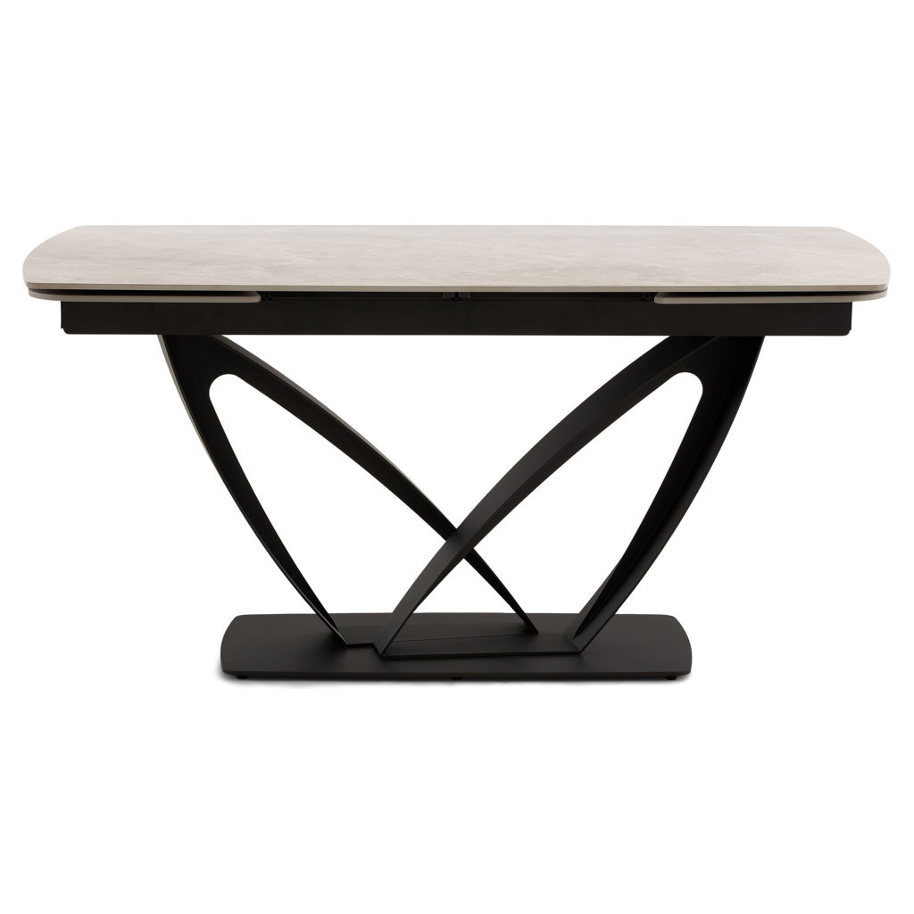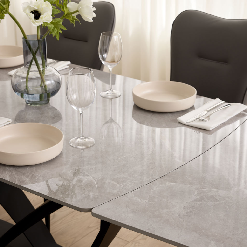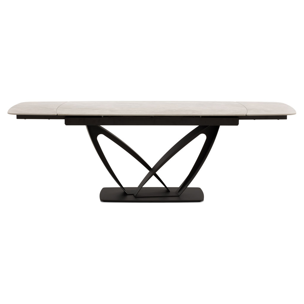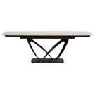 Table à manger extensible de la collection Tammy avec plateau en céramique laquée au fini marbre gris, offrant une surface à la fois élégante et résistante. Dotée de deux rallonges intégrées, elle atteint une longueur maximale de 95 pouces. Sa base sculpturale en métal noir assure stabilité et caractère, s’intégrant parfaitement à un intérieur contemporain ou sophistiqué.